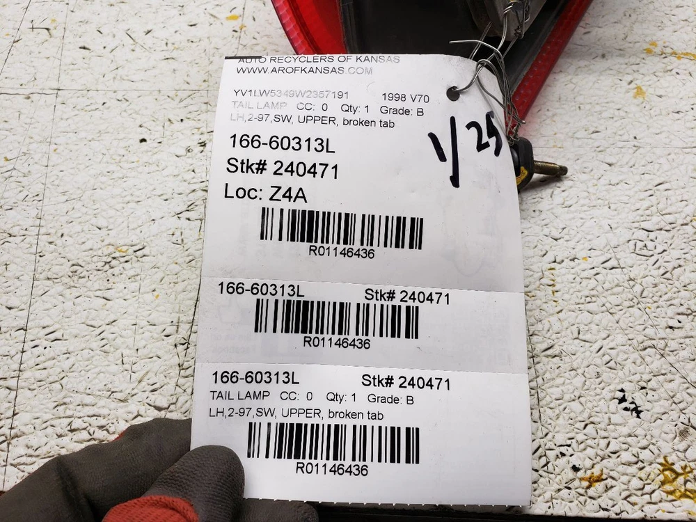 Welcome to our eBay Store! Driver Left Tail Light Station Wgn Upper Fits 98-00 VOLVO 70 SERIES 1146436 Description Please read the entire listing before bidding. Our parts are not new! We sell only recycled automotive parts! All parts are tested to the fullest means possible to ensure only the highest quality products are listed in our eBay Store. We make every effort to provide you with the best photos of the product listed. L or LH denotes drivers side. R or RH denotes passenger's side. Donor Vehicle VIN: YV1LW5349W2357191 Model: V70 Year: 1998 Mileage: 149000 (0 = not available or unknown) Stock Number: 240471 Store Number: 1 Part Detail Part Grade: B Part Category: U Part Placement: Driver/Left Notes: LH,2-97,SW, UPPER, broken tab This part will fit these makes and models with these options VOLVO 70 SERIES 98-00 SW, upper, L. WARRANTY / GUARANTEE Most parts we sell through eBay Motors come with a 30-day money back guarantee unless otherwise stated. The 30 day period starts when you take possession of the part. No labor warranty is provided. In the event a part sold with a warranty fails to operate within the warranty period we will replace the part(s) with a functionally equivalent part or refund the part purchase price, at our option. To return an item you must contact us via eBay Message within the 30 day period to obtain a RMA number (return material authorization). Original shipping charges and return shipping charges are not refunded. Once you obtain an RMA number, ship the item back to Auto Recyclers of Kansas, 1200 E Macarthur, Wichita, KS 67216 along with the RMA number. SHIPPING NOTES ABOUT US HELP Auto Recyclers of Kansas ships to US addresses within the 48 states only via UPS ground. International orders are sent via ebay's Global Shipping Program . Pick up at our facilities is available. Please message us prior to your purchase to arrange pick up. Items will be shipped within 1-2 days of purchase. Please allow up to 10 days for delivery unless item falls under ebay's Guaranteed Delivery p rogram. Most areas in the US are within 5 days. If an item arrives damaged, please contact us via eBay Message within 24 hours for instructions. If you have a question about a part please contact us BEFORE purchasing. Our main contact method is by eBay Messages. We try to answer all messages within 24 hours. If we are unable to answer your questions before the listing ends the item will be re-listed again soon for you to purchase. Core Charge. Core is an acronym for ‘Cash On Return’. A core charge is sometimes applied to rebuildable parts such as engines or alternators that can be redeemed for a portion of their original price. If the part you are purchasing has a core charge applied, it will be noted in the description. Parts Grading. A standard code system is used to communicate the condition and quality of a part between automotive recyclers, automotive repair shops, and insurers. Knowing how these codes are used will help you understand whether the part meets your expectations before you buy it and what you can expect from the part when you receive it. A Grade - The highest quality part. It is of low miles and/or exceptional condition for its age. B Grade - The second level quality part. It is of average miles and normal condition for its age. C Grade - The third level quality part. It has high miles and/or light damage. No Grade - A part that has not yet been graded.
