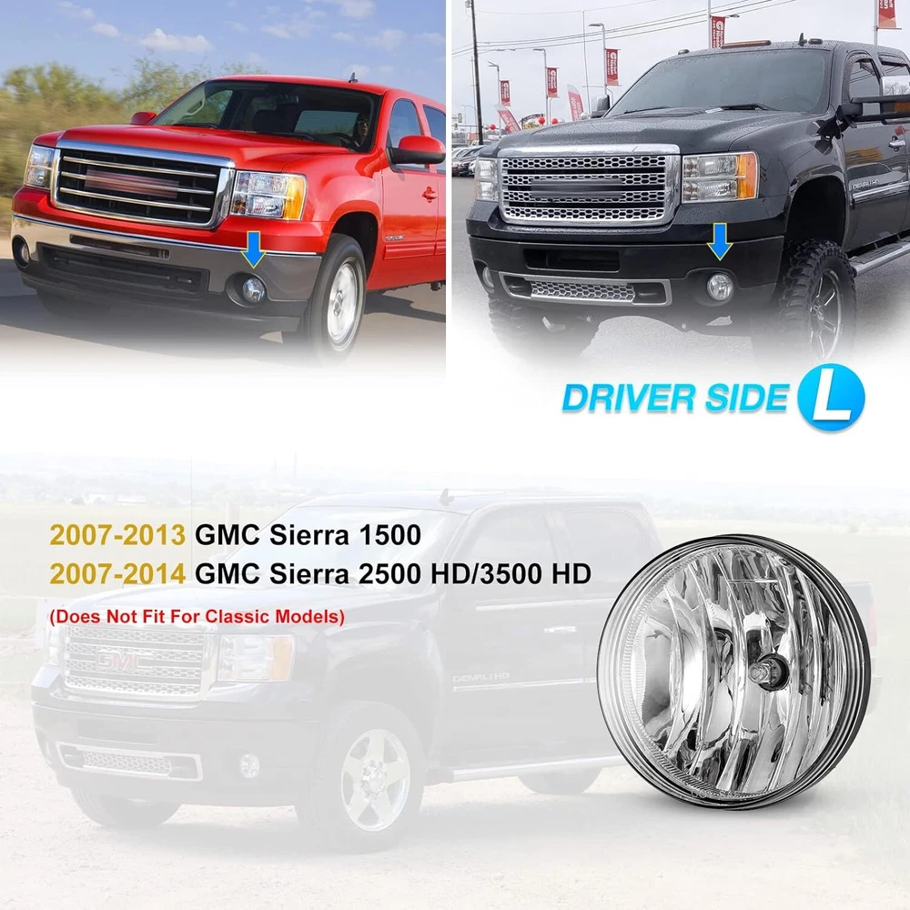 Head Lights Tail Lights Fog Lights Turn Signal Bumper Fender Flare Inner Fender Hubcaps Refrigerator Other Items for sale Head Lights Tail Lights Fog Lights Turn Signal Bumper Fender Flare Inner Fender Liners Portable Refrigerator Driver Side Fog Light For 07-13 GMC Sierra 1500 2500 Left Bumper Lamp Clear Len Specification: Bulb: PS(5202) 12V 24W Wiring Harness: Not Included Color Finish: Black housing w/clear lens/ chrome reflector Replaces Original (OE) Part #: L: 195914001; 25866495 Partslink: L: GM2592161 Application: 2007-2013 GMC Sierra 1500 2007-2014 GMC Sierra 2500HD/3500HD ( Does Not Fit For Classic Models ) Package Includes: 1 Fog Lamp with bulb included. Note: All of the items in our shop will come to you with the tracking number. Payment Shipping Return About us Contact us Payment Appreciated for the prompt payment, Contact us if bid by mistake, system open unpaid item automatically. Payment must be complete within 3 days from the date you purchase or after the end of auction. Items unpaid within 3 days of the auction end will be forfeited. We reserve the right of cancel the order and re-selling the items. Shipping All shipment will ship by UPS or USPS . All items will be ship within 1 working days , and we will ship out all orders as soon as possible after payment verified, please allow up to 1-4 business days for delivery. CANADA & International customers please note: your government might charge a duty tax (brokerage fees). We do not responsible for any custom duty or import tax. Why Choose the US Stock? 1. Us Local Shipping, No Extra Customs Cost to the US. 2. Fast Delivery: 1-4 Working days Delivery. 3. Best After-Sales Service!!! Return The buyer is responsible for all return shipping including a result of customer error or defective item. 1) If you received an incorrect, damaged, defective, or item not as described, contact us for full refund or replacement on our cost. 2) If you want to return the item, please contact us within 60 days after package received. Return products must also be in its original condition: including box, packaging and all other accessories. About us We are the best auto parts, we have been pursuing excellence, continuous exploration as the slogan, let customer satisfaction is our purpose! We adhere to the United States local delivery, one year warranty! Welcome! Contact us How Should You Contact us? Please Read The Item Description And See if The item Fits Your Vehicle Exactly. If You Found Any questions, Feel Free to email us by "Ask a question" Our Office Hours Are Monday - Friday 8:00am - 5:00pm PST / 11:00am - 8:000pm ET, We Do Not Answer Any E-Mails On Weekend, And We Will Reply All E-Mails In The Order It Was Receive. All E-Mail Take Us Around 24 Hours To Respond To Any E-Mail. We Are Close During The Weekends And We Do Not Answer Any E-Mails During That Time.
