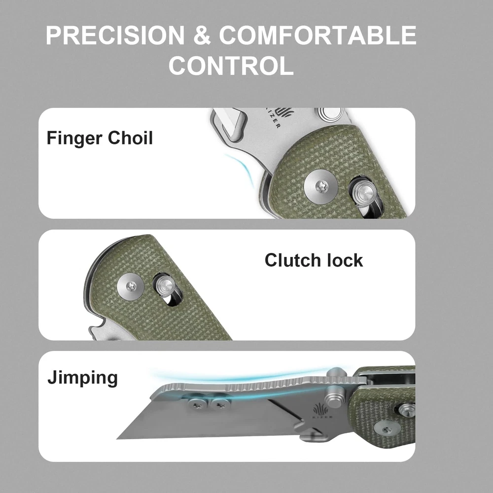 Specifications Model: Drop Bear Model Number: V3619JM1 Overall Length: 6 .69" / 170.0mm Designer: Azo Blade Length: 2.74 "/69.6mm Blade Material: SK5 & 5Cr15 Handle Length: 3.95 "/ 100.4 mm Handle Material: Micarta Weight: 2.92 oz/ 82.8g Color: Olive Green Double-anchor Blade Security: Dual screws with extended threading provide 2x contact surface versus standard designs. CNC-machined ensures Drop Bear utility knife blade stability during heavy-duty cutting tasks like cardboard processing. Small Tools, Great Utility: Streamlined handle of folding utility knife conceals stainless steel tweezers and toothpick. Quick-access slots maintain clean aesthetics while providing essential tools for daily needs like splinter removal or precision handling. Style Your EDC, Express Personality: Drop Bear box cutter knife offers a choice of PEI(ultra-lightweight), acrylic(vibrant colors), micarta(textured grip), or G10(durable composite). Different materials and finishes allow pocket knife to adapt to urban/outdoor scenarios. Your EDC becomes a style statement. Patented Clutch-Lock Safety: Drop Bear edc utility knife features clutch lock that keeps fingers clear of blade path during disengagement. Smooth ball-bearing pivot enables effortless one-handed operation. Tested enough cycles for reliable performance. Ergonomic Safety Control: The handle of pocket utility knife accommodates full-hand grip. Rounded edges prevent hotspots during prolonged use. Finger choil and jimping work synergistically to enhance control when trimming materials like leather or plastic sheets.