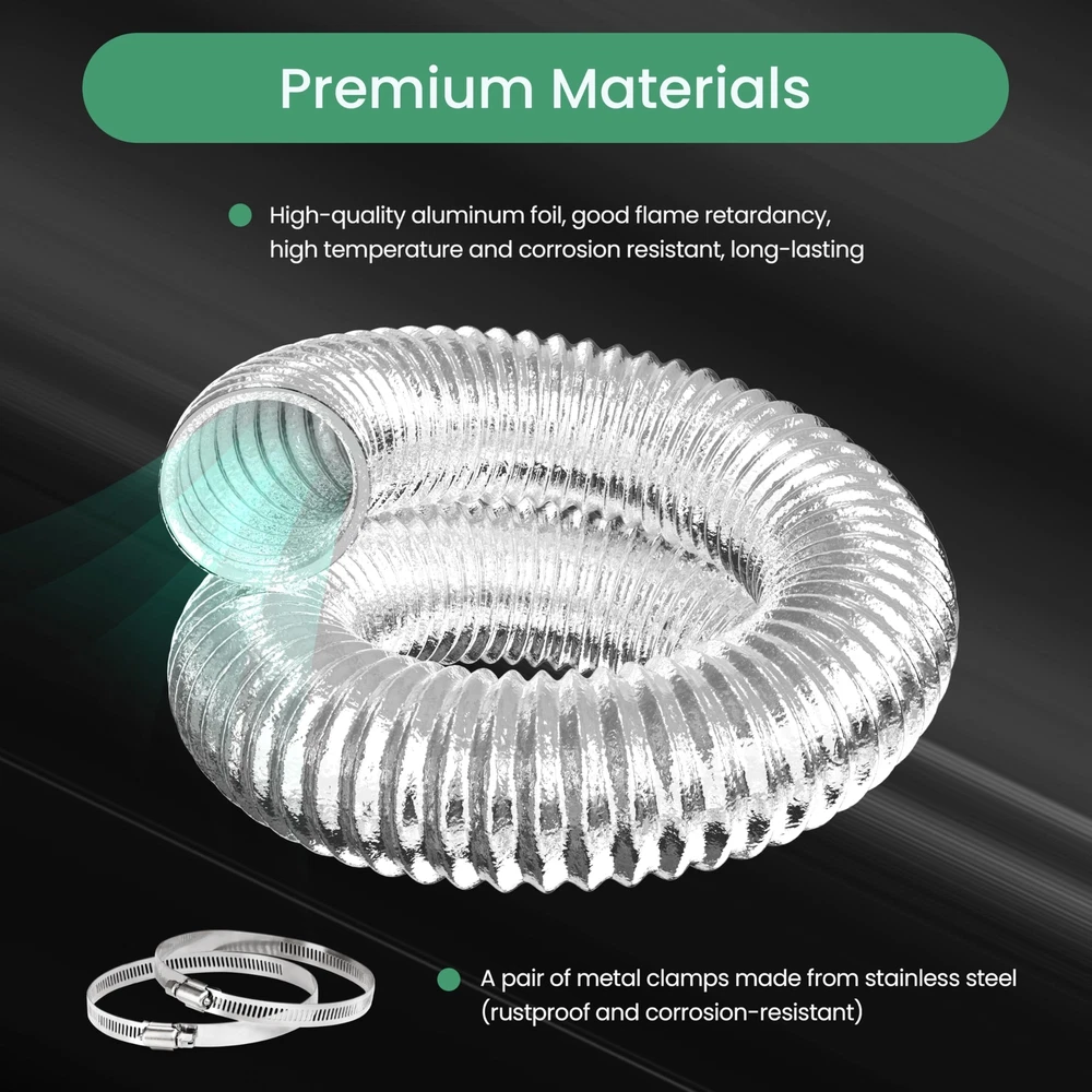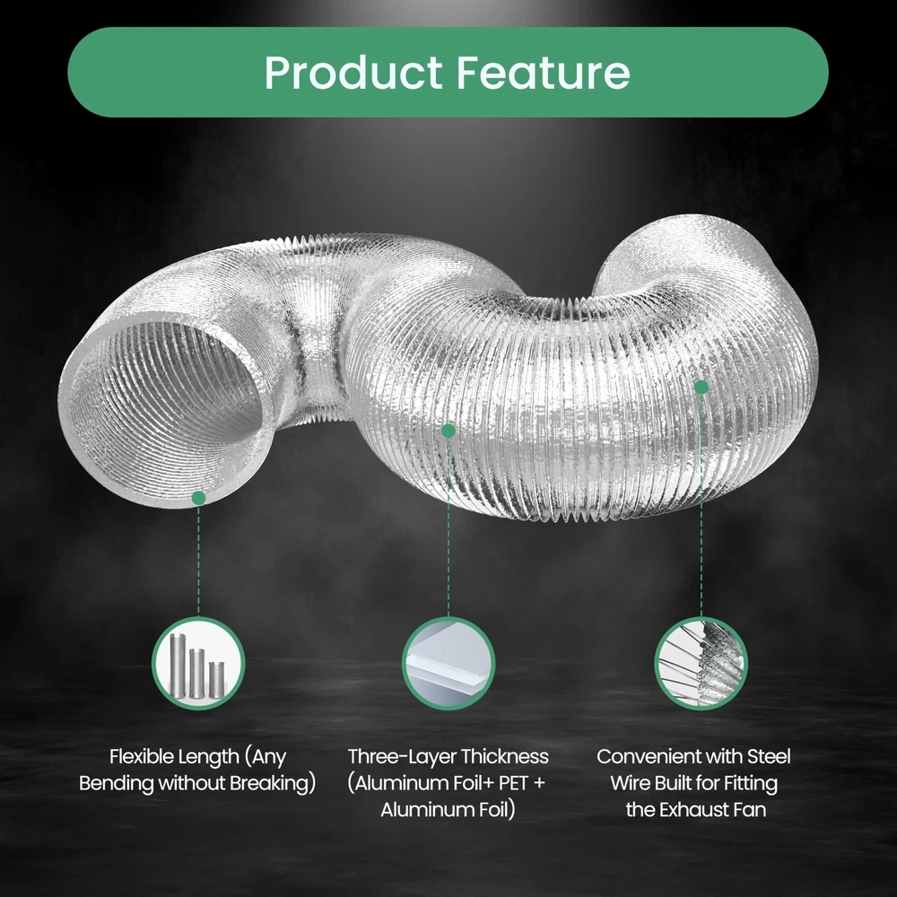 Reduce Lower Noise: 4 inch flexible duct designed for reducing noise from fans and carbon filter systems, which can decrease the noise by up to 50%. Three-Layer Design: Ducting three layer design keeps your ventilation system free of rips, our ducting is built with 3 layers of Aluminum foil with a layer of PET and steel wire helix, which makes it more durable and resistant to leaks, tears, and cuts. Fire Resistant Air Duct: Dryer exhaust hose is fire resistant and no gas release in high temperature, built-in steel wire for reinforcement and long lasting performance. And the temperature range is from -30 degree to 150 degree. Easy to Install: Flexible dryer vent hose is easy to install, which will slide right on your duct fan, vent exhaust, carbon filter or light reflector. Although the ducting is easy installation, violent installation is prohibited. Wide Applications: Aluminum ducting is suitable for HVAC system, it will move and deliver air in kitchens(cooking exhaust), greenhouses and growrooms(air circulation, intake, exhaust), bathrooms, dryer rooms, grow tents and other applications etc.