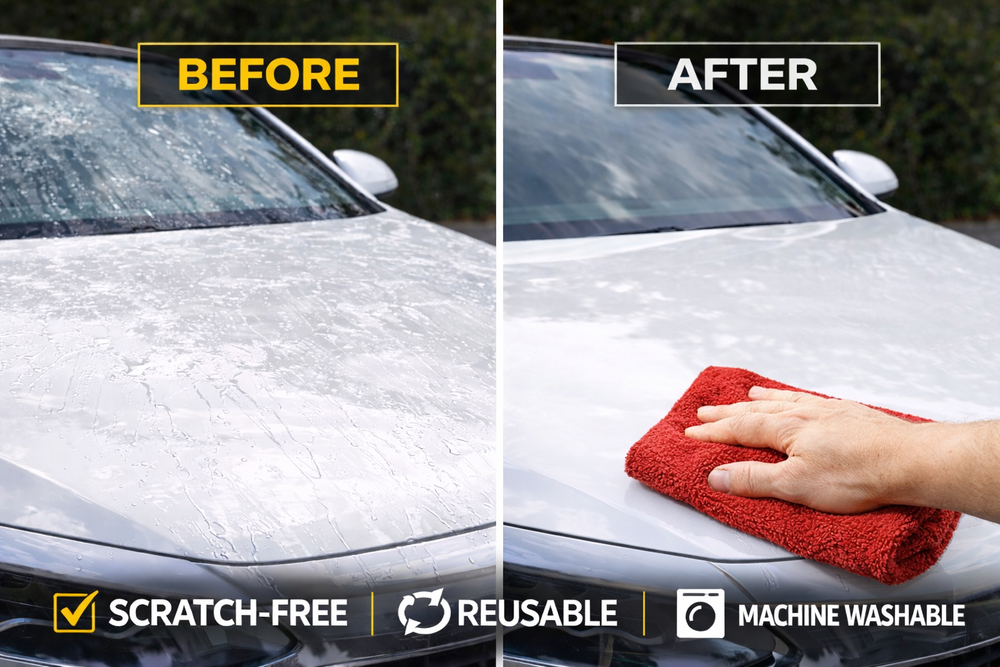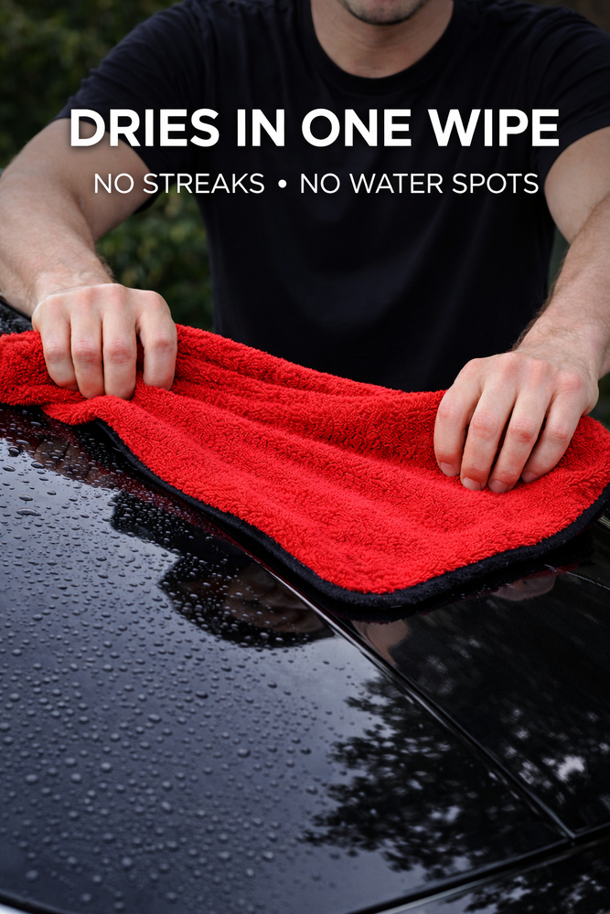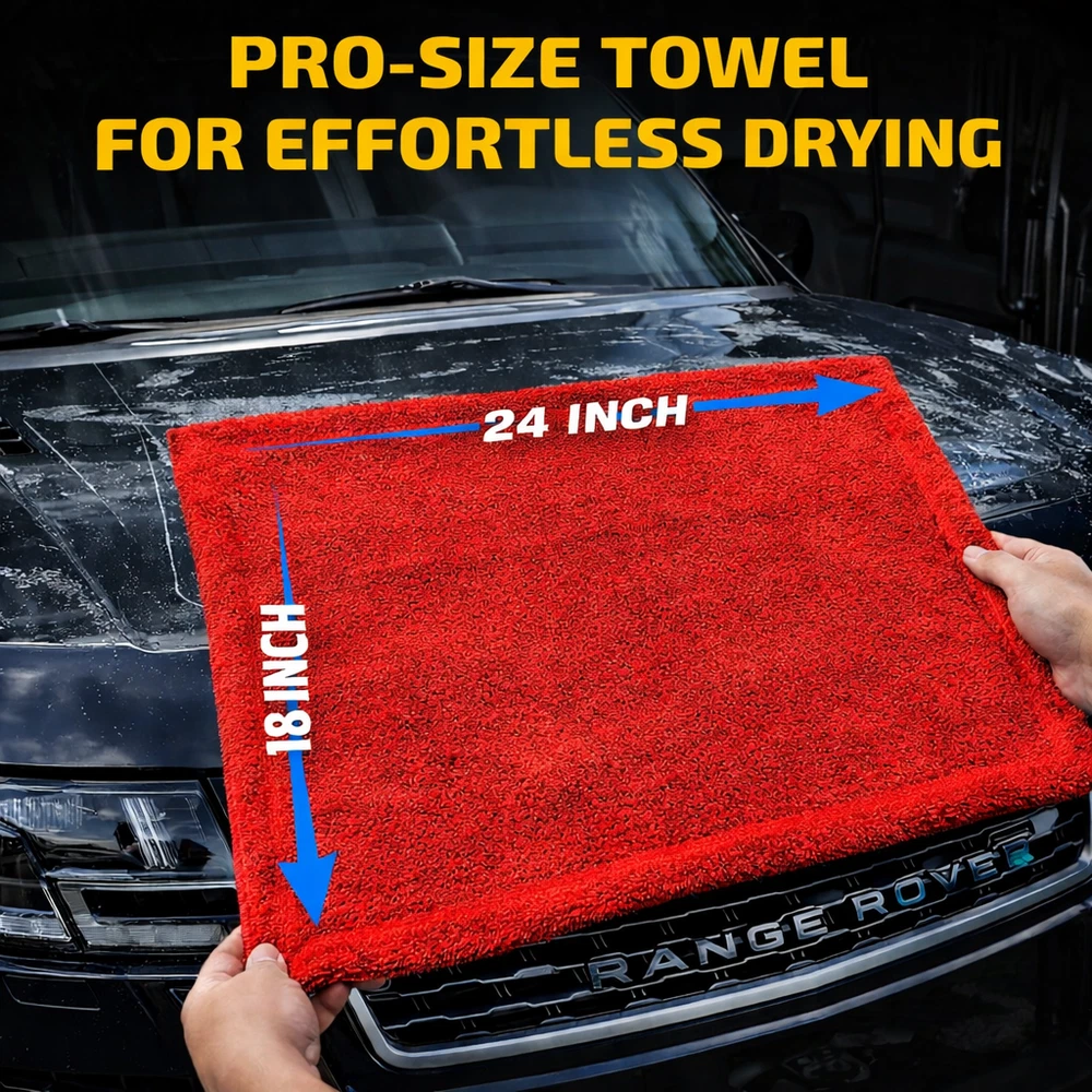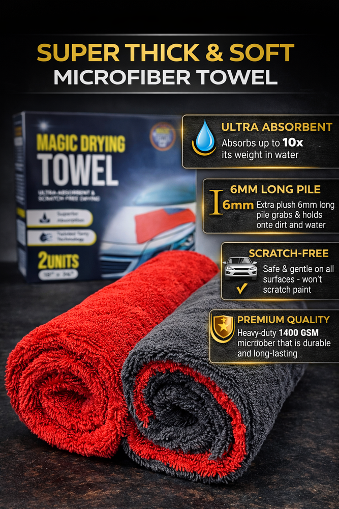 Drying Towel 18x24 Microfiber Ultra-Absorbent,Streak-free Twisted Terry 2 Pack Magic Drying Towel – Super Thick & Soft Microfiber Car Drying Towel (2 Pack) Upgrade your car detailing routine with the Magic Drying Towel , a premium twisted terry microfiber towel designed for fast, streak-free drying . Made with ultra-plush 1400 GSM microfiber and 6mm long pile , this towel absorbs water instantly and leaves your vehicle spotless. 🚗 Ultra Absorbent & Fast Drying Our advanced microfiber technology absorbs up to 10X its weight in water , making it the perfect towel for drying cars, trucks, SUVs, motorcycles, and boats in just one swipe. 🌀 Twisted Terry Technology – Maximum Performance Featuring twisted loop fibers , this towel holds more water, dries faster, and delivers professional-level results for car enthusiasts and detailers. ✅ Scratch-Free & Paint Safe The soft, thick microfiber is gentle on all surfaces , helping prevent scratches, swirls, and water spots. Safe for paint, glass, chrome, and ceramic coatings. 💎 Premium Quality & Durable Construction Built with heavy-duty 1400 GSM microfiber , this towel is long-lasting, reusable, and machine washable—perfect for everyday car care and detailing. 📦 What’s Included 2 Premium Microfiber Drying Towels Size: 18" x 24" Colors: Red & Gray (Double-Sided Design) ⭐ Perfect For: ✔ Car drying towel ✔ Auto detailing microfiber towel ✔ Streak-free drying cloth ✔ Twisted loop drying towel ✔ Scratch-free car care towel ✔ Professional car wash towel
