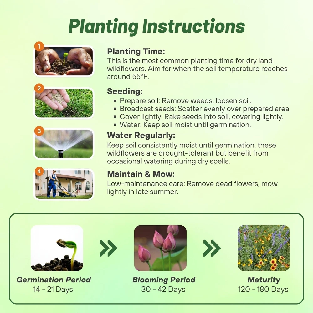 This dry land wild flower mix is made up of 50% annuals and 50% biennials/perennials to give color the first season and for seasons to come. The species in this mix were chosen for their ability to tolerate drought. These flowers will thrive in dry climates where there might not be regular moisture or irrigation. Under normal conditions, the height of these wild flowers will by 36 – 48 inches. The species in this mix include: Annual Baby’s Breath, Siberian Wallflower, Blue Flax, California Poppy, Cornflower, Perennial Gaillardia, Sweet William, Shasta Daisy, Annual Gaillardia, Corn Poppy, Rocky Mountain Penstemon, Prairie Coneflower, African Daisy, Spurred Snapdragon, African Stick Daisy, Hoary Vervain, Catchfly, Gloriosa Daisy, Black-eyed Susan, Sweet Alyssum and Plains Coreopsis. Prepare a site by removing weeds and loosening soil. Seed can be broadcast and raked into the soil, covering 2 – 3 times their thickness, or seed can be drilled to a maximum of ¼ inch. This dry land mix should be planted in the spring once soil temperature warm to 55F. Seed should stay moist by either rainfall or irrigation until germination occurs. DIVERSE MIX FOR SEASON-LONG COLOR: This wildflower seed mix contains 50% annuals and 50% biennials/perennials, ensuring continuous blooms throughout the first season and lasting beauty in subsequent years. Each wild flower species are specifically selected for their ability to thrive in arid regions, providing vibrant color displays even in challenging environments. THRIVES IN DRY, ARID CONDITIONS: Formulated for USDA Zones 3-10, this wildflower mix is perfect for areas with low moisture or irregular irrigation. The selected species grow 36 to 48 inches tall and vibrant, even in harsh, dry conditions, making it ideal for gardens, meadows, and landscapes where water conservation is essential. EASY TO PLANT AND MANAGE: These drought tolerant wildflower seeds are simple to establish, whether broadcasting or drilling. Plant at a depth of ¼ inch in the spring when soil temperatures reach 55°F. Keep the soil moist until germination to achieve optimal results. It’s suitable for both full sun and shaded areas, making it versatile for various landscape settings. FLEXIBLE SEEDING OPTIONS FOR CUSTOM COVERAGE: This bulk wildflower seeds offer a flexible seeding rate based on your desired look—use a lower rate for a scattered, natural meadow appearance or a higher rate for a dense, vibrant stand of wildflowers. It’s ideal for both large-scale and small-scale planting projects. ENHANCES BIODIVERSITY BY ATTRACTING POLLINATORS: These wild flowers not only provides a stunning visual display but also attracts a variety of pollinators, including bees, butterflies, and birds. Planting this wild flower seeds in bulk supports local wildlife and promotes a healthy ecosystem in your garden or landscape.