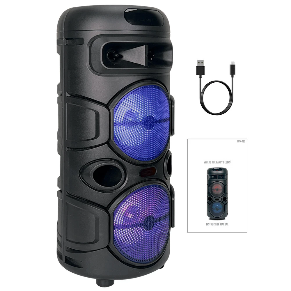 Dual 4" Portable Bluetooth Speaker BT/AUX/TWS Sub woofer Heavy Bass Sound System Feature: Material: ABS Color: Black Speaker: 4 "*2 Bluetooth name: MPX-420 Connection distance: < 10m Input voltage: DC5v 1A When charging, the red light goes on, the full light goes off, Functions: BT connection, AUX mode, TF card, U disk, TWS, FM mode Package Include: 1 X Double 4 "portable stereo 1 X TYPE-C charging cable 1 X English instruction manual Contact us: Payment: Shipping: Warranty Return Contact us: We have always been trying to provide the best service and reliable products for every customer, however, accident may happen sometimes, please contact us to resolve any issue before leaving a negative feedback. Payment: 1. All payments must be prepaid before shipping. 2. We only accept payment via PayPal. Please kindly check if you can do the payment via PayPal before placing an order. Shipping: 1. Item will be shipped same business day if paid 4 pm EST 1 pm PDT (except weekends and holidays) and shipped from US. 2. Orders from the United States will all be shipped out via starnding shipping or economy shipping. The shipment usually takes 3-7 business days(Saturday and Sunday excluded), if you need the item urgently, please contact us for detail before purchase. Orders from overseas will be shipped via DHL Express, 3-5 business days. 3. Local pick up is not available. Warranty . The warranty shall not apply to the following circumstances: a) Damage caused by undue wear&tear, misuse, improper installation or operation, neglect, accidents. b) Damage caused by natural disasters, flood, fire, lightning or pollution. c) If item was opened, any parts removed or repaired by any unauthorized person. Return (1).We stand behind our items and offer 60 days warranty. All items are in brand new condition unless specified otherwise elsewhere in the description. (2).All returns - defective or otherwise - have to be preauthorized. Please contact us to get an authorization and returning address before sending the item back.If an item is returned because of an undeliverable shipping address, buyer agrees to pay the cost for re-shipment. (3).Please note that If the return/replacement is not a result of our mistake (not defective or wrong item), the buyer is responsible for return shipping, as well as a 20 percent restocking fee. (4).Replacement or refund will be made upon receipt of the returned item. If you do not want to wait for the replacement, you can just reorder one and then send the first one back for a refund.