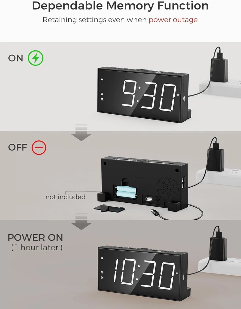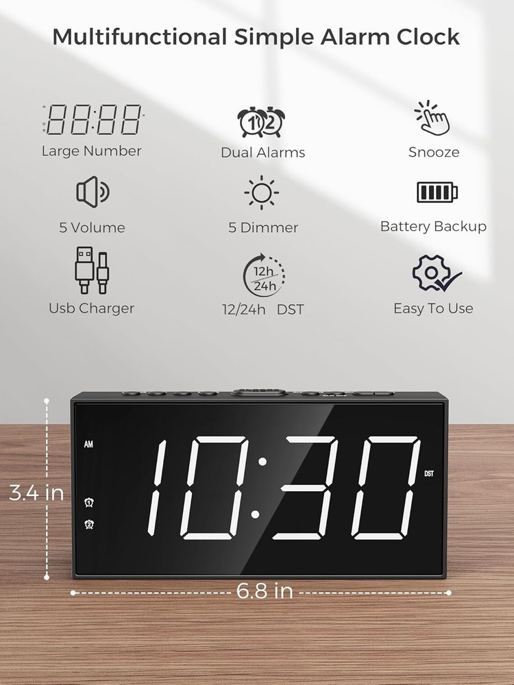 Dual Alarm Clock with Loud LED Display & USB Charging - Ideal for Deep Sleepers ‹ › ‹ › ‹ › ‹ › ‹ › ‹ › ‹ › ‹ › ‹ › ‹ › Dual Alarm Clock with Loud LED Display & USB Charging ⏰ Ideal for Deep Sleepers Features: Easy to use dual alarm settings for family members with varying schedules. 4-level adjustable alarm volume to accommodate different sleep depths. 5-level brightness dimmer for a custom display, ensuring comfort during both day and night. Built-in USB charging port for your smartphone, tablet, or other smart devices. SNOOZE function grants an additional 9 minutes of precious sleep. Outlet operation with battery backup to maintain alarm and time settings even during power outages. 12/24 hour time format with Daylight Saving Time option. Convenience and Clarity: Large 7" LED display provides clear time visibility from across the room. Adjustable volume perfect for both heavy and light sleepers. Simple setup with clearly marked buttons, making it easy for kids and seniors alike. Stylish and Practical: A chic design that complements any bedroom decor, perfect for teens, seniors, and everyone in between. This multifunctional clock acts not only as an alarm but also as a stylish accessory for your bedside table. The Perfect Gift: Looking for an ideal gift solution? This dual alarm clock is perfect for any occasion—be it Christmas, New , or Birthdays. Suitable for all ages, you can gift it to children, seniors, friends, or family members. Plus, it comes with a 365-day product , showcasing our commitment to your satisfaction. Don’t just wake up—wake up in style and with ease. Secure your Dual Alarm Clock today and take the first step towards more peaceful mornings! Shipping Free & Fast Shipping - We offer free shipping to most of the USA with a normal delivery time of 3-7 days. However, due to the current situation, additional delivery time (up to 3 weeks) may be required for some items. Alternative Carriers - We may use alternative carriers (e.g. USPS, FedEx, UPS, etc.) to ensure your package arrives safely and on time. Due to the use of multiple carriers, we are unable to provide a tracking number automatically. Handling Time - Orders are processed and shipped within 1-2 business days of receiving cleared payment. Shipping Restrictions - Shipping to Alaska, Hawaii, Puerto Rico, Guam, and other US territories may incur shipping charges or delivery restrictions. Please contact us before ordering, or your order can be refunded/cancelled. State Restrictions - There may be restrictions based on your state of purchase. For example, certain items may not be shipped to California due to state regulations. Contact for Tracking Updates - If you require tracking updates or have any concerns about the delivery of your order, please feel free to contact us, and we will be happy to assist you. Return 30-Day Hassle-Free Returns - We want you to be completely satisfied with your purchase. If you are not, you can return the item within 30 days of receiving it for a full refund or exchange. Easy Return Process - To start a return, simply contact us and we will provide you with a prepaid return shipping label and detailed instructions. Restocking Fee - There are no restocking fees for returns. However, the buyer is responsible for return shipping costs if the return is not due to a seller's error. Refund Processing Time - Refunds will be processed within 5 business days of receiving the returned item in its condition. Payment We accept all major credit cards, PayPal, and Apple Pay for your convenience. Your payment information is secure and encrypted to ensure a safe and seamless transaction. Please complete your payment within 3 days of purchase to avoid any delays in shipping. Feedback Your feedback is extremely important to us. We strive to provide the best products and customer service possible. If you are satisfied with your purchase, please take a moment to leave us a positive review. If you have any concerns or issues with your order, please contact us before leaving negative feedback. We are committed to resolving any problems and ensuring your satisfaction. Contact Us If you have any questions or concerns, please feel free to out to our customer support team. You can contact us through the eBay messaging system. We are available Monday to Friday, 9:00 am to 5:00 pm EST, and we will do our best to respond to your inquiry within 24 hours. Buy it now and enjoy a pleasant shopping experience! Unit Quantity: 0.6 lb Features: 12-Hour Display,24-Hour Display,Battery Backup,Dual Alarm,Large Display,USB Charging Port,Loud Alarm,Adjustable Volume,Dimmable,Snooze,Daylight Saving Time (DST) Material: Plastic Room: Bedroom,Home Office,Kid's Room Department: Kids,Teens,Adults Type: Standard Alarm Clock Display Type: Digital Color: White Movement: Quartz (Plug-In Electric) Power Source: Electrical Style: Digital Frame Material: Plastic Shape: Rectangular Item Height: 1.5 Inches Item Weight: Less Than 1 lb Unit Type: lb