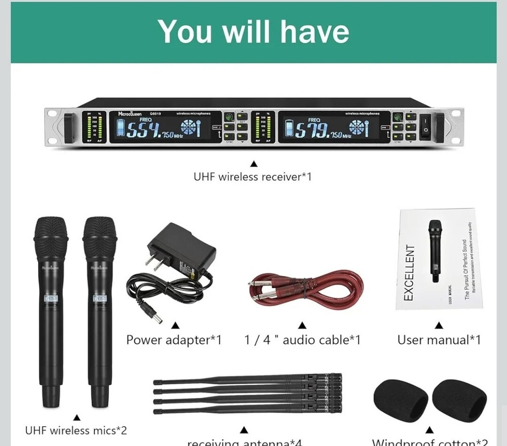 Professional UHF Wireless Microphone System, Dual Channel with 2 Metal Handheld Mics, 200 Channels Alternative Frequency, 500FT Working Distance, for Karaoke, Meeting, Party