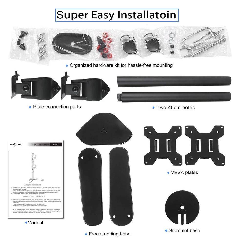 ML6802 is a high quality 2- plate full-motion desk mount/stand. How can I check if the mount fit my TV/monitor or no? Firstly, please check each weight of your display, each should be less than 10kg/22lbs. Secondly, if your Monitor or TV has 4 mounting holes on the back of the screen that are in the list of VESA compatibility blow, this bracket will fit. Why this mount can attract me to buy it? 1. With Cable Management to make your desktop clean. 2. Height adjustable within 31.5''(detailed dimension, see 6th picture). 3. Rotate the screen 360 degrees to face any direction in the room. The multi-directional design is also paired with a tilting motion for a 15 degree range. Tilt or pivot your screen for a wide array of potential ergonomic settings. 4. A more reasonable structure make it steady and easy installation Specifications: Fits Screens: 13''-27'' VESA Compatibility: 75x75 - 100x100mm Swivel: 180° Tilt: 15°up/down Construction: cold rolled steel construction Loading Capacity: up to 22lbs/10kg Height of the pole: 80cm/31.5'' & Support: 3-YEAR from date of the original purchase. If the damage or problem due to any manufacturing defect, please our after-sale service team by with your purchase order ID and details of the problem. Our support team will deal with your problem as soon as possible when we are at work. Compatibility - Dual monitor mount ideal for most screens up to 27" and 22lbs each with 75x75mm or 100x100mm backside mounting holes. Aticulation - Rotate 360°, tilt ±45° up and down, swivel ±45° left and right, extra tall height adjustment along the center pole. install options - Free standing base let you easily move your monitors to anywhere. Optional grommet base (fits desk up to 4" thickness) save your valuable desk space. Integrated cable management - Keeps your desk tidy and clean by organizing your power and AV cables in detachable cable holder. Easy installtion - Step-by-step user manual and organized hardware kit for hassle free mounting.