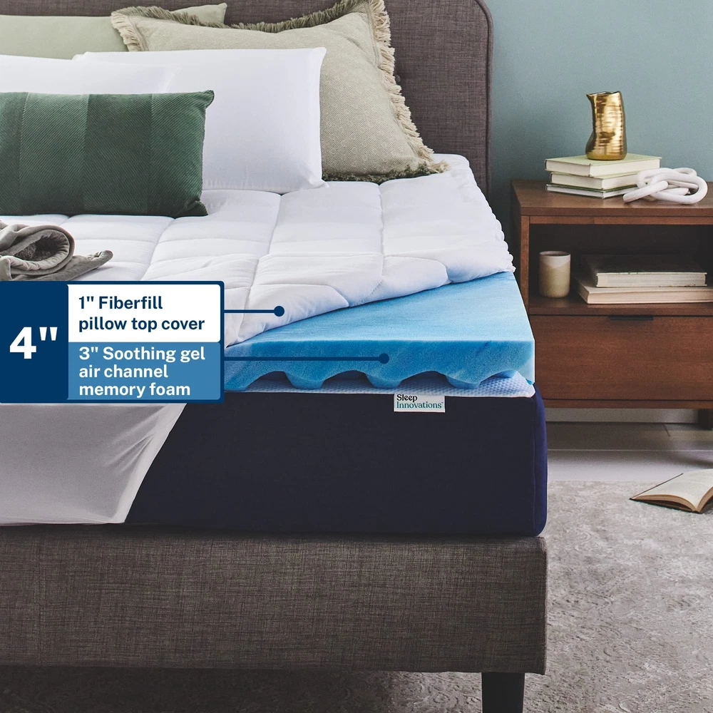 Reinvent your sleep space with a two-layer mattress topper that provides the ultimate luxurious comfort. A plush fiberfill pillow top cover comforts on impact, so you begin to unwind from the moment you lay down. Underneath, enhanced airflow gel memory foam provides ultra-breathable support, allowing excess heat to move away from the body as the foam continuously cools throughout the night. A consistent sleep temperature ensures that you fall asleep faster and stay asleep longer. Experience deep pressure point relief with responsive memory foam. This helps prevent tossing and turning to encourage more undisturbed sleep. Plus, you'll extend the lifetime of your mattress with renewed nighttime comfort. Add this plush queen size gel memory foam mattress topper with two layers of cool cloudlike comfort; 3 inch gel memory foam plus a 1 inch pillow top cover for an all-over soft plush feel Bedtime Made Better: This gel foam mattress topper offers plush support for all sleep positions; The fluffy pillow like cover is removable, washable, and stretches to fit your bed like a fitted sheet Instantly Improve Any Mattress: Relieve pressure points, enjoy deeper sleep, and wake up feeling refreshed with our line of memory foam, gel memory foam, dual layer, and pillow top mattress toppers Made In The USA: Our memory foam mattresses, mattress toppers, and pillows are all hypoallergenic and CertiPUR-US certified, offering you high quality materials for high quality sleep Committed To Great Sleep: We invented the memory foam mattress in a box and we continue to innovate restorative foams and fabrics to give you the best night's sleep; This topper comes with a 10 year warranty