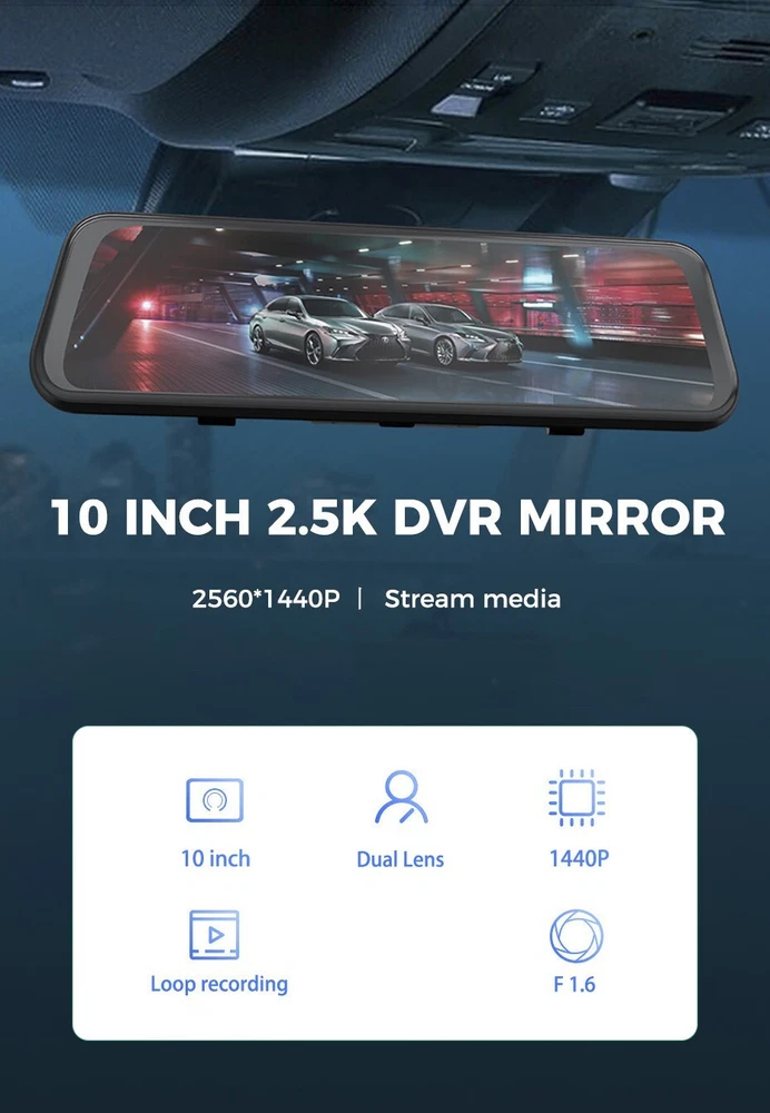 Product Description 10 Inch 2K 1440P Car DVR Mirror Dash Cam Dual Lens Dashcam Full Hd Drive Recorder Stream Dash Car Camera RearView Mirror Add our listing to Watchlist Or Add to Cart , you will get more discount 10in Car Rearview Camera Stream Media DVR Mirror Touch Screen FHD 2K 1080P Dash Cam Recorder DVR Dashcam Specifications Screen Size:10 InchStream Media display Chipset:Original chip FHD recording Super Night Vision Camera Resolution:Front Camera:12MP, 1920*1440P; Back Camera: 8.0MP,1080P Camera View Angle:Front Camera: 170 Degree;Back Camera:140 Degree Camera Aperture:F2.2 Large Aperture(Front Camara) Video Code:AVI OSD Languages:Russian English Japanese Korean Danish French Czech Polish Portuguese Dutch Turkish Thai Chinese(If you want other languages,tell us,we will help you add it) Features:G-Sensor,Digital Zoom,Motion Detection,Cycle Recording,Time&Data Display,With Rearview Mirror 2 Camera Lens:Front And Rear Camera Lens Can Record Simultaneously,support picture in picture display Front Camera Lens:Full 6 Glasses Camera Lens Night Vision Rearview Camera Lens:Give a rear view camera cable (about 6 meters) Recording:automatic records when car power is on, auto power off when car off . Parking Monitor:Support,suggest buy a transformer line for 24 hours Parking control(not inclued ) Features 2K FHD-clear screen 2560*1440P ultra-clear picture, whether it is day or night, you can shoot clear videos without missing every detail Easy installation The body is small and exquisite, easy to install, and does not block the line of sight, just like being integrated with the car Watch the video on the phone You can control the DVR by connected mobile phone via WiFi, like recording video, the file recorded video from the overwriting.taking photo, playback preview,parameter settings, etc. 10 inch Streaming The large screen and waterproof lens make it possible to see the situation behind the car clearly even in heavy rain, ensuring driving safety Package List 1. Recorder 2. Charger 3. Rear camera (including cable) Payment Returns Contact Us Shipping We accept payment by PayPal only ! Payment should be completed within 5 days after buyer places the order,or else an unpaid case will be opened in order to cancel the transaction. If you can not pay in time, please contact us. e-check from PayPal will only be processed once the payment clears. All of the items will be shipped to buyer's EBAY address,please confirm your address on Ebay before you buy.Your order will be usually shipped out the same or next business days once the payment is made and cleared. 30-day Warranty with Exchange for defective, malfunctioned, incorrect or parts-missing items. Please notify us and return the item with all parts and accessories packed and marked "FOR EXCHANGE" within 14 days of receipt. If defective, malfunctioned or parts-missing items are no longer available, a refund may be issued. All returning postage costs will be the responsibility of the buyers under all circumstances. If you encounter any problems about anything, please feel free to contact us and we will do our best to assist you solve the issue. If you are not satisfied in anyway, please feel free to let us know and give us a second chance to correct it before you decide to leave any neutral or negative feedback. Please contact us through eBay link if you have any questions. We will reply you within 24- 48 hours. Please check you spam mail if no response for 48 hours. All items will be checked before packing. All items are new and of high quality. Item will be shipped within 1 business days upon receipt of payment, excluding weekends and public holidays. If to USA,we will ship your order by USPS,it will take about 8-12 working days to you,and you can track it on line. If to other country,we will ship your order by China Post or Singapore Registered Air Mail,it will take about 14-21 working days to you,you aslo can track it on line. Delivery time is about 14-28 business days and it may take up to 8 weeks . Payment We accept payment by PayPal only ! Payment should be completed within 7 days after buyer places the order,or else an unpaid case will be opened in order to cancel the transaction. If you can not pay in time, please contact us. eCHECK from PayPal will only be processed once the payment clears. All of the items will be shipped to buyer's EBAY address,please confirm your address on Ebay before you buy.Your order will be usually shipped out the same or next business days once the payment is made and cleared. Returns 30-day Warranty with Exchange for defective, malfunctioned, incorrect or parts-missing items. Please notify us and return the item with all parts and accessories packed and marked "FOR EXCHANGE" within 14 days of receipt. If defective, malfunctioned or parts-missing items are no longer available, a refund may be issued. All returning postage costs will be the responsibility of the buyers under all circumstances. Contact Us If you encounter any problems about anything, please feel free to contact us and we will do our best to assist you solve the issue. If you are not satisfied in anyway, please feel free to let us know and give us a second chance to correct it before you decide to leave any neutral or negative feedback. Please contact us through eBay link if you have any questions. We will reply you within 24- 48 hours. Please check you spam mail if no response for 48 hours. Shipping All items will be checked before packing. All items are new and of high quality. Item will be shipped within 1 business days upon receipt of payment, excluding weekends and public holidays. If to USA,we will ship your order by USPS,it will take about 7-10 working days to you,and you can track it on line. If to other country,we will ship your order by China Post or Singapore Registered Air Mail,it will take about 14-21 working days to you,you aslo can track it on line. Delivery time is about 14-28 business days and it may take up to 8 weeks . Welcome to