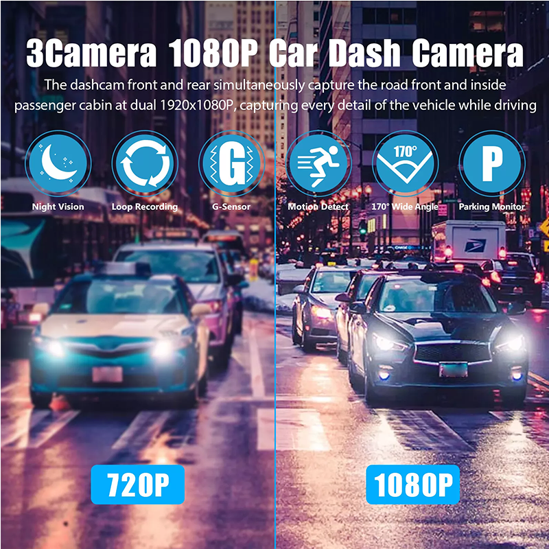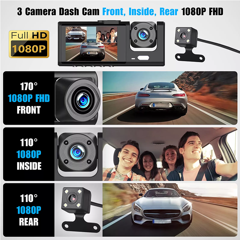 3 Channel HD 1080P Car Dual Lens Dash Cam Front/Rear/Inside Video Recorder Camera G-sensor Product Feature: ✨ 3 Camera Dash Cam Front, Inside, Rea 1080P FHD: With 2.0 inch LCD screen, the dual dash cam for cars records front & inside& rear. The dashcam front and rear simultaneously capture the road front and inside passenger cabin at dual 1920x1080P, capturing every detail of the vehicle while driving. Best choice for online car-hailing service, taxis/rideshare drivers, commuters, and families. ✨Excellent Infrared Night Vision: The dashcam interior facing camera with 4 infrared LED lights, which can accurately capture the driver and passengers in low light, this dash camera is also able to increase exposure automatically in dark situations to capture clear video footage. Perfect for rideshare drivers like Uber, Lyft & Taxi. ✨3 Camera Dash Cam Parking Mode: While your car is parked and the engine is off the dual dash cam front and inside auto-start and record a short video once it detects bumps by someone in parking, then turns off automatically. These dashcams for cars' videos will be saved & locked, thus providing you with video evidence. The dashcam front and cabin need a constant power supply either from the external battery pack or hardwire, hence ensuring your peace of mind with complete 7*24 hours monitoring of your car. ✨Seamless loop Recording: Dual dash cam front and inside with seamless loop recording will automatically overwrite the oldest footage with the newest content when the card storage is full. You will never worry about the memory card running out of space. ✨Easy Installation & Use: This dash camera is very easy to install and operate. Just insert the TF card (not included) and connect to the power supply. The car dash camera will start recording immediately after igniting, shut down and save the video when you shut off the engine. Product Specification: Type: 3Camera 1080P Car Dash Camera Pixel: 1920x1080/30 frames Front Camera: 6-Glass/F2.0 aperture/170 degrees wide angle Inside Camera: VGA 110 degrees Display Screen: 2.0 inch IPS HD 4:3 Cycle recording: Support G-sensor: Support Parking Monitoring: Support Motion Detection: support Memory card : Maximum 32G (not included) Power interface: USB2.0/ 5V 1.5A Battery : 320MAH Polymer lithium battery Current frequency: 50/60HZ Language: English, Chinese, Korean, Russian, Japanese, French, Italian, German, etc. Operation Temp: -40+70 degrees Package Included 1x 1080P Dual Dash Cam 1x Car charger 1x Suction cup holder 1x Rear Camera 1x Video Cable 1x User Manual