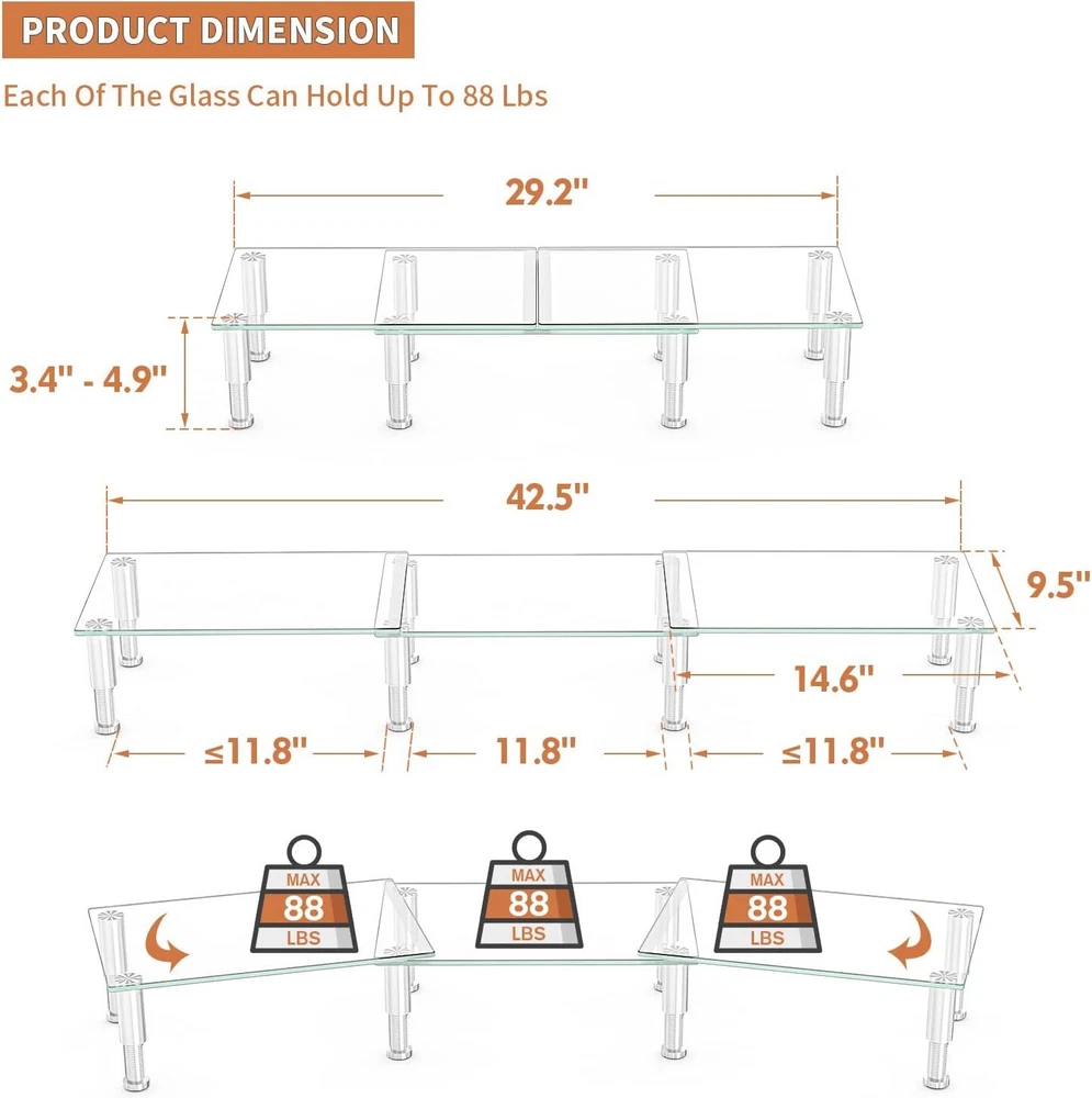 Product Description Dual Monitor Stand -Adjustable Length And Angle Dual Monitor Riser, Desktop Organizer For Pc, Computer, Laptop (Clear) Multi-Functional Monitor Stand: 2 Monitor, Tv Or Notebook Computer Is Elevated To A Proper Ergonomic Viewing Position, Creating Best Posture Which Helps Reduce Neck And Back Strain,Then Stow Laptop Underneath Monitor Riser For Space-Saving Storage Tilt Function: My Computer Monitor Riser Can Adjust Forward 0-15 Degree To Put The Computer Comfortable Position Height Adjustable: The Stainless Steel Leg Can Be Freely Adjustable Height From 3.4 Inch To 4.9 Inch Get A Tidy Working Space: Lift Your Monitors By The Desktop Shelf And Store Your Keyboard, Office Files, Notebook, Calculator Underneath It. Get Rid Of Messy Desk, Keeps Your Working Space Tidy Care Your Body: As A Ergonomic Monitor Riser Stand, It Could Raise Your Computer Monitor, Tablet Or Laptop To An And Keep Screen At Eye Level And Help You Keeping A Better Posture, Preventing Stress Cause By The Long Time Work About Us We are a reputable seller with many years of experience selling on eBay. Our goal is to provide high-quality products and excellent customer service. Shipping Items will be shipped within 1-3 business days when we received payment. (Orders are not processed on weekends & holidays) Tracking information will be sent once item is shipped. Delivery time depends on destination and other factors Item is shipped to ebay address. Leaving correct address can minimize delay. For international shipping and shipping to Guam, Hawaii and Alaska, Please contact us before placing the order. International buyers please note: Import duties, taxes and charges are not included in the item price or shipping charges. These charges are buyer’s responsibility. We will try our best to reduce the risk of the custom duties. Local pick-up is unavailable at the moment. Contact Us We reply any email messages within 1 business / working days(off-duty at weekend). If you do not get a response from us, then please check your junk or spam mailbox. Our Business hours: Mon-Fri 9:00-18:00, UTC/GMT +8 hours. Please contact us either by clicking "contact seller" in the "purchase history" section or simply click "ask a question" at the bottom of this page. If you are unsatisfied with our item or service, please contact us before leaving any feedback. We are committed to resolve all issues in a friendly and satisfactory manner.