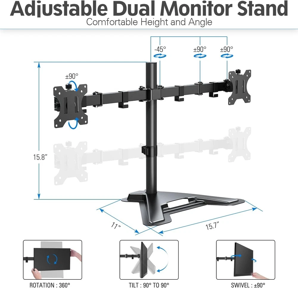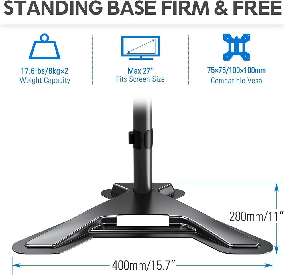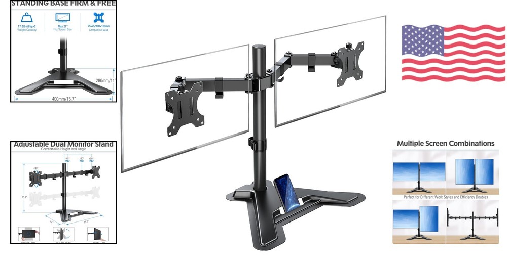 Dual Monitor Stand - Freestanding & Height Adjustable Desk Mount for 2 Screens ‹ › ‹ › ‹ › ‹ › ‹ › ‹ › ‹ › ‹ › ‹ › Dual Monitor Stand - Freestanding & Height Adjustable Desk Mount for 2 Screens Features: Compatible with two screens up to 27 inches and 17.6 lbs weight capacity. Universal VESA pattern compatibility (75x75/100x100mm). Freestanding base for hassle-free installation, no drilling or clamping required. Space-saving design with a glass table top compatibility. Professional space saver for a more organized desk. 360-degree rotation for landscape or portrait orientation. 180-degree swivel for easy screen sharing. ±90-degree tilt for optimal viewing angles. Heavy-duty steel construction for stability and security. Backed by a 3-year support guarantee. Benefits: Efficiently utilize desk space with dual monitor arms. No need for drilling or clamping, preserving the integrity of your desk. Compatible with various monitor sizes and weights. Easy to adjust for the perfect viewing angle and position. Enhance productivity and comfort during work, gaming, or viewing. 360-degree rotation allows for versatile screen orientation. Swivel feature enables easy screen sharing with others. Tilt function ensures optimal viewing angles for reduced eye strain. Heavy-duty construction ensures the safety and security of your monitors. Backed by a 3-year support guarantee for peace of mind. Why choose our Dual Monitor Stand? Upgrade your workspace with our Dual Monitor Stand - the perfect solution for a clutter-free and ergonomic setup. With its freestanding design, you can easily install it without the need for drilling or clamping, preserving the integrity of your desk. The adjustable features allow you to find the perfect viewing angle and position, reducing eye strain and enhancing productivity. Plus, the heavy-duty construction ensures the safety and security of your monitors. Don't settle for a messy and uncomfortable workspace - choose our Dual Monitor Stand and experience the difference today! Shipping Free & Fast Shipping - We offer free shipping to most of the USA with a normal delivery time of 3-7 days. However, due to the current situation, additional delivery time (up to 3 weeks) may be required for some items. Alternative Carriers - We may use alternative carriers (e.g. USPS, FedEx, UPS, etc.) to ensure your package arrives safely and on time. Due to the use of multiple carriers, we are unable to provide a tracking number automatically. Handling Time - Orders are processed and shipped within 1-2 business days of receiving cleared payment. Shipping Restrictions - Shipping to Alaska, Hawaii, Puerto Rico, Guam, and other US territories may incur shipping charges or delivery restrictions. Please contact us before ordering, or your order can be refunded/cancelled. State Restrictions - There may be restrictions based on your state of purchase. For example, certain items may not be shipped to California due to state regulations. Contact for Tracking Updates - If you require tracking updates or have any concerns about the delivery of your order, please feel free to contact us, and we will be happy to assist you. Return 30-Day Hassle-Free Returns - We want you to be completely satisfied with your purchase. If you are not, you can return the item within 30 days of receiving it for a full refund or exchange. Easy Return Process - To start a return, simply contact us and we will provide you with a prepaid return shipping label and detailed instructions. Restocking Fee - There are no restocking fees for returns. However, the buyer is responsible for return shipping costs if the return is not due to a seller's error. Refund Processing Time - Refunds will be processed within 5 business days of receiving the returned item in its original condition. Payment We accept all major credit cards, PayPal, and Apple Pay for your convenience. Your payment information is secure and encrypted to ensure a safe and seamless transaction. Please complete your payment within 3 days of purchase to avoid any delays in shipping. Feedback Your feedback is extremely important to us. We strive to provide the best products and customer service possible. If you are satisfied with your purchase, please take a moment to leave us a positive review. If you have any concerns or issues with your order, please contact us before leaving negative feedback. We are committed to resolving any problems and ensuring your satisfaction. Contact Us If you have any questions or concerns, please feel free to reach out to our customer support team. You can contact us through the eBay messaging system. We are available Monday to Friday, 9:00 am to 5:00 pm EST, and we will do our best to respond to your inquiry within 24 hours. Thank you for supporting our small family business!