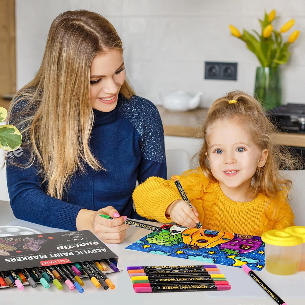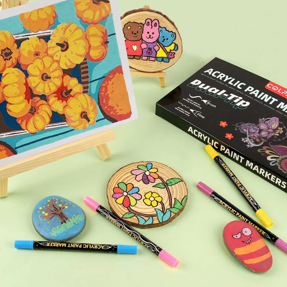 【Vibrant Color Acrylic Paint Pens】Our dual tip acrylic paint pens can work well on variety of surfaces.such as rocks painting,fabric,ceramic,glass, wood, plastic, leather, canvas, resin, plaster,shoes,tire,blackboard and almost any solid surface.Great for Artists,Students,Teenagers & Adult. 【Brush Tip and Fine Tip Paint Markers】48 vibrant colors paint markers,each acrylic paint pens come with a 1mm fine tip and a 1-5mm Brush Tip,which can meet the different needs of professionals and amateurs.the fine tip and brush tip works well for painting, drawing, calligraphy,lettering and sketching,the brush tip can also works well for large areas of coloring. 【Great Marker Pen for Gift】Our dual tip acrylic paint pens are long-lasting,quick dry,and opaque ink,waterproof and never fade,ideal choice for DIY Craft and holiday ornaments projects such as Christmas crafts for kids, Halloween pumpkin, Birthday Party decorations,Children’s Day,Valentine's Day,Thanksgiving Day or New Year's gift. 【Non-toxic and Odourless】Not like other oil-based paint pens with strong smell,not suitable for children. Our acrylic paint pens paint markers are water-based, non-toxic, safe and kid-friendly,Great for exercising your child's creativity and imagination(Notes:We recommend that children under 3 years old should use the acrylic pens under adult supervision) 【Precision and Quick-drying】Our acrylic markers come with fine brush tip options that allow you to create fine and precise detailing, perfect for calligraphy, hand lettering, and other fine detail work.Quick drying characteristics ensuring that your artwork is smudge-free, and you can complete your project faster. 【Portable and Bright Colors】The acrylic paint markers brush tip are lightweight and portable, making them easy to carry and store, allowing you to create artwork anywhere, anytime.The dual tip acrylic paint pens offer an extensive range of vivid and bright colors, making your artwork more lively and eye-catching.