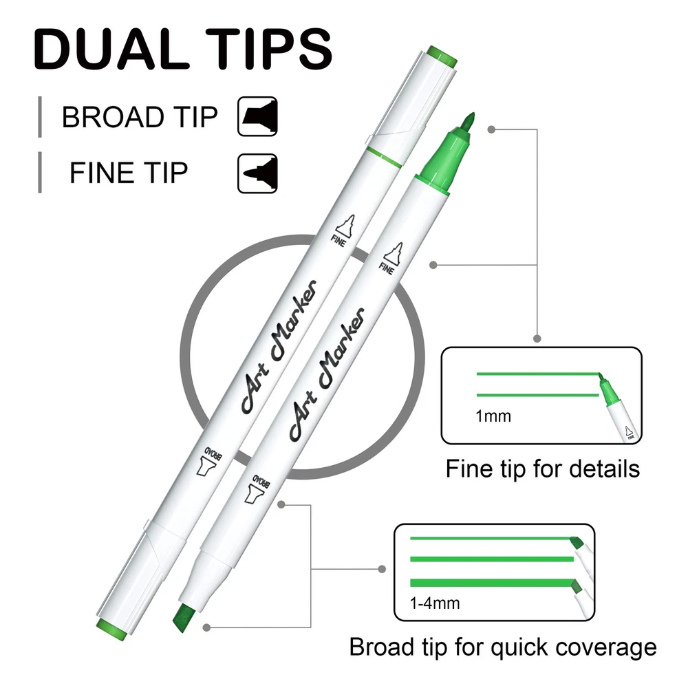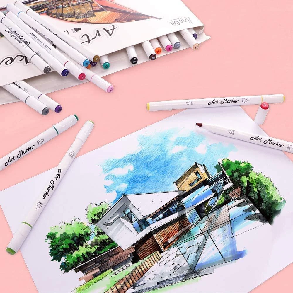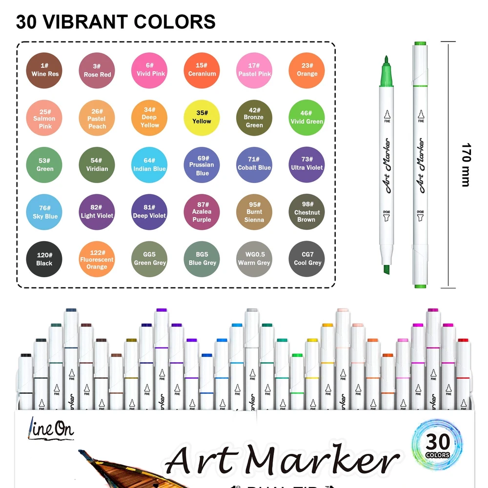 Art Markers, Lineon 30 Colors Dual Tip Alcohol Based Marker Pens Perfect for Kids Adult Coloring Books Sketching and Card Making MULTIPLE COLORS: Lineon 30 unique colors Art Markers set provides 30 vibrant eye-catching colors.The highly pigmented and vibrant markers are built to last against fading and blend well for added dimension to your artwork. UNLIMITED USES: Broad and fine twin tips for coverage and underlining, 4mm broad chisel tip for quick coverage and 1mm fine bullet tip for detailed lines highlight.Dual tips allows you to coloring, drawing, sketching,shading easily. EASY TO USE : The color-coded caps allow for ease in organization and use in identifying colors and each caps have ridges on the cap to prevent the markers from rolling off on smooth surfaces. Small Round barrel design makes it comfortable to grip. The tip of the marker pen should not stay on the paper too long, otherwise the ink will bleed. HIGH QUALITY&SAFE: Our Art Markers are long-lasting,quick-drying,waterproof, smear proof and fading resistant .They are also acid-free,Non-toxic and conform to ASTM D4236 and EN71. Markers needs to write on a specific mark paper so that it doesn't bleed to the next layer. SERVICE GUARANTEE: Your satisfaction is our top priority, please rest assured to purchase our products. If you are not satisfied with our products or have any questions, please feel free to contact us at any time.