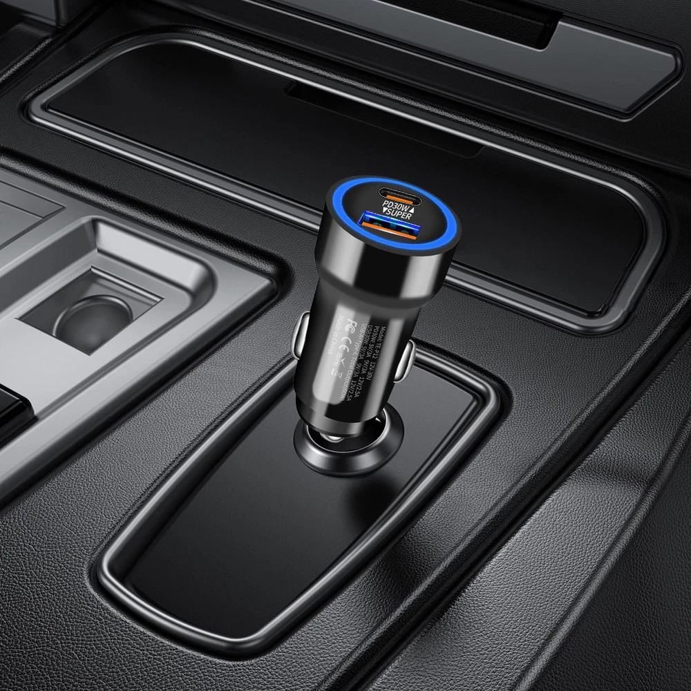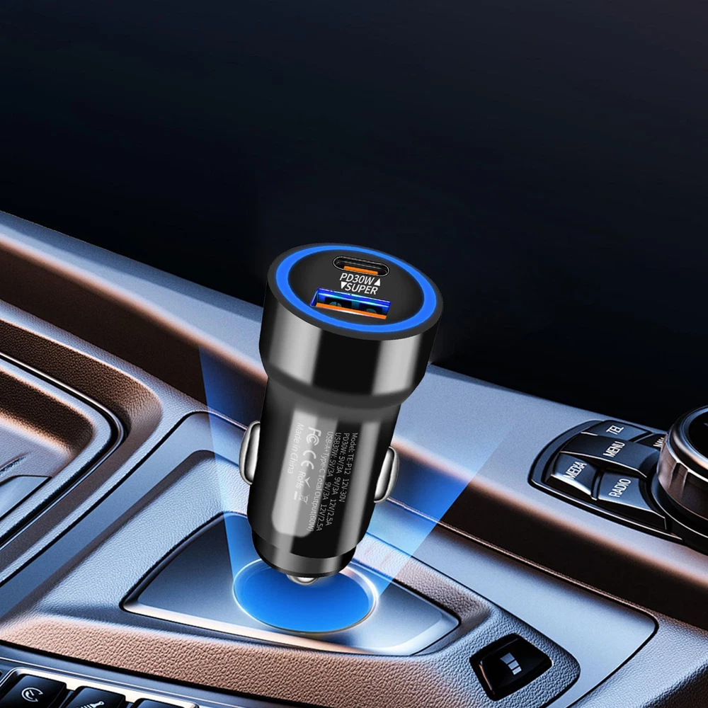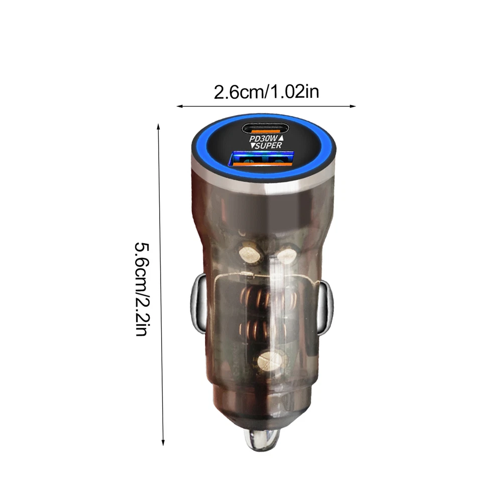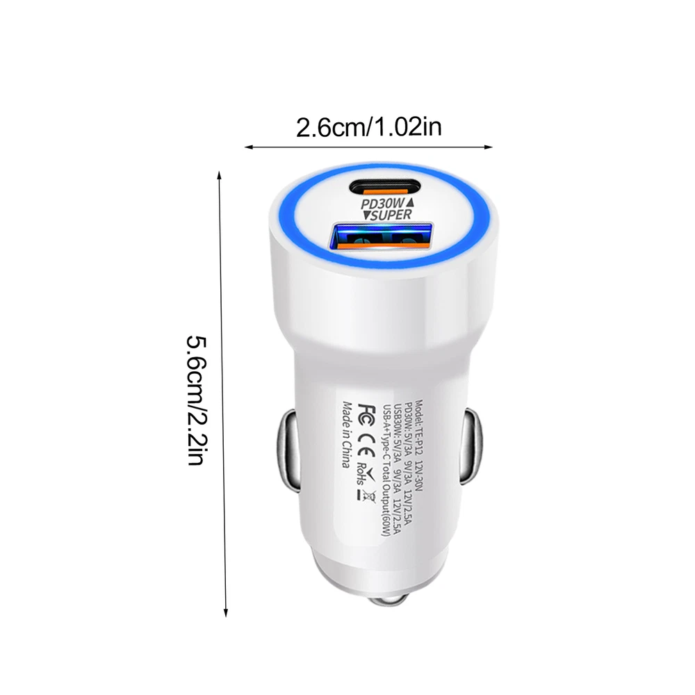 Bullet Points: Fast Charging Efficiency: With PD30W fast charging technology, this car charger delivers fast charging for your gadgets, ensuring maximum powering travel in no time Multi-port Charging: Featuring a USB and Type-C interface, this car fast charging block delivers quick and dependable efficiency to two devices at once. Keep your gadgets charged up Practical and Helpful: With support for 60W super fast charging, our car charger is the perfect charging adapter for your long-distance drives. Get faster charging speeds for all compatible devices Use with Ease: Transform your time travel with this fast charging car charger. Its innovative plug-and-charge design delivers instant charging without any additional accessories required Wide Range of Uses: Versatile car charger allowing for effortless connection to various electronic devices such as smartphones, game controllers, tablets, and cameras. Perfect for recording your driving or keeping your devices charged on long road trips This car fast charging adapter allows you to quickly charge up to two electronic devices while driving, making it perfect for long trips. With no additional accessories needed, you can easily achieve an instant charging experience. Specifications: Product name: Fast car charger Product size: about 5.6x2.6cm/2.21x1.02 inches Product weight: about 17g Rating input: DC12-30V Rating output: PD30W: 5V/3A 9V/3A 12V/2.5A USB30W: 5V/3A 9V/3A 12V/2.5A USB-A+Type-C: Total Output (60w) Packing List: 1 * Fast car charger Notes: 1. Due to the lighting effects and photographing angles, there is a color difference in the product, please understand. 2. Due to manual measurement, there is a tolerance in the product size.