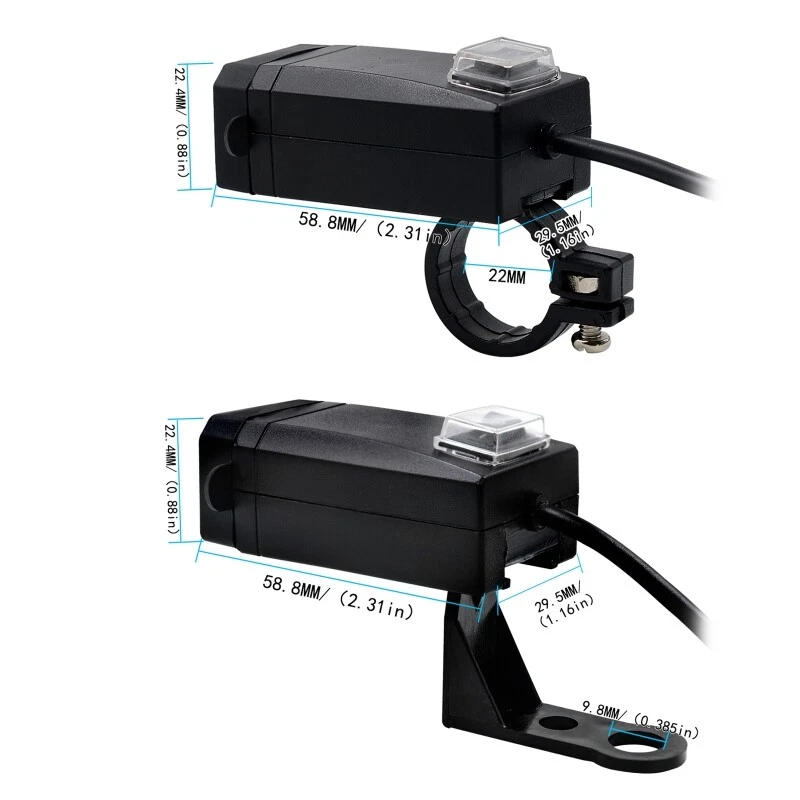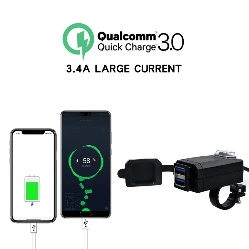 Dual USB Port QC3.0 Motorcycle Socket Black Power Adapter Features: for Functions:input overvoltage,undervoltage for output overcurrent,overvoltage,undervoltage,short circuit for reverse connection for chip internal high temperature for With and cover, it is safer to use. ON/OFF avoid power consumption. Handlebar installation and screw fixation both available. A wide of applications: used to supply power for mobile phones, tablets, navigation and GPS Specifications: ABS Input DC20-90V Normal output: 5V/2.4V Fast output: 4V/3.6; 5V/3.4A; 9V/2.5A; 12V/2A Cable Length:Approx.110cm/43.31'' Grade: IP65 Net Weight:85g Package Includes: 1x Motorcycle Phone note: Please allow 1mm errors due to manual measurement. Due to the difference between different monitors, the picture may not reflect the actual color of the item.