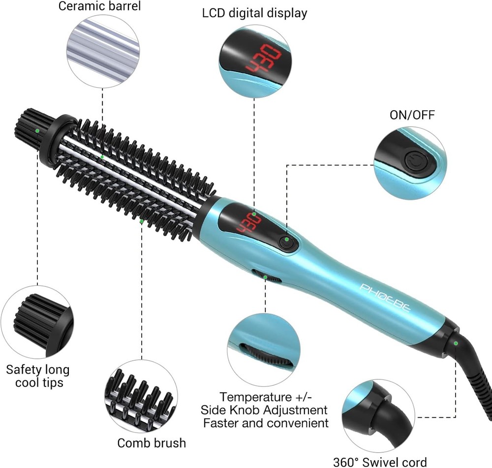 PHOEBE Curling Iron, Dual Voltage Travel 1 Inch Ceramic Tourmaline Ionic Hair Curler Hot Brush, Professional Anti-Scald Instant Heat Up Curling Wands, Heated Styler for Long Hair 【3 in 1 Multifunctional Curling Iron Brush】You can use it to curl, straighten your hair, or as a normal comb for long hair. NOTE: NO WORKING FOR HOT AIR BRUSH!! 【Anti-Scald for Safety Use】 High quality Nylon bristles and long cool tip prevent you from burning when styling. NOTE: It is not a pig bristle! 【Ceramic Tourmaline Ionic Technology for Healthier Hair】The Ceramic Tourmaline barrel produces negative ions to reduce heat damage, lock more moisture to make your hair more smooth and healthy. 【Adjustable Temperature Fit All Hair Types】The temperature controls from 265 ℉ to 430 ℉ with LCD digital display: 265 ℉-320 ℉ for thin/fine/normal hair, 320 ℉-395 ℉ for wavy/curly hair, 395 ℉-430 ℉ for coarse/thick hair. It fast heats up in 30 seconds for saving time and perfect styling, you can curl your hair quickly and it will last all the day. PLEASE NOTE: temperature will be locked if no use in 3 seconds, just press the ON/OFF button to unlock and then set the temperature again. 【Dual Voltage, Travel-Friendly】Our styling brush is travel-friendly too. It’s dual voltage (100-240 V) and automatically adjusts to the correct voltage when used with a plug adapter(not included). You don’t need a voltage converter, so you can just pop it in its travel bag and take it with you on your next vacation