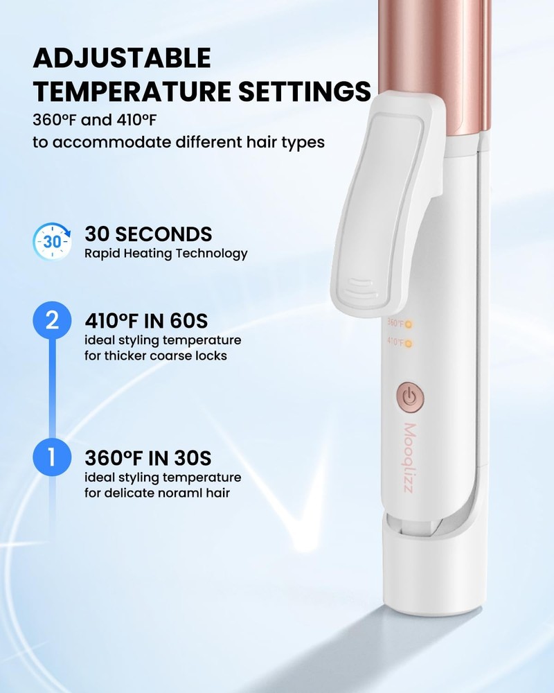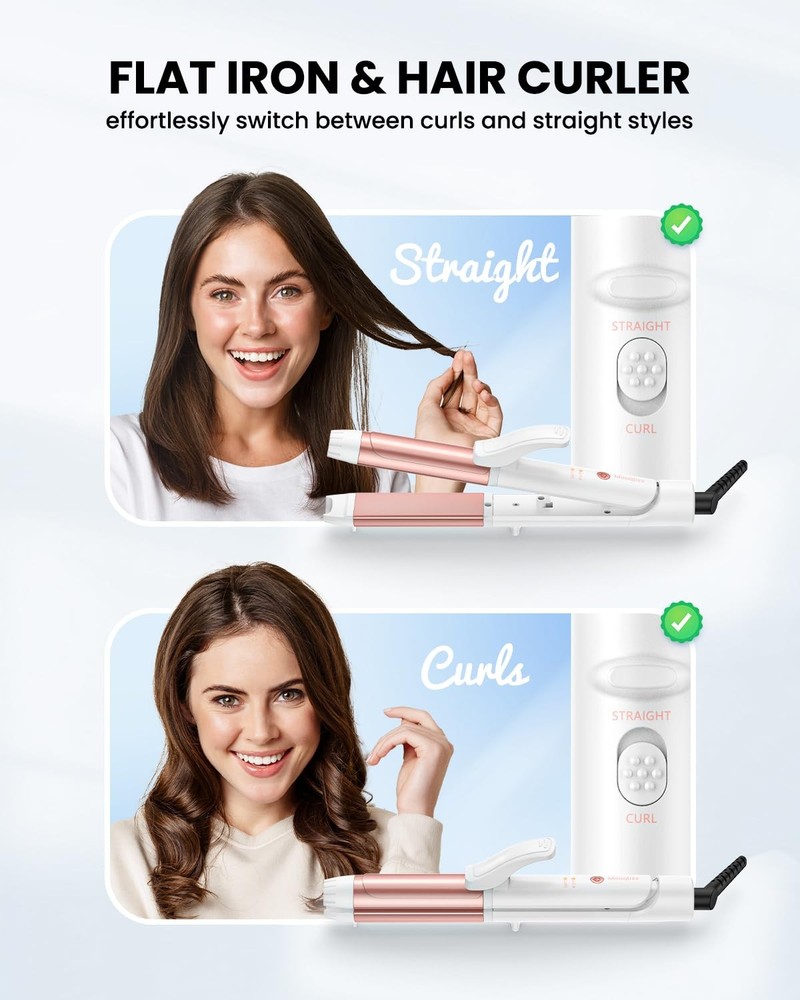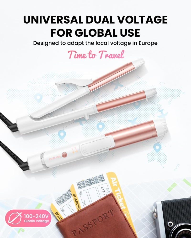 Dual Voltage Curling Iron, Travel Flat Iron Hair Curler in One for European, 1 1/4 Inch Ceramic Plates with Adjustable Temperature, White Travel-Friendly 2 in 1 Design: Space-saving and versatile. Eliminate the need to pack multiple styling tools that lets you effortlessly switch between curly and straight hairstyles. Perfect for travelers looking to minimize their packing without compromising style. NOTICE: Press and hold for three seconds to turn on. Universal Dual Voltage for Global Use: Designed for the international traveler, this curling iron features 100-240V dual voltage. Designed to adapt automatically to the local voltage in Europe and beyond, it eliminates the need for a transformer, ensuring you can achieve your perfect hairstyle anywhere in the world. Adjustable Temperature Settings: With two heat settings, 360°F for delicate noraml hair and 410°F for thicker coarse locks, it caters to all hair types. This allows for personalized styling that protects your hair from heat damage, ensuring healthy-looking results. Rapid Heating Technology: Achieve your desired look in no time with our fast-heating PTC technology. The ceramic coating ensures even heat distribution, reducing styling time and minimizing hair damage for quicker, more effective styling sessions. Travel-Friendly Safety Features: Features include 60mins auto shut-off, a tangle-free swivel cord, a lockable design for compact storage, and cooling tips, plus a heat-resistant glove. It's engineered for both safety and convenience, offering peace of mind while styling on the go.