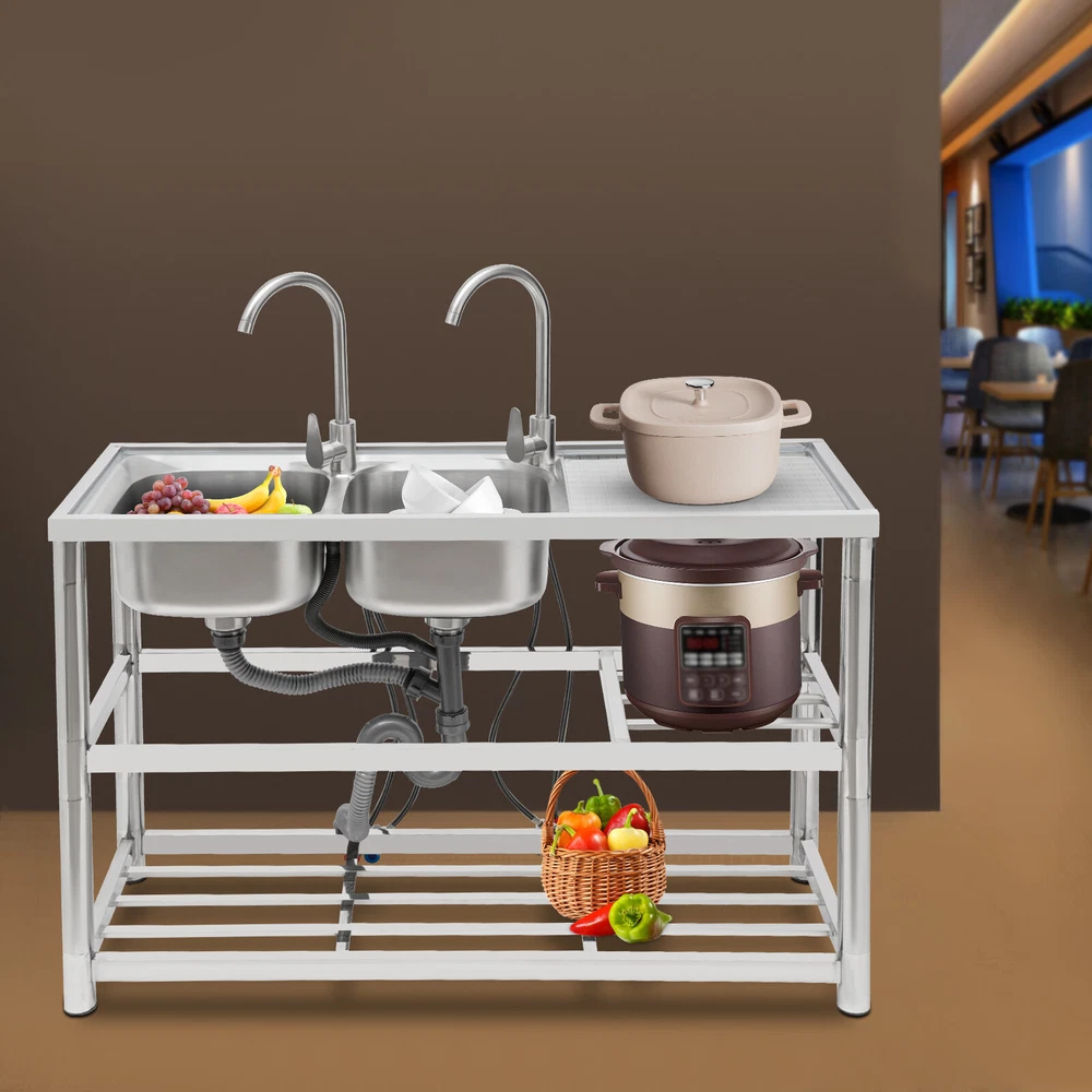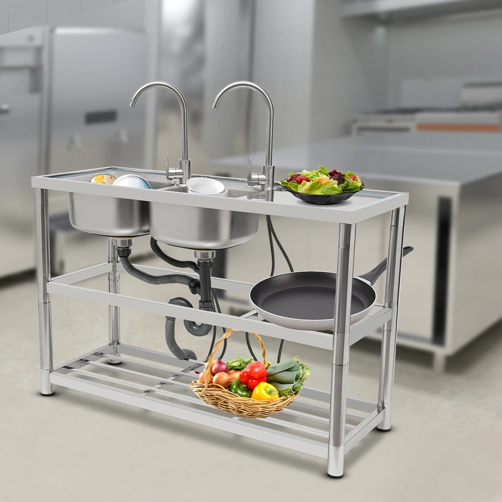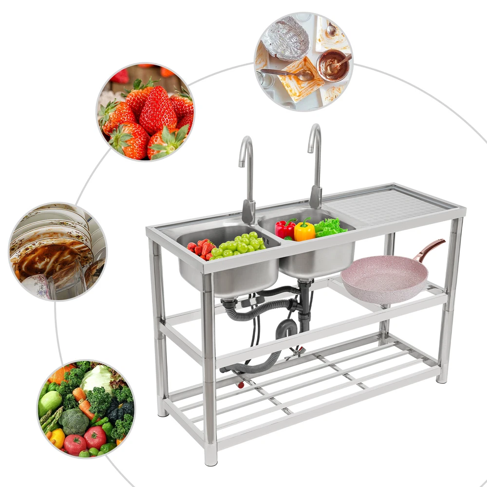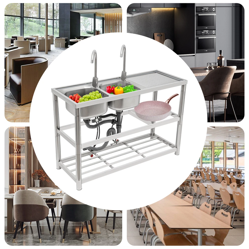 Package Included 1*Double-Bowl Sink 2*Faucets 4*Water Inlet Pipes 3*Drainage Pipes 1Pair* Gloves All Accessories for Assembly Dual-bowl Commercial Kitchen Sink Stainless Steel Restaurant Sink Free Standing Description This 201 stainless steel kitchen sink is sturdy and durable. Its modern and simple appearance can fit various decorations, suitable for kitchens, garages, labs, balconies, and so on. It has a solid rectangular structure and strong load-bearing capacity. The open countertop, roomy sink, utility drainage devices, inlet pipes, 360° rotatable faucets, and storage shelve make this product convenient to use. Key Features Sturdy and Durable : 201 Stainless steel material combined with exquisite wire drawing and polishing processes makes the sink resistant to rust and high temperatures, strong and durable. Strong Bearing Capacity : High-quality material, rectangular structure, and thickened square&round pipes make the countertop support up to 220.5 lbs and each shelf support up to 55.1 lbs, so you can rest assured to use it without worrying about collapsing. Convenient Faucets: The two 360° rotatable faucets with cold and hot water inlet pipes and handles for temperature/water flow adjustment allow you to wash at different angles and temperatures, meeting your various demands. User-friendly Design : The right height(31.5in) allows you to say goodbye to bending over to clean dishes. The enlarged drain opening ensures quick drainage to avoid long waiting or blocking. The basket with a lid can keep large residues flowing into the pipe, preventing the sewage pipe from being blocked while making it convenient for storing water. Plenty of Space: Two spacious sinks (13*13*7.1in) can accommodate large bowls or wash dishes, which can meet daily washing needs. The countertop has enough space for daily prepping or chopping. The lower shelves are very convenient for storing cookware, washing equipment, or other kitchen utensils. Complete Set: This complete sink kit includes 2 sinks, 2 faucets, 3 drain pipes, 2 drainage strainers, 4 water inlet pipes, and a series of complete accessories, so you do not need to purchase them separately while ensuring easy installation. Easy to Clean : The rounded corner is hard to hide dirt, together with the smooth surface and simple structure, you can rinse the sink with clean water. Protective Package : To prevent the product from being damaged during transportation, we packed it with foam to protect your products to the maximum extent possible. Customer Service : We aim to provide quality products and services. If you have any problems, please feel free to contact us. We will reply and solve the problem for you as soon as possible. Details Overflow Holes : The design of the high overflow holes prevents water from overflowing due to forgetting to turn off the faucet, and protects a dry floor. Raised Edges : The use of raised edges can significantly prevent overflow and maintain an elegant and streamlined appearance. Seal Ring : It ensures a tight connection and prevents leakage. Application It can be widely used in homes, kitchens, backyards, garages, balconies, laundry rooms, restaurants, hotels, cafes, and other indoor and outdoor places. Specifications Color: Silver Style: Modern Shape: Rectangular Material: 201 Stainless Steel, PVC Surface Treatment: Wire Drawing, Polishing Installation Type: Freestanding Assembly Required: Yes Number of Sinks: 2 Each Sink Size: 33*33*18cm/13*13*7.1in Product Size: 120*45*80cm/47*17.7*31.5in Countertop Length: 40cm/15.7in Tier Spacing: 34cm/13.5in; 30cm/12in Drainage Pipe Size (D* L): 42mm*65cm/1.65*25.59in Water Inlet Pipe Length: 80cm/31.5in Square Tube Thickness: 38mm/1.5in Round Tube Diameter: 48mm/1.89in Countertop Maximum Load Capacity: 100kg/220.5lbs Each Shelf Bearing Capacity: 25kg/55.1lbs Gross Weight: 13.6kg/30lbs Package Size: 125*49.5*33cm/49.2*19.5*13in Package Included 1*Double-Bowl Sink 2*Faucets 4*Water Inlet Pipes 3*Drainage Pipes 1Pair* Gloves All Accessories for Assembly Notes Please note the sinks of this product are on the left. Please check the size carefully before ordering. Please do not scratch its surface with sharp objects for a longer service life. Please allow the slight color difference caused by the shooting light and 1-3 cm error due to manual measurement, and make sure you do not mind before ordering. Payment Delivery details Terms of sales About us Contact us Payment We accept ebay payment 。 Fees such as import duties, taxes are not included in the item price or shipping costs. These charges are the buyer's responsibility. Delivery details Shipping: 2-9 working days to: USA Terms of sales We maintain high standards of excellence and strive for hundred percent customer satisfaction. Feedback is very important to us. We hope that you contact us immediately before you give neutral or negative feedback, so that we can address your concerns. It is impossible to address issues if we do not know about them! About us Your satis faction is our ultimate goal. We work hard to earn your trust and future business. Our certified technicians have tested each item before shipping. The unit comes with 1 year limited warranty on all manufacturing defects. a) If you receive a defective item, you may return it or ask for a discount. Please contact us within 14 days after you receive the package. b) What you returned must be intact and in its original packaging as re? u. Customer is responsible for shipping costs of the returned item. c) We will cover the cost of shipping back t with the shipping rate indicated in the registration page. We will send you a new unit or refund the full payment you paid. Thank you. Contact us Business Hour Business Hour: Monday To Friday: 8:30 AM to 5:00 PM (Beijing China time) Due to time zones, our reply to your questions may not be immediately. But within above working time, we will reply your email within 24 hours. If it's non-workdays, please kindly be patient and wait 