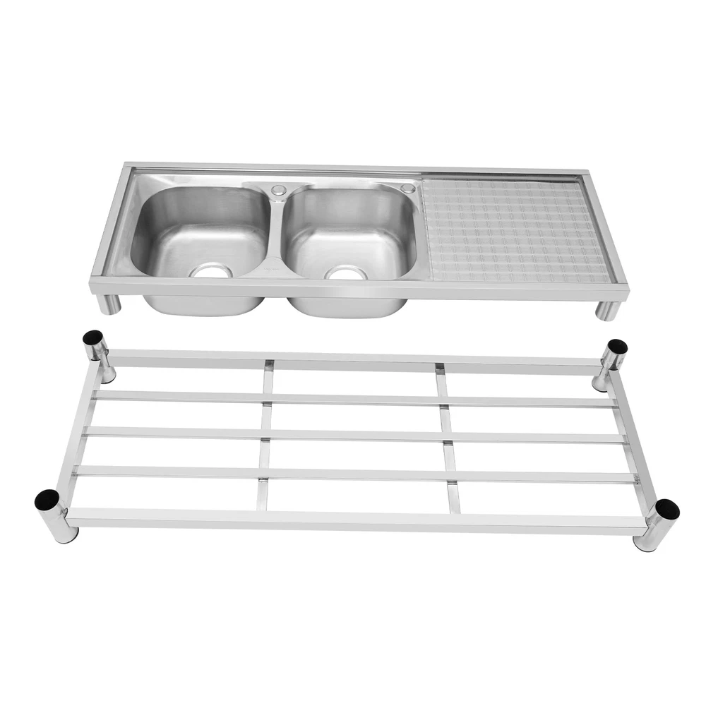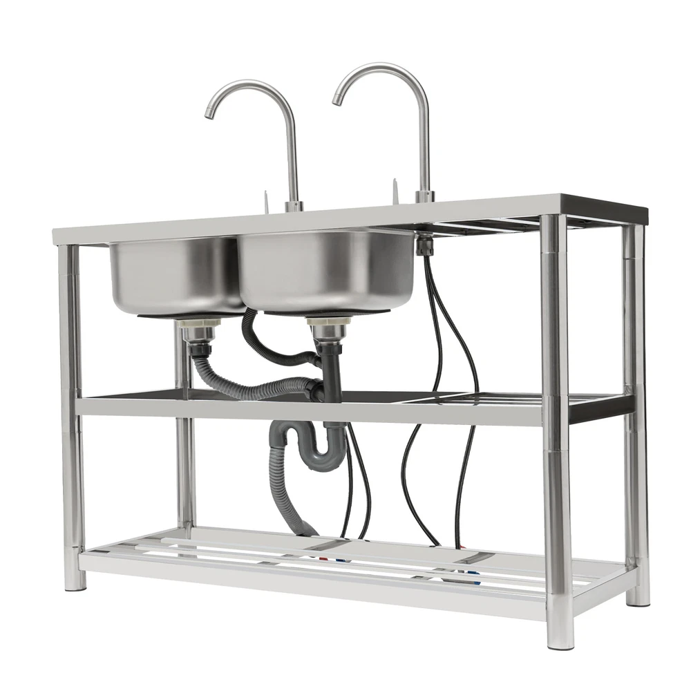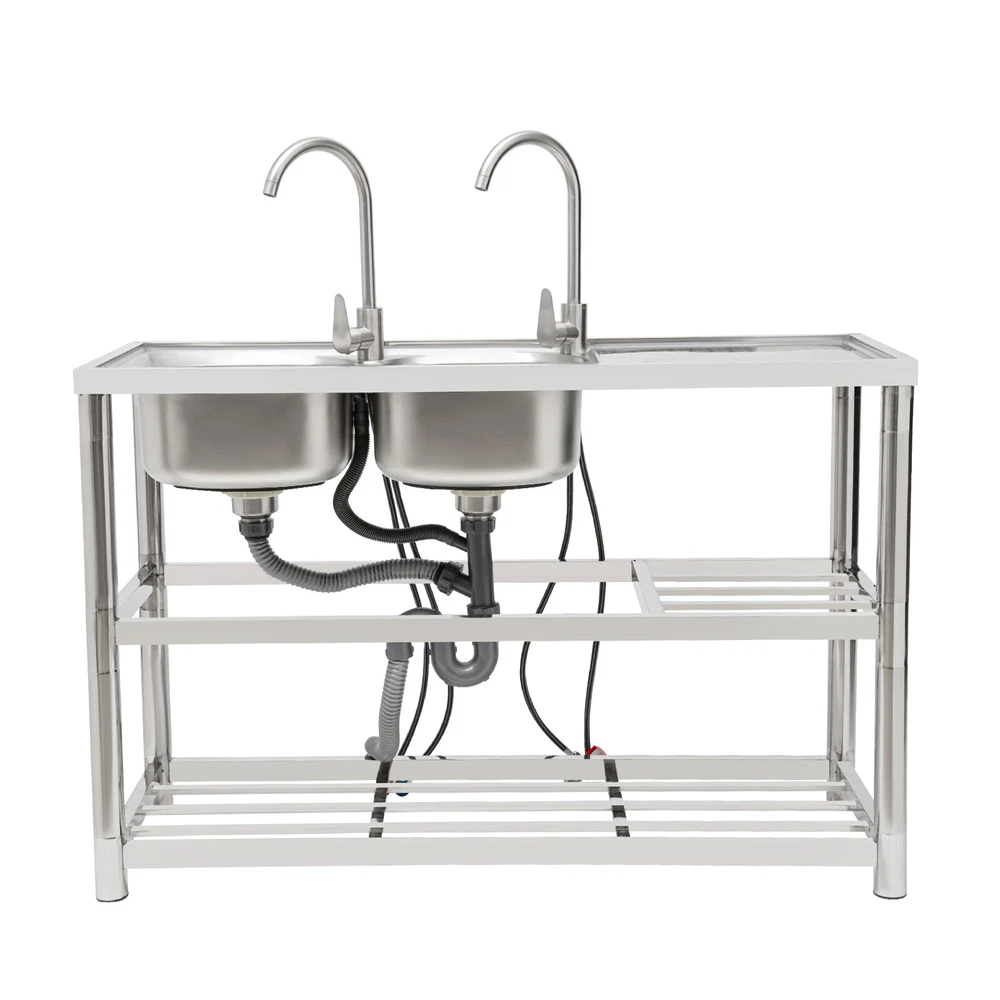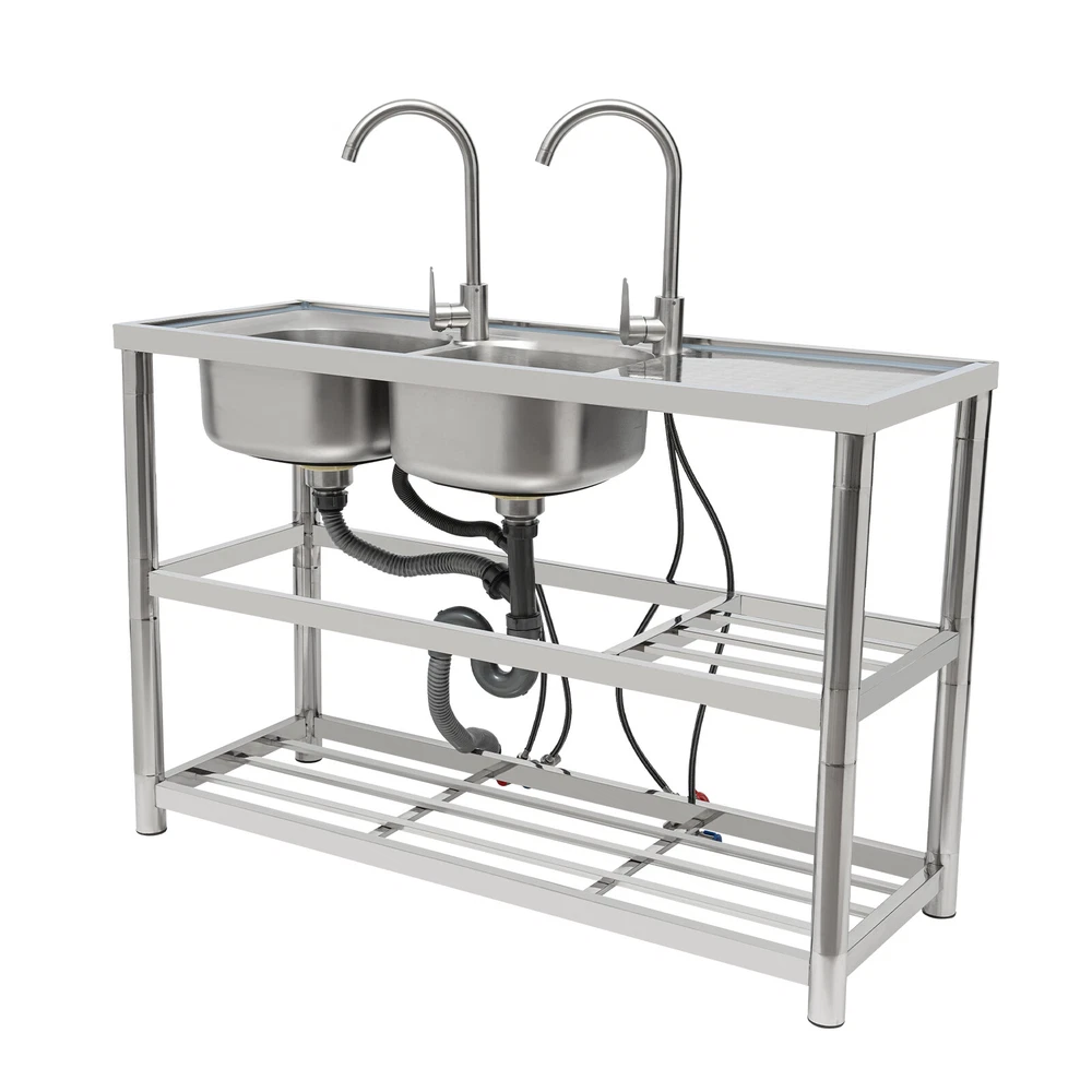 Package Included 1*Double-Bowl Sink 2*Faucets 4*Water Inlet Pipes 3*Drainage Pipes 1Pair* Gloves All Accessories for Assembly Dual-bowl Commercial Kitchen Sink Stainless Steel Restaurant Sink Free Standing Description This 201 stainless steel kitchen sink is sturdy and durable. Its modern and simple appearance can fit various decorations, suitable for kitchens, garages, labs, balconies, and so on. It has a solid rectangular structure and strong load-bearing capacity. The open countertop, roomy sink, utility drainage devices, inlet pipes, 360° rotatable faucets, and storage shelve make this product convenient to use. Key Features Sturdy and Durable : 201 Stainless steel material combined with exquisite wire drawing and polishing processes makes the sink resistant to rust and high temperatures, strong and durable. Strong Bearing Capacity : High-quality material, rectangular structure, and thickened square&round pipes make the countertop support up to 220.5 lbs and each shelf support up to 55.1 lbs, so you can rest assured to use it without worrying about collapsing. Convenient Faucets: The two 360° rotatable faucets with cold and hot water inlet pipes and handles for temperature/water flow adjustment allow you to wash at different angles and temperatures, meeting your various demands. User-friendly Design : The right height(31.5in) allows you to say goodbye to bending over to clean dishes. The enlarged drain opening ensures quick drainage to avoid long waiting or blocking. The basket with a lid can keep large residues flowing into the pipe, preventing the sewage pipe from being blocked while making it convenient for storing water. Plenty of Space: Two spacious sinks (13*13*7.1in) can accommodate large bowls or wash dishes, which can meet daily washing needs. The countertop has enough space for daily prepping or chopping. The lower shelves are very convenient for storing cookware, washing equipment, or other kitchen utensils. Complete Set: This complete sink kit includes 2 sinks, 2 faucets, 3 drain pipes, 2 drainage strainers, 4 water inlet pipes, and a series of complete accessories, so you do not need to purchase them separately while ensuring easy installation. Easy to Clean : The rounded corner is hard to hide dirt, together with the smooth surface and simple structure, you can rinse the sink with clean water. Protective Package : To prevent the product from being damaged during transportation, we packed it with foam to protect your products to the maximum extent possible. Customer Service : We aim to provide quality products and services. If you have any problems, please feel free to contact us. We will reply and solve the problem for you as soon as possible. Details Overflow Holes : The design of the high overflow holes prevents water from overflowing due to forgetting to turn off the faucet, and protects a dry floor. Raised Edges : The use of raised edges can significantly prevent overflow and maintain an elegant and streamlined appearance. Seal Ring : It ensures a tight connection and prevents leakage. Application It can be widely used in homes, kitchens, backyards, garages, balconies, laundry rooms, restaurants, hotels, cafes, and other indoor and outdoor places. Specifications Color: Silver Style: Modern Shape: Rectangular Material: 201 Stainless Steel, PVC Surface Treatment: Wire Drawing, Polishing Installation Type: Freestanding Assembly Required: Yes Number of Sinks: 2 Each Sink Size: 33*33*18cm/13*13*7.1in Product Size: 120*45*80cm/47*17.7*31.5in Countertop Length: 40cm/15.7in Tier Spacing: 34cm/13.5in; 30cm/12in Drainage Pipe Size (D* L): 42mm*65cm/1.65*25.59in Water Inlet Pipe Length: 80cm/31.5in Square Tube Thickness: 38mm/1.5in Round Tube Diameter: 48mm/1.89in Countertop Maximum Load Capacity: 100kg/220.5lbs Each Shelf Bearing Capacity: 25kg/55.1lbs Gross Weight: 13.6kg/30lbs Package Size: 125*49.5*33cm/49.2*19.5*13in Package Included 1*Double-Bowl Sink 2*Faucets 4*Water Inlet Pipes 3*Drainage Pipes 1Pair* Gloves All Accessories for Assembly Notes Please note the sinks of this product are on the left. Please check the size carefully before ordering. Please do not scratch its surface with sharp objects for a longer service life. Please allow the slight color difference caused by the shooting light and 1-3 cm error due to manual measurement, and make sure you do not mind before ordering. Payment Delivery details Terms of sales About us Contact us Payment We accept ebay payment 。 Fees such as import duties, taxes are not included in the item price or shipping costs. These charges are the buyer's responsibility. Delivery details Shipping: 2-9 working days to: USA Terms of sales We maintain high standards of excellence and strive for hundred percent customer satisfaction. Feedback is very important to us. We hope that you contact us immediately before you give neutral or negative feedback, so that we can address your concerns. It is impossible to address issues if we do not know about them! About us Your satis faction is our ultimate goal. We work hard to earn your trust and future business. Our certified technicians have tested each item before shipping. The unit comes with 1 year limited warranty on all manufacturing defects. a) If you receive a defective item, you may return it or ask for a discount. Please contact us within 14 days after you receive the package. b) What you returned must be intact and in its original packaging as re? u. Customer is responsible for shipping costs of the returned item. c) We will cover the cost of shipping back t with the shipping rate indicated in the registration page. We will send you a new unit or refund the full payment you paid. Thank you. Contact us Business Hour Business Hour: Monday To Friday: 8:30 AM to 5:00 PM (Beijing China time) Due to time zones, our reply to your questions may not be immediately. But within above working time, we will reply your email within 24 hours. If it's non-workdays, please kindly be patient and wait 