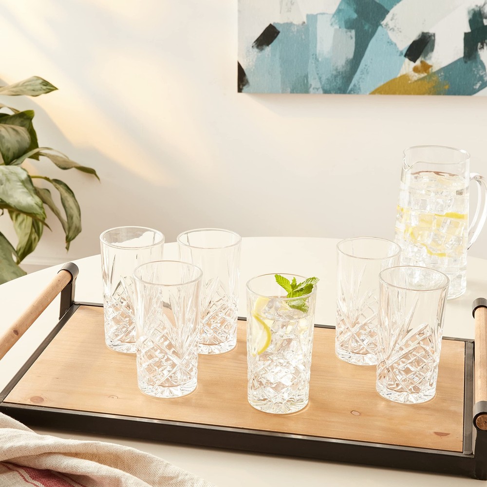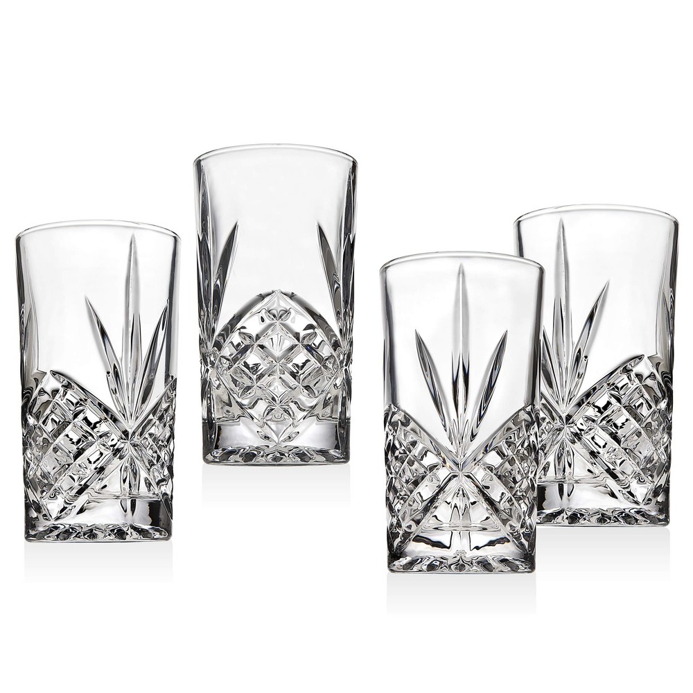Famous quality and value. Set of 12 high ball glasses. This elegant Dublin barware can be used for many types of beverages. These heavy weight crystal glasses make a wonderful wedding or house-warming gift. The high balls are just one of the many sizes and styles available in the Dublin pattern.