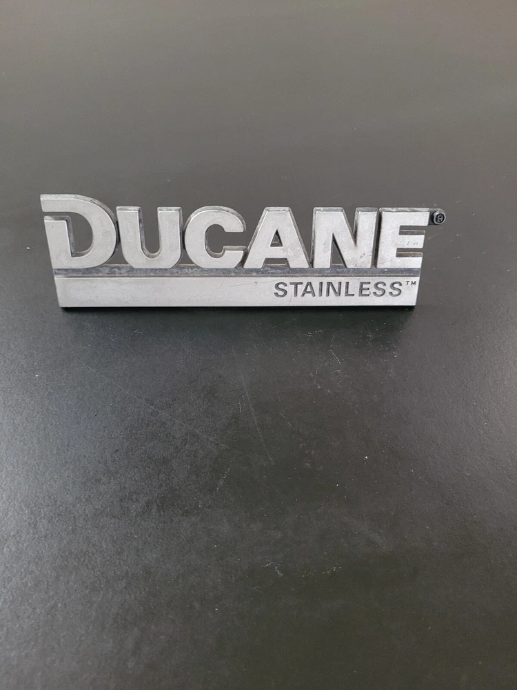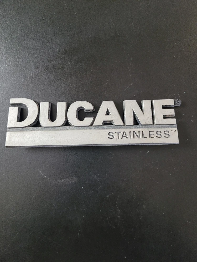 Ducane Stainless Logo Plate 5 3/4" for Grill Mancave Decor Add some personality to your mancave decor with this Ducane Stainless Logo Plate. Measuring at 5 3/4 inches, it's the perfect size to hang on a wall or use as a decorative piece on a shelf. This piece is in good condition and does not have chips. There is some scratches and discoloration of the silver. (see pictures for details) As a true fan of the Ducane brand, this logo plate is a must-have for any collector or enthusiast. It's a unique piece that's sure to catch the eye of anyone who enters your space. Don't miss out on the opportunity to add some flair to your mancave with this one-of-a-kind Ducane Stainless Logo Plate.