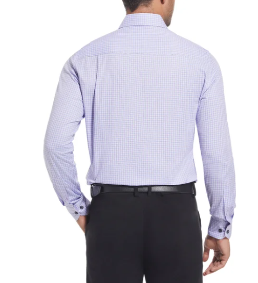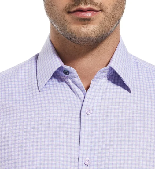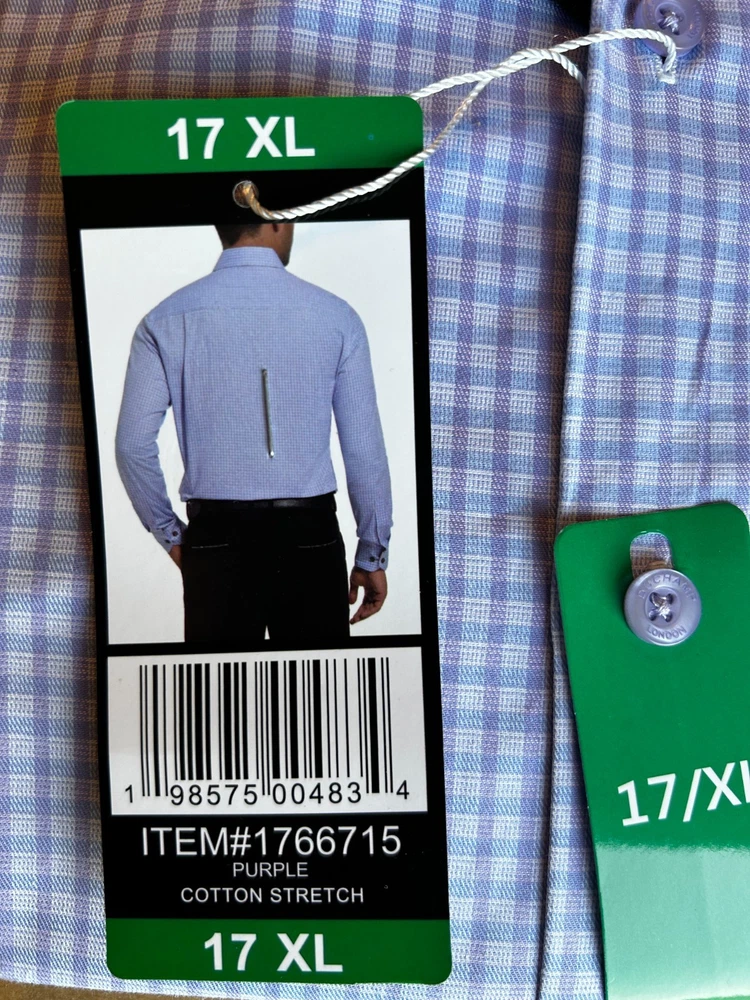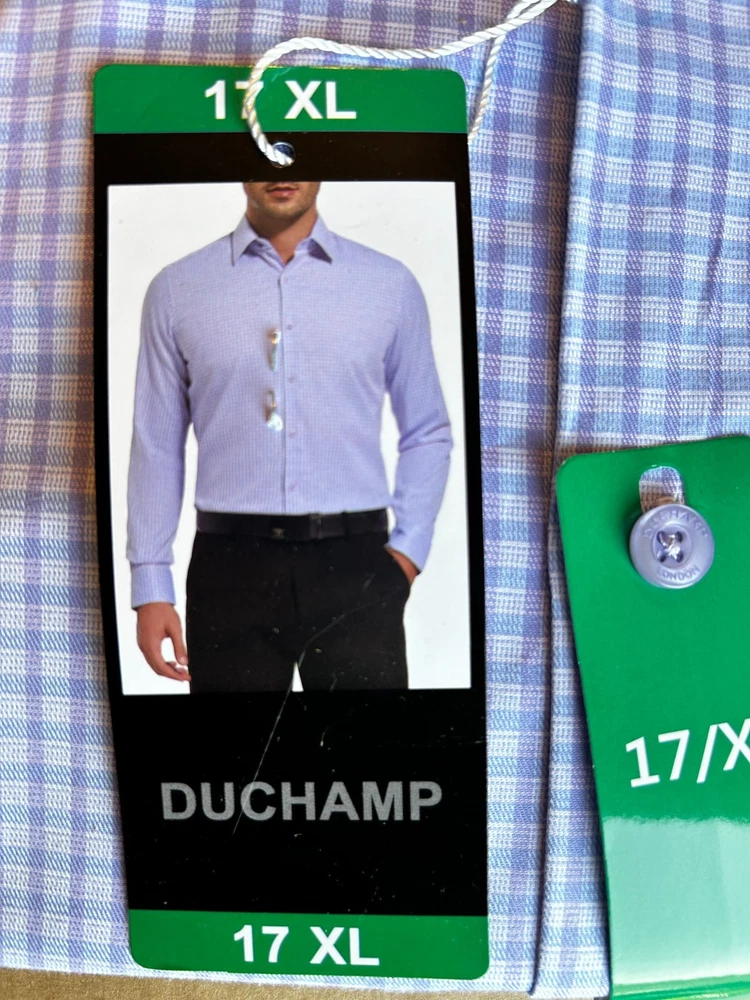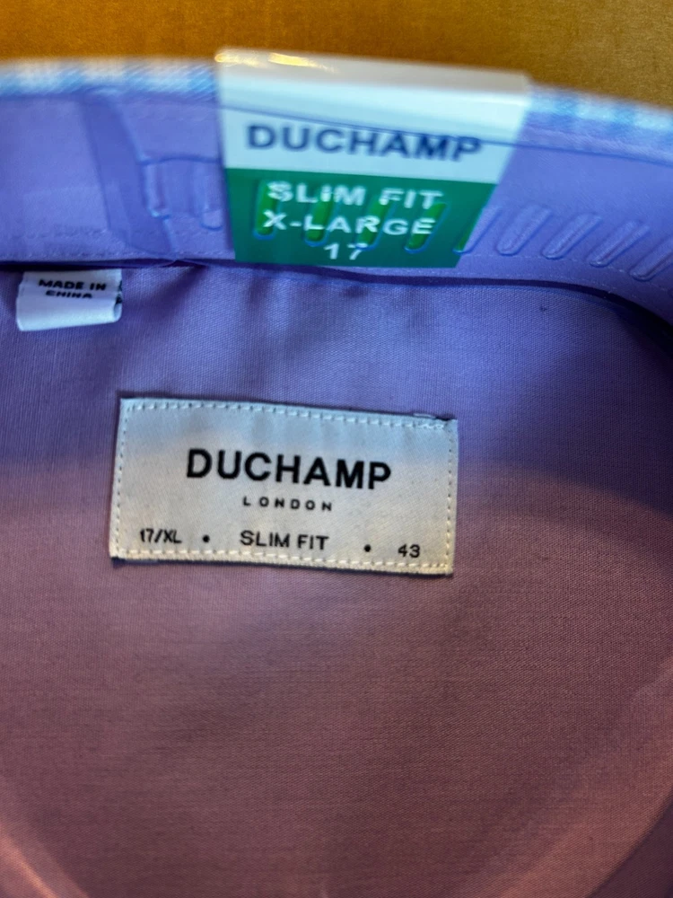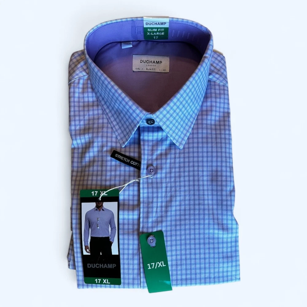 Features: Spread Collar Slim Fit Duchamp© Built-in collar stays Stretch fabric Contrast trim in collar, yoke, and cuffs Adjustable button cuffs with branded buttons Made in China Content: 97% Cotton | 3% Spandex Approximate 180 GSM (5.3oz) fabric weight Lightweight Sizing: Neck (in): 17 Sleeve (in): 35 7/8 Care Instructions: Machine wash Tumble dry