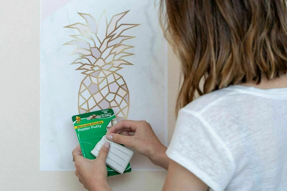 Duck Brand Reusable Removable Poster Putty for Mounting, 2 oz, White (1436912) Great for temporary mounting of paper items such as posters, charts and decorations, Duck Brand Poster Putty is removable and reusable. It is a safe, clean alternative to tape, nails, glues, tacks and staples won't damage mounting surface and will not dry out. It is non-toxic and non-staining on most nonporous surfaces. This white putty holds up to 1 lb. and works with a variety of surfaces. Poster putty is great for around the house or apartment, dorm rooms, classrooms and even the office - wherever you don't want to leave a mark while showing off your style and personality. Features Removable and reusable drawings and decorations up to 1 lb. Safe, easy alternative to nails, glues or staples Adheres to most clean, dry porous and non-porous surfaces like: wood, tile, linoleum, cinder block, brick, metal, plastic, porcelain, mirrors or glass Not recommended for use on flocked or loose wallpaper and on peeling or fresh paint Details Product Dimensions: 0.5118110236220473 x 3.818897638 x 5.748031496 inches Item Weight: 0.13 pounds Shipping Weight: 0.13 pounds Manufacturer: ShurTech Brands, LLC Domestic Shipping: Item can be shipped within U.S. Item color: White