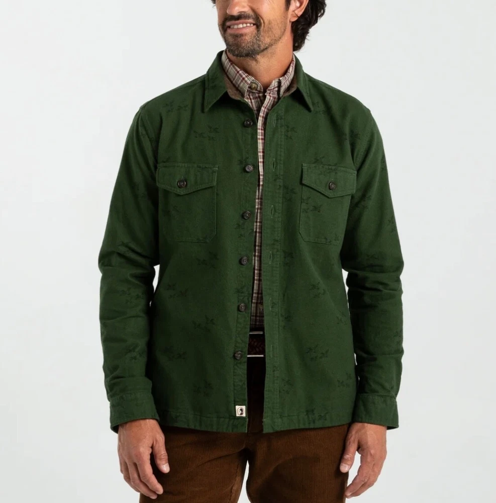 Pine Green Print The Slater moleskin shirt epitomizes versatile comfort and rugged style, designed to be worn effortlessly on its own or as a sophisticated layering piece. Crafted from luxurious moleskin fabric, this shirt offers a unique blend of durability and softness. Moleskin fabric is characterized by its dense weave and brushed surface, which not only provides exceptional warmth but also a velvety smooth texture that feels incredibly comfortable against the skin. Ideal for transitioning between seasons or for adding a touch of timeless charm to any outfit, this shirt features a classic button-up design with carefully considered details like side entry pockets and genuine horn buttons Details 100% Cotton 6.8oz Canvas Solid and Printing Colorways Spread Collar Chest Pockets with Button Closure Side Seam Pockets Horn Buttons Contrast Herringbone Interior Collar Stand, Back Yoke, and Top Placket Signature “z” Stitched Interior Top Placket Locker Loop on Back Yoke Placket Label