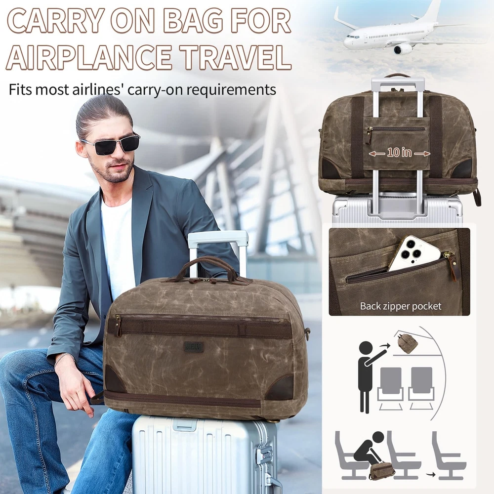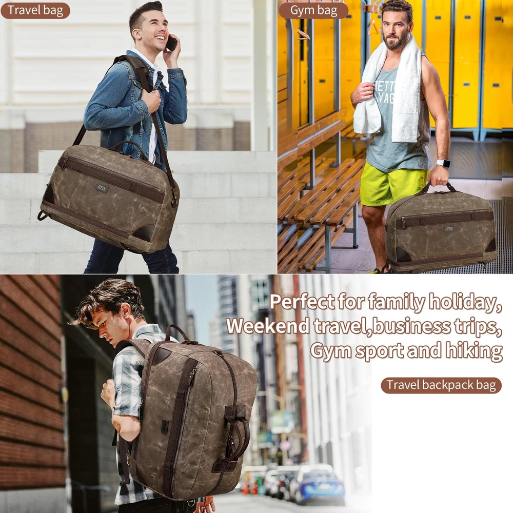 Duffel Bag for Travel: Convertible Weekender Overnight Bag Vintage Waxed Canvas Duffle Bag with Laptop Compartment, 3 in 1 Computer Backpack for Men Bags for Mens (Green) Product Details Color: Army Green Brand: Yamons MPN: Does not apply UPC: Does not apply EAN: Does not apply Product Dimensions: 20.4 x 10.6 x 13.7 inches Item Weight: 3.12 pounds Department: Men Manufacturer: Yamons Country of Origin: China Number of Compartments: 3 Item Weight: 1.42 Kilograms TRAVEL BAG & FREE TOILETRY BAG: 21.3"L * 11.8"W * 13"H that meets most international carry-on requirements. . And it comes with a free toiletry bag, which can helping you organize and maximize your space. It is a great gift for husbands and boyfriend's birthdays, wedding anniversary, Father's Day and Christmas. LARGE CAPACITY & LAPTOP COMPARTMENT: This Canvas travel bag has multiple zip pokects, help you pack easily and keep items organized. The laptop compartment is in the bottom pokect, the extra thickend sleeves well protect your electronics. 3 IN 1 CONVERTIBLE LAPTOP BAG: This duffle bag is not just a computer bag, it can also be a travel business backpack and the shoulder bag. Convertible duffle bag is designed with luggage sleeve, which can free your hands and keep your smartphone, ID card or passport inside easily when you're at the airport. PREMIUM VINTAGE WATERPROOF WAXED CANVAS MATERIAL:YAMONS overnight Bag is made of waxed canvas material.Waterproof material is pefectly protect your luggage. This vintage style is super cool for mens travel duffle bag. FINE CRAFTSMANSHIP: We are professional in bag making factory for more then 20 years. Providing the premium quality Bag and thoughtful design is all we purse. Please feel free to contact us for matter.
