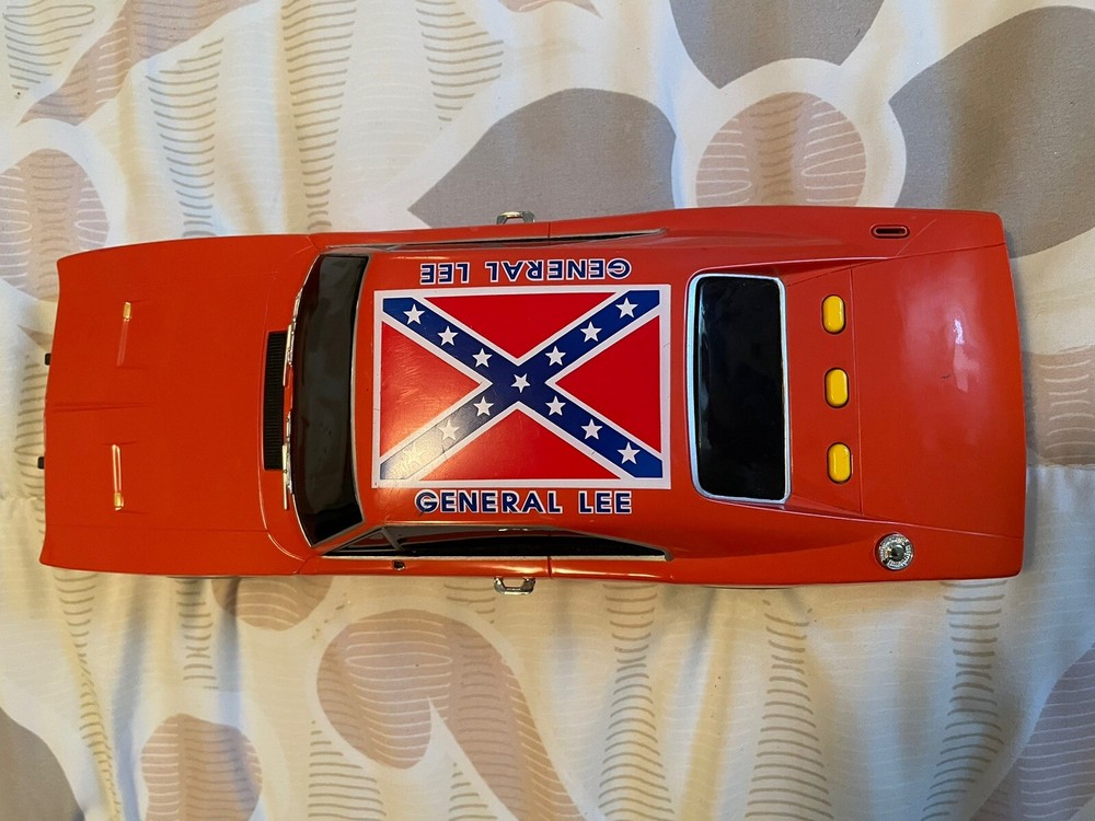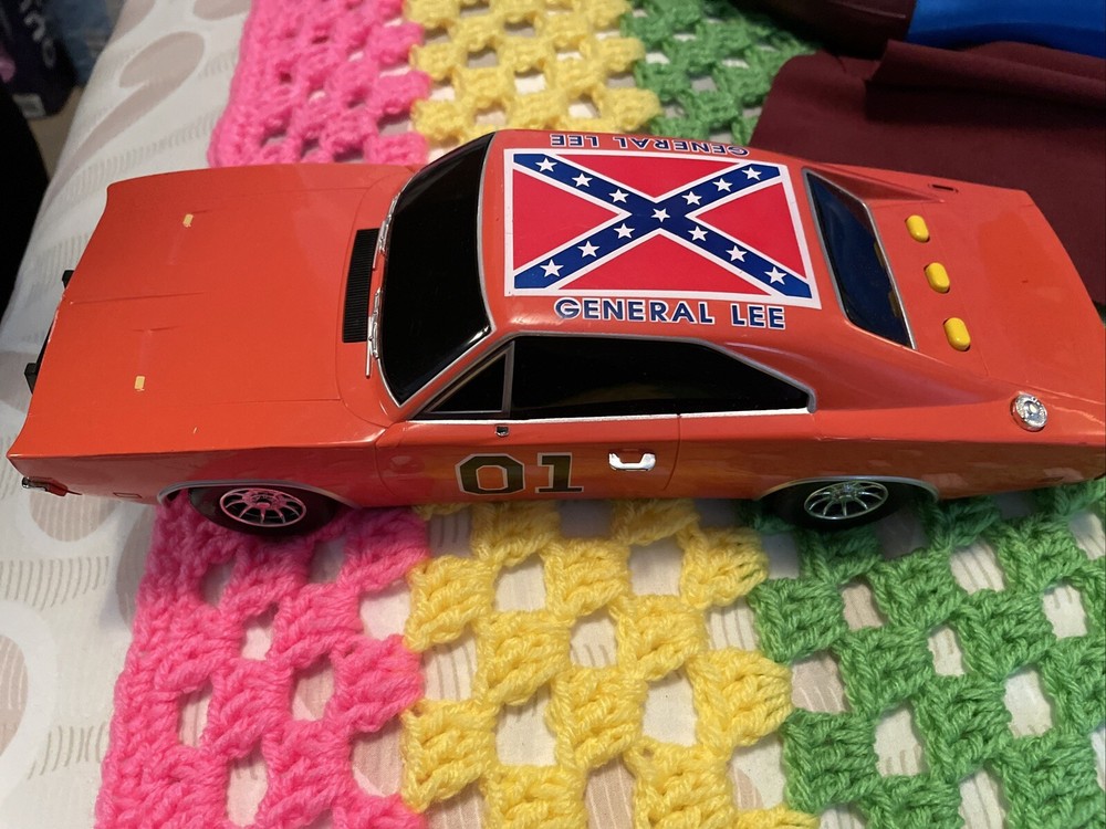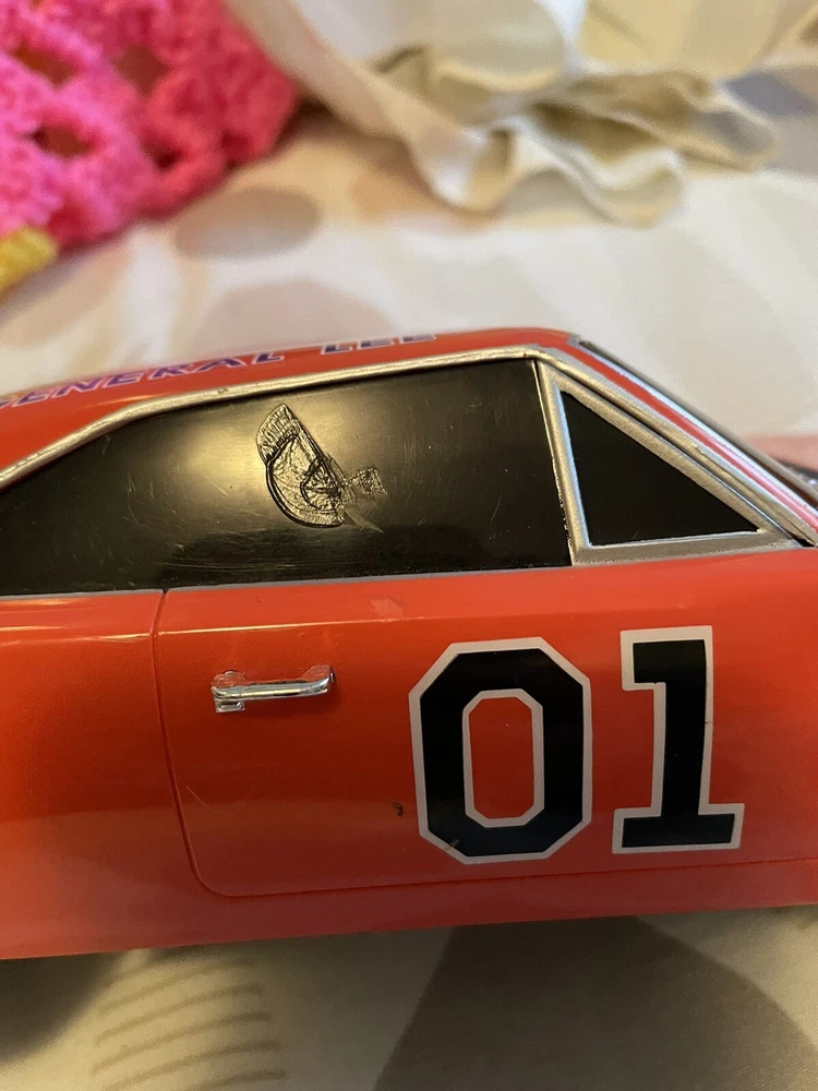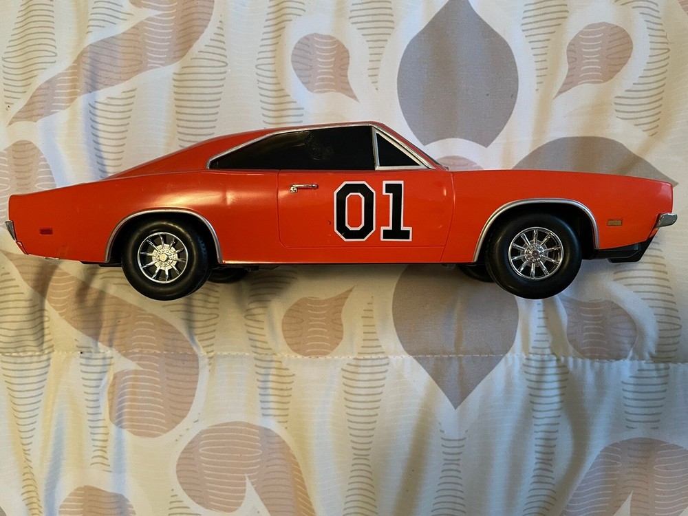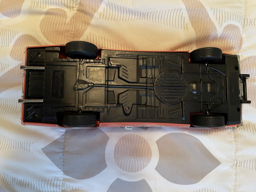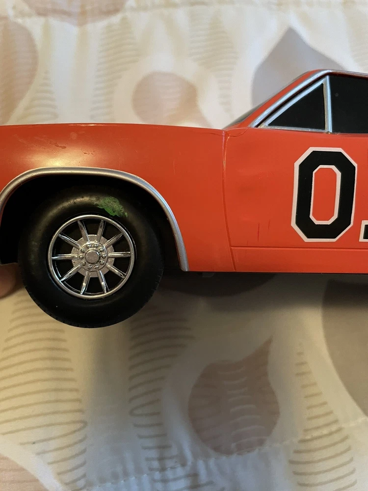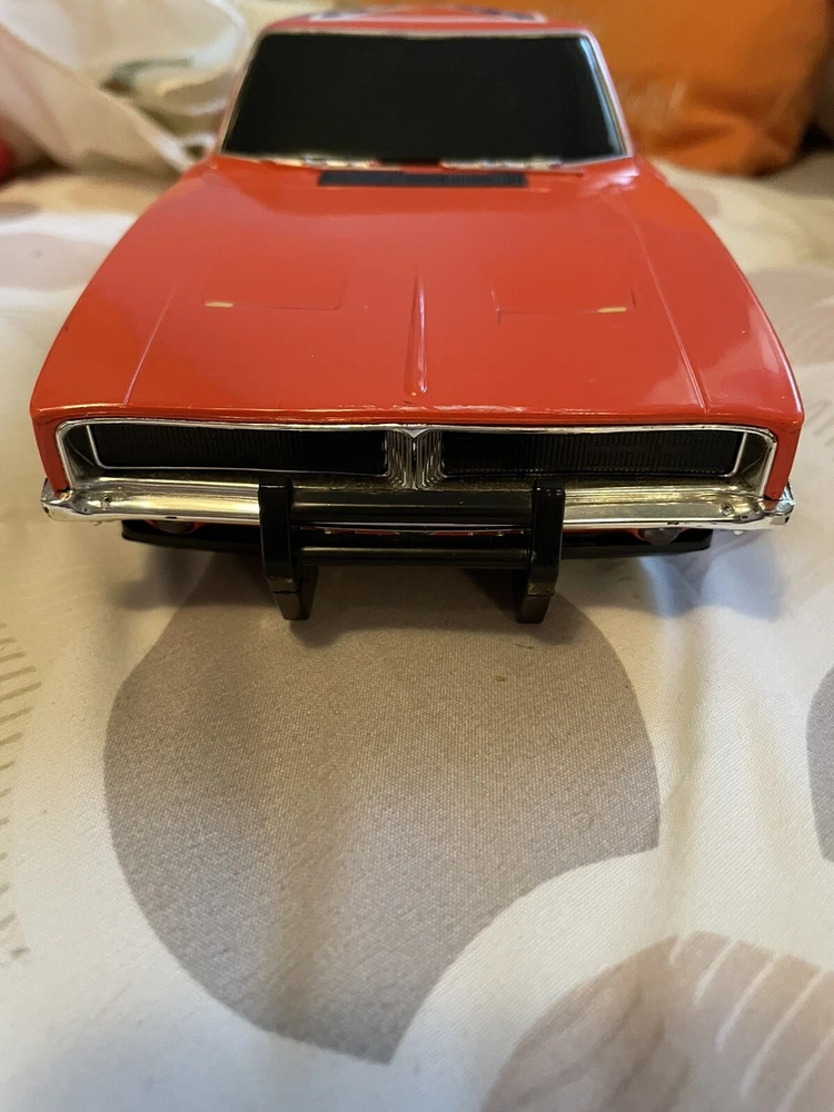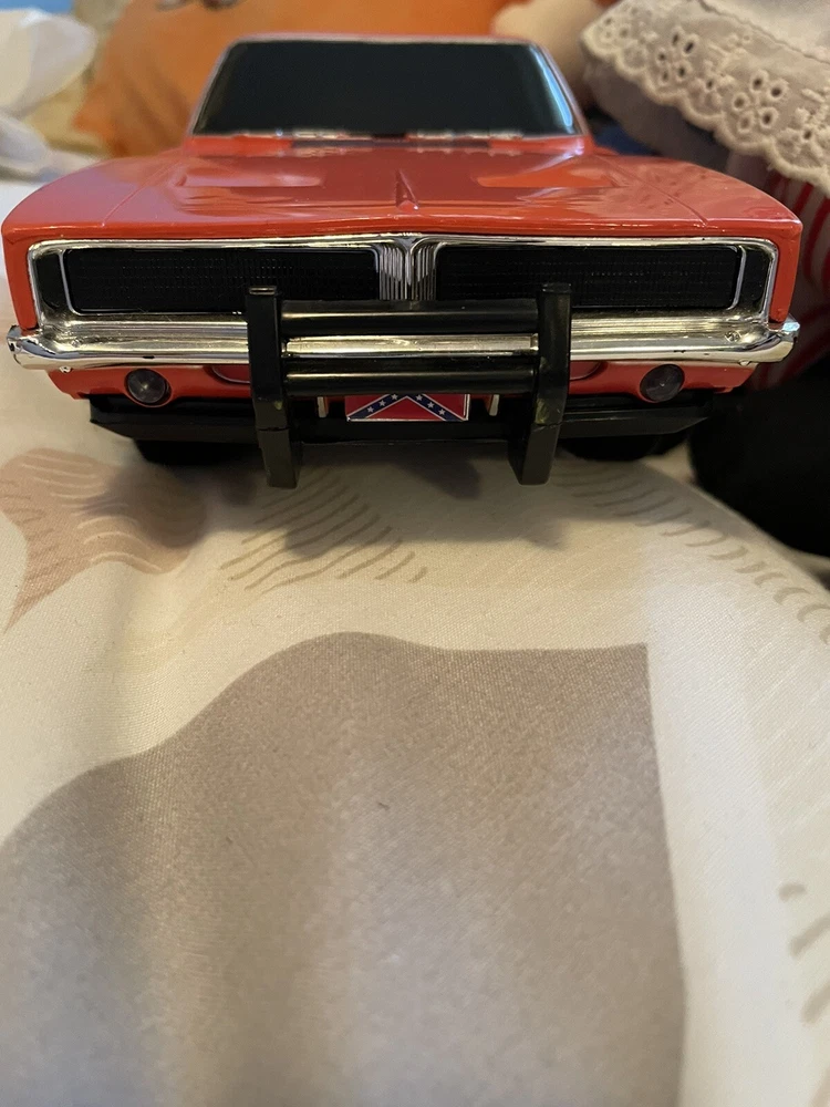 The product is a 1:18 scale Dodge Charger R/T model based on the Dukes of Hazzard TV series, specifically the General Lee vehicle. It is made of plastic and features sound and lights that work. The orange Dodge Charger represents a 1969 vehicle from the brand Malibu International, part of the DUKES OF HAZARD series. It is a collectible toy for fans of the show, offering a detailed replica with interactive elements for a fun play experience. Car is in good condition does have minor scrapes and scratches. Also missing door mirror. Has a spot on passenger window and trunk lid but still will display nicely. Sounds and lights work. Batteries not included. Ships only to the lower u.s. states. Thanks for looking