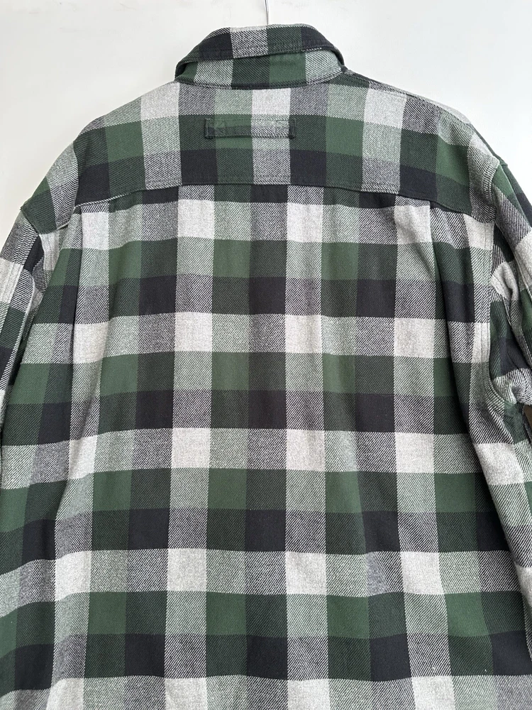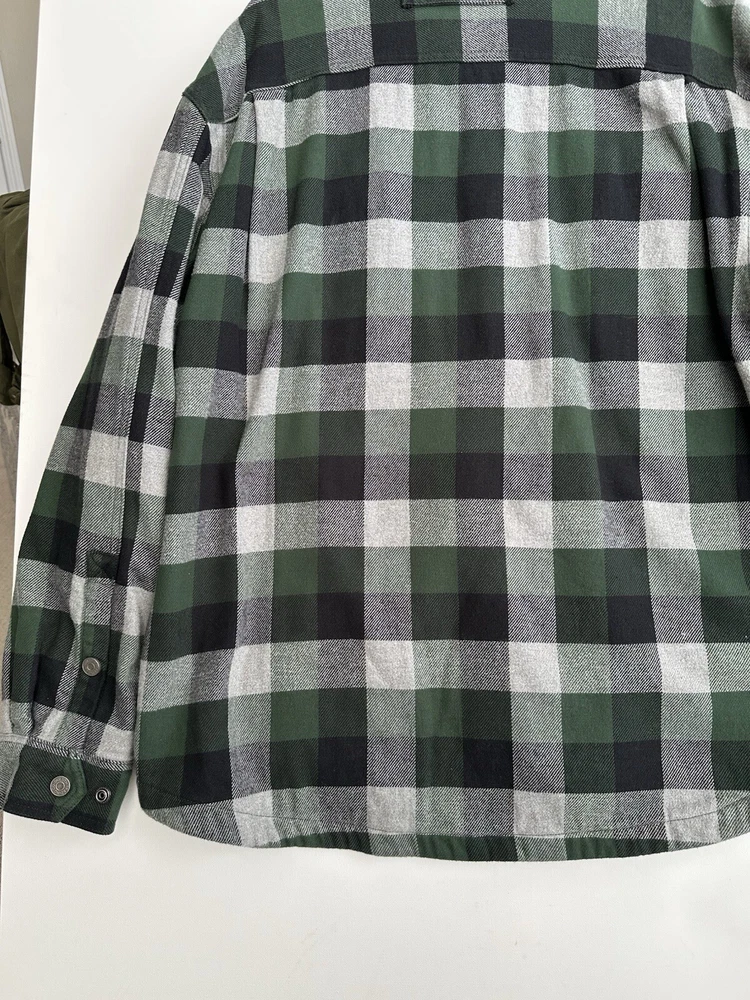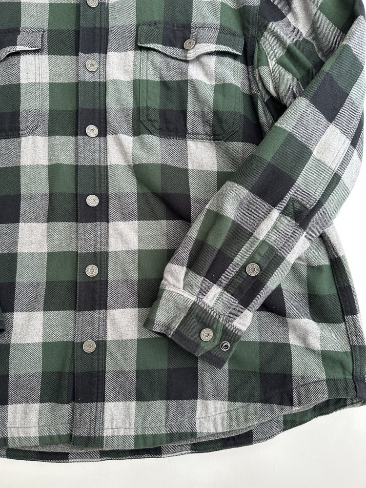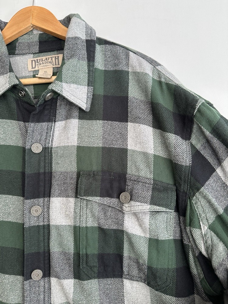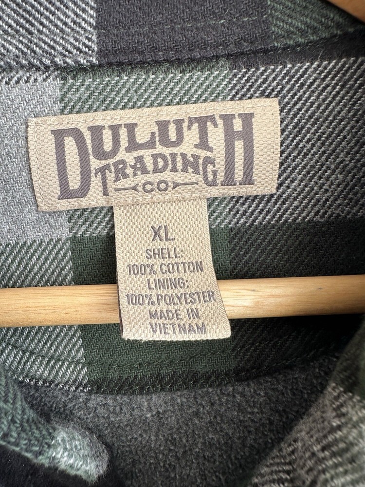 Duluth Trading Co Flannel Fleece Lined Heavy Shirt Jacket Plaid Size XL Shacket This is a heavy nice quality Shirt Jacket. Snap Closure. In very good condition - please refer to photos. Measurements laying flat: Pit to Pit 26.5" Shoulder Seam to Seam 20" Length 32" Shoulder Seam to Cuff 26"