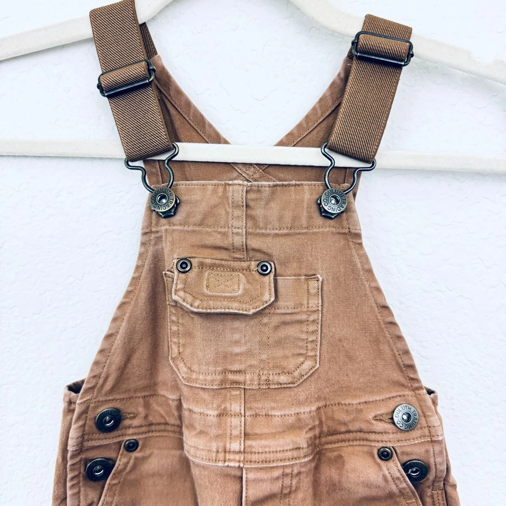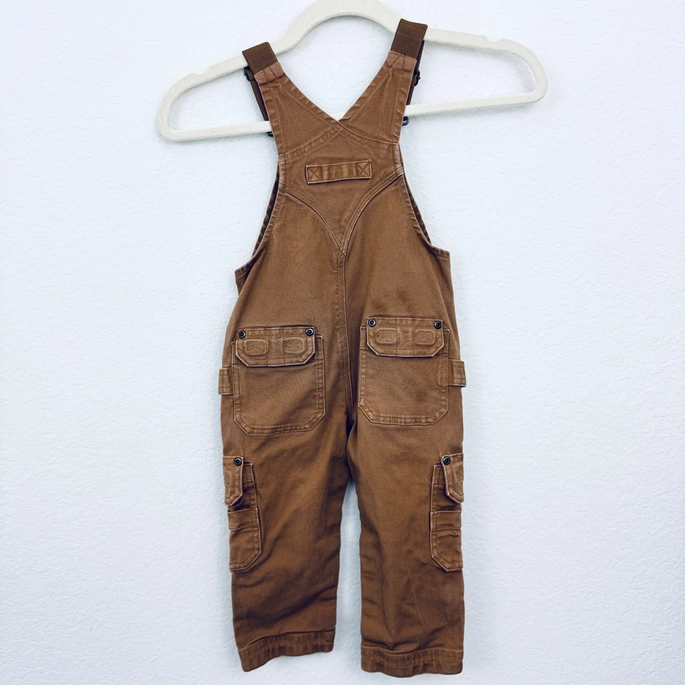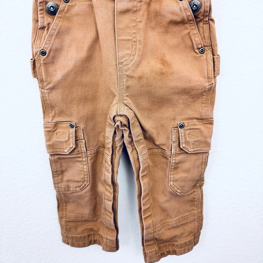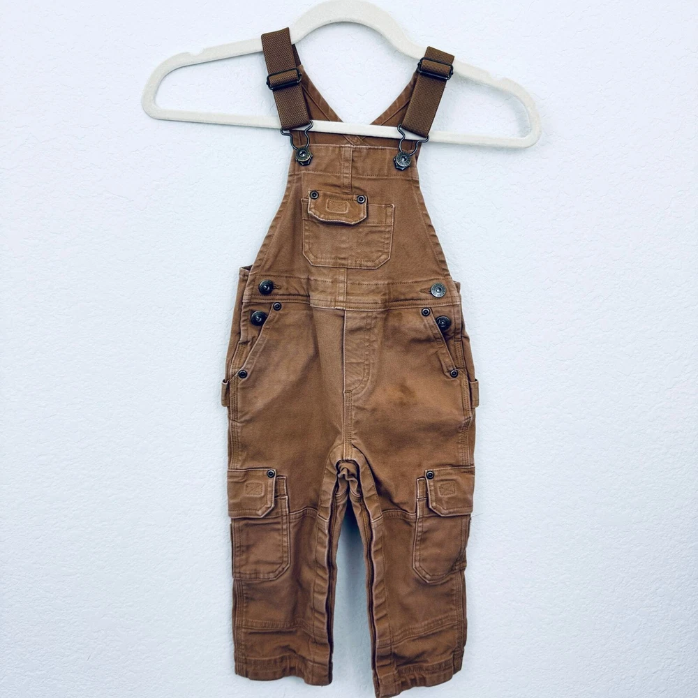 Size: 2T Measurements: Waist-10.5 in across, Inseam-12 in, Overall length (bib to cuff)-25 in Condition: In good pre-loved condition but with some discoloration on front-see photo. Features: Stretchy, adjustable shoulder straps Snap closures at legs Lots of pockets Light stretch in fabric