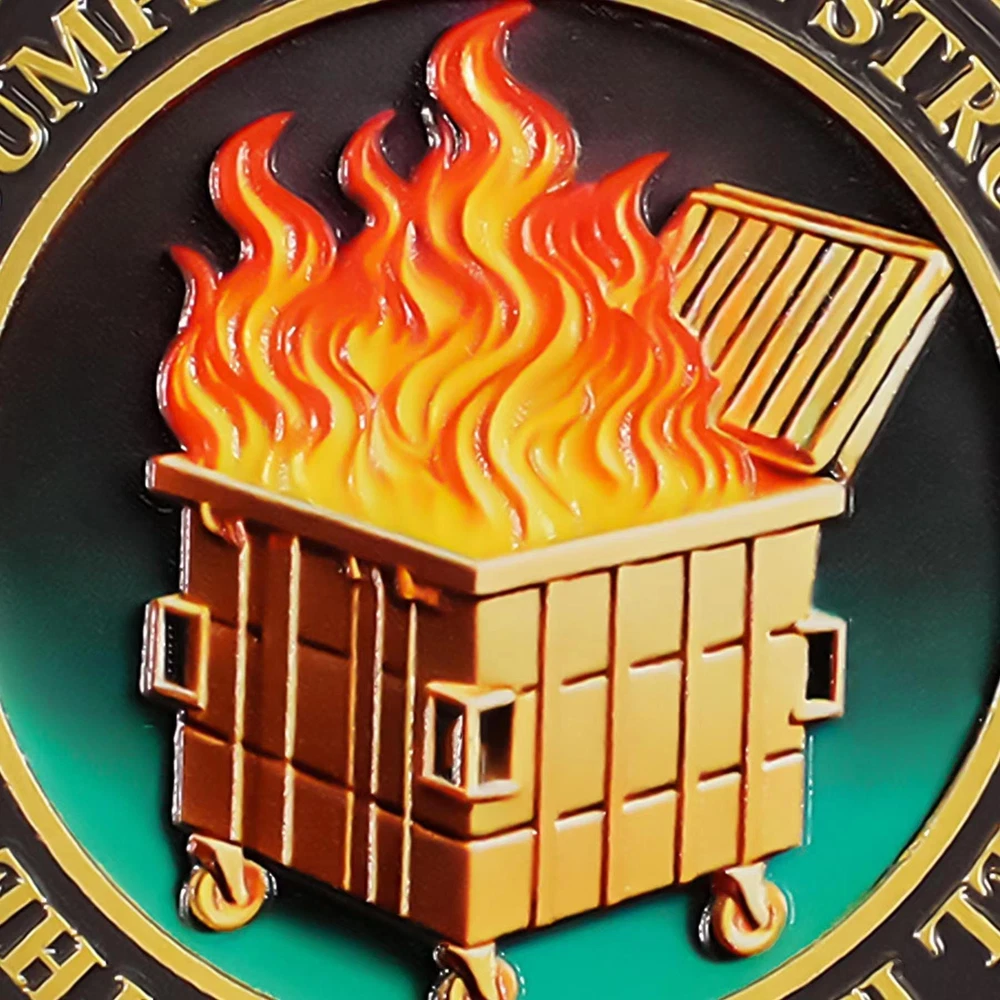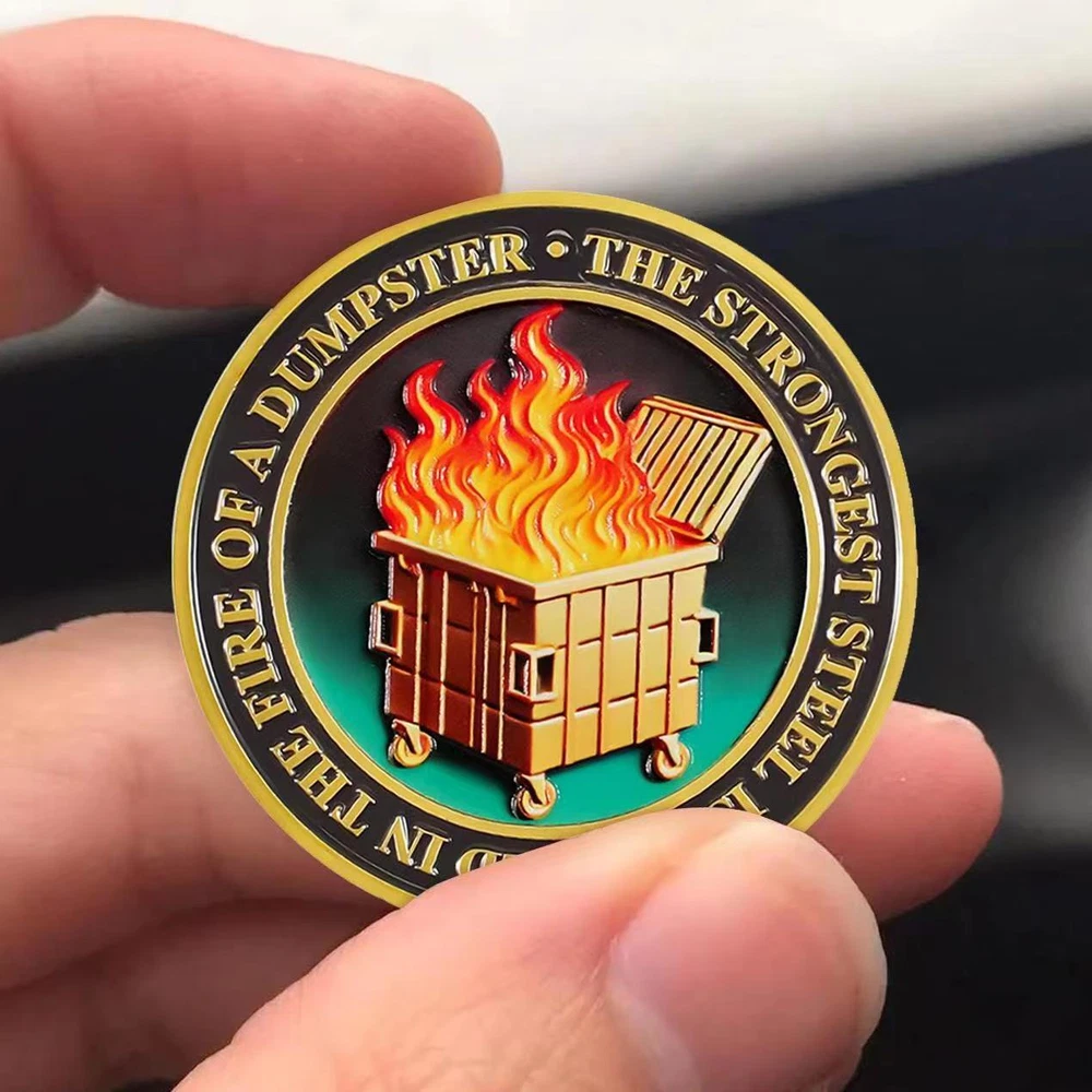 Dumpster Fire Challenge Coin For Going Away Colleagues Thanks Hilarious Gifts US About the item Our funny dumpster fire challenge coin is 1.57 inch in diameter and 0.12 inch in thickness, and it is colorful with 3D carving techniques, zinc alloy with gold plated. It's very easy to carry in your daily life, such as put it in a pocket, purse, backpack, or put it on display on any table or desktop. Celebrate resilience and humor with this unique Dumpster Fire Challenge Coin . A perfect combination of symbolism and wit, this coin features bold designs to remind us that even in the chaos of life, strength and growth emerge. Whether you're gifting this to someone who has endured tough times or adding it to your own collection, this coin is a lighthearted yet powerful token of perseverance. The front of the coin showcases a dumpster engulfed in flames, symbolizing the chaos of life’s challenges. Encircling the image is the phrase: " The Strongest Steel Is Forged in the Fire of a Dumpster " — a humorous yet profound message on finding strength in adversity. On the reverse side, the coin features a sturdy anvil and hammer , representing the forging process, symbolizing that strength and resilience are born from life’s difficulties. The matching phrase surrounds this side as well, reinforcing the idea that tough times create the strongest individuals. For decoration, it can elevate your home or office decor with a touch of fun. For collectibility, it is a must-have for themed coin collectors and joking memorabilia enthusiasts. As a gift, it can be a fantastic gift for fun lovers, or as a unique addition to any coin collection. Package contains: 1/2/10 pieces