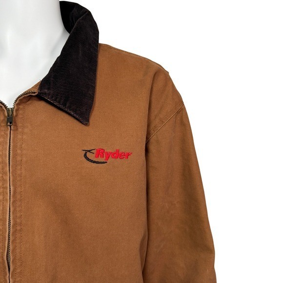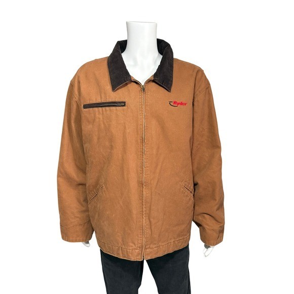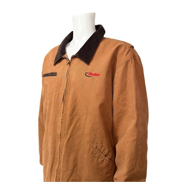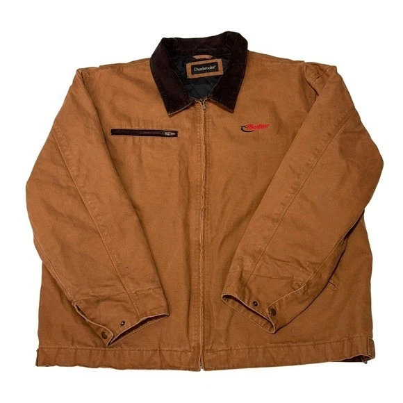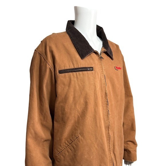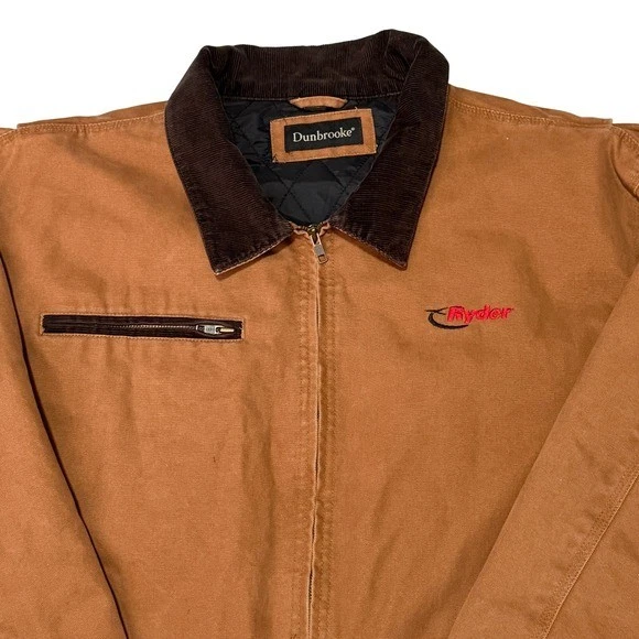 Men's Dunbrooke jacket in brown with a Ryder logo. This durable workwear jacket features a quilted lining for warmth, a classic corduroy collar, and a zippered chest pocket. Perfect for work or casual outdoor activities. Type: Jacket Style: Quilted Outer Shell Material: Cotton Department: Men Closure: Zip, Button Fabric Type: Canvas Insulation Material: Polyester Occasion: Workwear, Casual Accents: Quilted, Embroidered, Logo, Zipper Chest Size: XXL Collar Style: Point Country of Origin: China Keywords: workwear, utility, chore coat, outdoor, canvas, quilted lining, corduroy, logo, heavy duty, fall fashion, winter wear, casual jacket, menswear