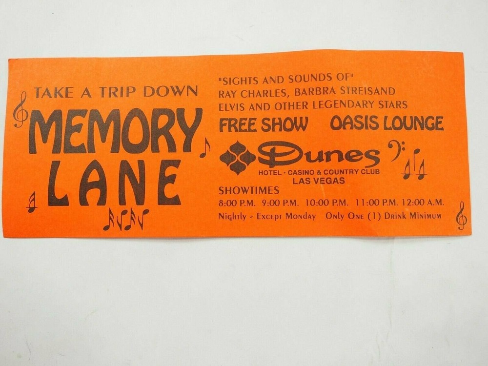 Dunes Hotel & Casino Take A Trip Down Memory Lane Sights and Sounds of Ray Charles,Barbara Streisand Elvis and Other legendary Stars Free How Oasis Lounge Voucher measuring 2.75" x 7" condition is very good Remember We want you happy We have a no hassle return policy Email me with Questions Be sure to add me to your favorites list! Check out my other items! PAYMENT & SHIPPING: Payment is due within 7 days of auction completion. We strive to ship the same day and 90% of our sales ship the same day payment is received. However, we do not work on the holidays or weekends so on occasion we will ship within a few days at the most. Please don`t forget to leave positive feedback and a five-star rating. Our system leaves feedback automatically when we receive feedback. We strive to make every transaction a 5-star rating for both of us! Shipping is done via USPS. All items have tracking numbers which are emailed to the customer. Any item valued $250 and up will have a USPS signature confirmation at no extra charge. If you would like to add insurance, please request as it is no longer an option through eBay check out I am happy to discount shipping on multiple purchases made in the same auction. Please wait for me to invoice you with the discount after the auction ends. If you make a payment, we will refund the difference. Shipping to AK, HI, PR, APO/FPO takes a little longer to arrive. Please do not give negative feedback or claim item has not arrived due to the post office delay Questions are usually answered within 24 hours, so please contact us with any questions or problems. We strive to resolve all questions/issues. INTERNATIONAL BUYERS: Shipping Cost tends to be a little higher than US shipping costs for items. Any item $76 dollars and up is shipped registered, insured and usually runs about 17-20 dollars depending on price and weight of an item. Import duties, taxes, and charges (typically collected upon delivery or pickup) are the buyer's responsibility and are not included in the item price or shipping charges. Please check with your country's customs office prior to bidding/buying to determine what these additional costs will be. We claim the value of the package by the ending item price. I cannot claim your item as a gift to avoid customs fees, as it is against the law. International usually takes up to 3 to 6 weeks to arrive so please don't file negative feedback because of the Post Office or Customs delay! RETURN POLICY: Returns are accepted up to 14 days after the auction end. Please ask all questions prior to bidding. Almost all of my pieces are handmade, so they will not be perfect. Vintage and used pieces will have some wear to them. I will point out any damage that I see. We strive to describe everything correctly but occasionally we might miss a measurement or blemish so please look at all the pictures carefully. LEGAL TERMS OF SALE: We try our very best to represent my items as accurately as possible. Items are guaranteed as described. Please read the whole description and look at pictures carefully as they are considered part of the description. Interpretation of condition and measurements are the buyer’s responsibility. Colors may not always be exact, Cameras will sometimes slightly alter the color of items and it may not match the picture exactly-that is not misrepresentation. Antiques and Collectibles are guaranteed to be authentic. If an item is improperly described it would not be intentional. We are aware that mistakes do happen and want you to be happy as your satisfaction and shopping experience is important to us. We will refund any misrepresented item. By confirming the bid, you are confirming you have read all of the terms listed above and understand them. Thank you.