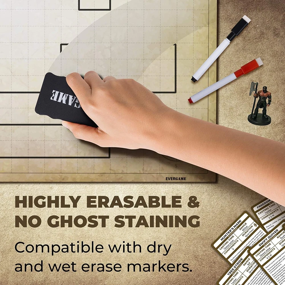EPIC GAMEPLAY - Enhance your D&D roleplay gaming experience; Immerse yourself in the fantasy world of thrilling campaigns, strategic gameplay & intense tactical combat; Enjoy complete fun package w/ this 23" x 27" double-sided game mat AGED SCROLL LOOK - High-Resolution print and classic aged look adds an authentic touch, creating a truly immersive gameplay experience; Game mat is double-sided w/ 1" square & 1" hex grid on each side respectively COMPLETE PACKAGE - Includes 1 game mat, 7-pc dice set, 4 colorful markers w/ eraser heads, 1 eraser, 1 spray bottle & 1 storage box; Store easily in box provided and carry your adventures anywhere you like; Delightful gift for dnd enthusiasts of all ages CLEANS LIKE NEW - Play everything from dungeons & dragons, pathfinder to Warhammer without dealing w/ marks & stains from previous game; Deluxe PVC coating ensures it always cleans like new even after playing for hours TRUSTED QUALITY - Experience superior quality w/ heavy-duty game mat; Meticulously crafted using premium paper & laminated, it boasts strong fold reinforcement, exceptional tear-resistance & long-lasting durability; Completely safe to use w/ non-permanent markers Product Description Time to change the game. Again. There are people who play games, and then there are gamers. Show everyone that you mean business with a dungeons and dragons battle mat that is every bit as resilient as a Level 11 Barbarian who just activated Rage. With features that ease quality of life and enhance your gaming experience, the Evergame Foldable dry erase grid mat gives the power right back to the players Play the Game, Don’t Let It Play You. Play the Game, Don’t Let It Play You. Some game systems use a combat system on hexagons. Others on squares. Most battle mats force you to choose one or the other, or to buy two game mats to support both systems. It’s not perfect, but what can you do? Well, you can choose to play with Evergame Foldable Game Board instead, for starters. We let you flip the game board to choose between the two, giving you the complete control to play your games the way they were meant to be played, not the way you have to make do with. Erase and Rewind In any battle, there is always a mess afterwards. Your Evergame Foldable Game Board is no different, except it’s the easiest thing to clear the mess after every gaming session because any lines you draw with your markers go right away with a swipe of the eraser. No more worries about ghost stains and remnants of sessions long past. Every new battle is a fresh start. Ready for Anything Our Evergame Foldable battle board are constructed not only with quality but utmost compatibility in mind. We are compatible with all types of tabletop RPG’s, including but not limited to everything that you see here. Don’t limit yourself to one or two games when you can play every single one of them on our versatile and handy dry erase dungeon. This hexagon game mat can be use as table top battlemat. They’re Called Guidelines for a Reason. Our Evergame Foldable dry erase game tiles have broken lines that are light and unobtrusive so they won’t get in the way of your own markings. That way, you never lose track of the battlefield, but have all the power to reshape the dnd battle grid to your specifications. Everything is within your purview, and everything is under your control. One box to Hold Them All. When it’s time to pack it all in, your eraser, your pens, your dice, tokens, and yes, foldable gaming grid mat fits perfectly into an elegantly constructed box designed for your portability and convenience. Now, you need not worry about losing anything important for your next gaming session – it’s all right here, waiting for you in the box.