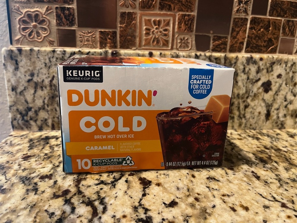 Savor the rich, sweet essence of Dunkin Cold Caramel coffee pods, expertly crafted for a delightful cold brew experience. Each pod delivers the signature taste of Dunkin's beloved caramel flavor, perfectly balanced with a smooth coffee base designed to be brewed hot over ice for an instant, refreshing beverage. Elevate your mornings or enjoy an afternoon treat with this convenient and delicious coffee. Ideal for a quick breakfast, a mid-afternoon pick-me-up, or a relaxing moment at home. Product: Flavored Milk & Iced Coffee Compatibility: Keurig Flavor: Caramel Food Specifications: No Artificial Flavoring Calories per Serving: 101-200 Number of Servings: 10 Serving Size: 2 Cups Item Weight: 4.4 oz (125g) Country of Origin: United States Food Aisle: Pantry Unit Type: Unit Keywords: Dunkin Donuts, caramel coffee, cold brew pods, Keurig compatible, iced coffee, single serve coffee, breakfast coffee, sweet coffee, convenient coffee, at home coffee, refreshing drink, specialty coffee