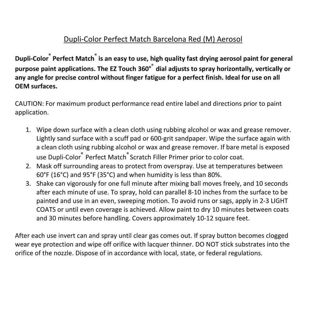 Dupli Color Perfect Match Spray Paint 8Oz Barcelona Red Paint For Toyota AUTOMOTIVE SPRAY PAINT – Perfect Match Automotive Spray Paint is a high-quality, fast-drying, acrylic lacquer vehicle paint that is specially formulated to match the exact color of the original factory-applied coating FIND THE PERFECT MATCH – Color code is 3R3; vehicle color matching paint codes are tied directly to the color codes on your car ID tag/sticker; For Toyota vehicles, you can typically find it on the driver’s door jamb EASY TO USE – Featuring an EZ Touch 360° Fan Spray Nozzle, this SUV, truck or car paint is easy to use and ensures maximum coverage. It’s dry to the touch in 30 minutes and can be handled in 1 hour IDEAL USES – Ideal for use on all OEM paint surfaces, this spray paint is great for larger vehicle touch-ups and for color matching vehicle trim and accessories – Since 1938, has been the trusted leader in providing easy-to-use, innovative, and exact color matched products to restore, restyle and protect vehicle appearance Shipping We offer FREE shipping on all orders! We ship within Three business days of payment, usually sooner. We use a selection of shipping services such as UPS, FedEx, USPS etc. We only ship to the lower 48 states, no APO/FPO addresses or PO Boxes allowed. Local pickups and combined shipping options are not provided at this time. Return You can return a product for up to 30 days from the date you purchased it. Any product you return must be in the same condition you received it and in the original packaging. Please keep the receipt. Payment We accept payment by any of the following methods: PayPal Please pay as soon as possible after winning an auction, as that will allow us to post your item to you sooner! Feedback Customer satisfaction is very important to us. If you have any problem with your order, please contact us and we will do our best to make you satisfied. Contact Us If you have any queries, please contact us via ebay. We usually respond within 24 hours on weekdays. Please visit our eBay store to check out other items for sale! Thank you for shopping at our store.