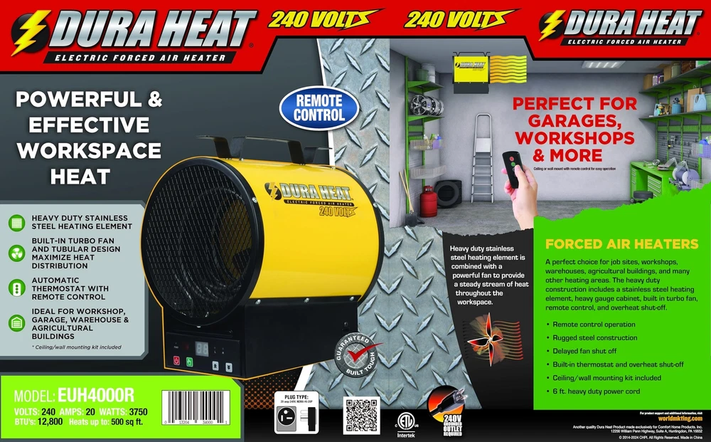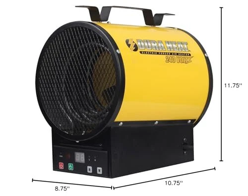 Dura Heat 3,750W Electric Garage Heater – High-Performance Forced Air Heater for Garages, Workshops, and Basements The Dura Heat 3,750W Electric Garage Heater is a powerful, versatile solution for efficiently heating large spaces. As a forced air heater electric, it operates on 240V power, providing fast and consistent heating for areas like garages, workshops, or basements. Unlike standard space heaters, this unit is designed for high-performance heating, making it perfect for larger spaces. Please note that it requires a 240V outlet and is not compatible with standard household plugs. This electric garage heater features a durable stainless steel heating element that ensures reliable, long-lasting performance. Whether you need a garage heater for permanent installation or a portable heater to move around as needed, this model provides flexibility. It comes with a wall/ceiling mounting kit for permanent installation, while its compact design allows you to easily transport it to different areas, making it ideal for various uses. The fan-forced air circulator distributes heat evenly throughout spaces up to 500 square feet, ensuring there are no cold spots. In warmer months, you can switch to the fan-only mode to circulate air without heat, offering year-round utility. This small space heater provides versatility for any season. Safety is paramount, as the unit includes an overheat shutoff feature, automatically powering off if the temperature rises too high. The electric heater has a compact, rugged design, measuring 12" H x 9" W x 11" D, making it a durable and space-saving option for any environment. Its tubular steel cabinet construction ensures it can withstand tough conditions, making it the perfect electric heater indoor or for outdoor garage spaces. Convenience is at the forefront with the included remote control, allowing you to adjust the temperature and settings of the small heater from across the room. With 3,750 watts of power and generating 12,800 BTUs, this electric heater is a high-powered solution for medium-sized spaces. The heater comes equipped with a 6-foot, 14 AWG cord and uses a NEMA #6-20P plug for easy connection to 240V outlets. Important Installation Notes: This electric heater indoor requires a NEMA #6-20P outlet and will not work with standard household outlets. Adapters cannot convert a 120V outlet to 240 V. If the outlet doesn’t match the plug, a 240V adapter may be used. Note: This heater does not reach temperatures high enough to kill bed bugs. 240V POWER FOR HIGH-PERFORMANCE HEATING: This electric garage heater operates on 240V power (not compatible with standard household outlets), delivering fast and efficient heating for larger spaces. FLEXIBLE INSTALLATION OPTONS: Ideal for garages, workshops, or basements, this portable heater comes with a wall/ceiling mounting kit for permanent installation but is also portable for versatile use. DURABLE STAINLESS STEEL HEATING ELEMENT: The stainless-steel heating element of this electric space heater ensures lasting durability and consistent warmth over time. FAN-FORCED HOT AIR CIRCULATION: Distributes heat evenly across spaces up to 500 sq. ft., eliminating cold spots for balanced warmth from your electric heater. YEAR-ROUND UTILITY: The fan-only mode allows this garage heater to circulate air without heat, making it useful even during warmer months. BUILT-IN SAFETY FEATURES: This indoor electric garage heater includes an overheat shutoff feature, automatically powering off for safe, worry-free operation. COMPACT, EFFICIENT DESIGN: Measuring 12" H x 9" W x 11" D, this small pace heater has a durable tubular steel construction, designed for tough environments. CONVIENIENT REMOTE CONTROL: Easily adjust temperature or settings on your electric garage heater from across the room using the included remote control. ELECTRICAL SPECIFICATIONS: Voltage: 240V, Amps: 20A, Wattage: 3,750W, BTUs: 12,800, Plug Type: 6-20P, and a 6ft cord for flexible installation. Fan-forced hot air circulation. Heating area of up to 500 sq ft NEMA #6-20P plug included. (Requires 240V outlet). Ceiling/wall mounting kit included Overheat shut-off. Remote control.