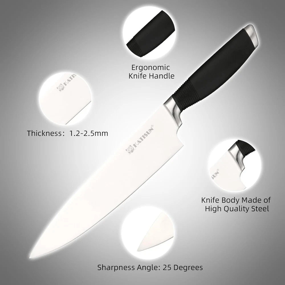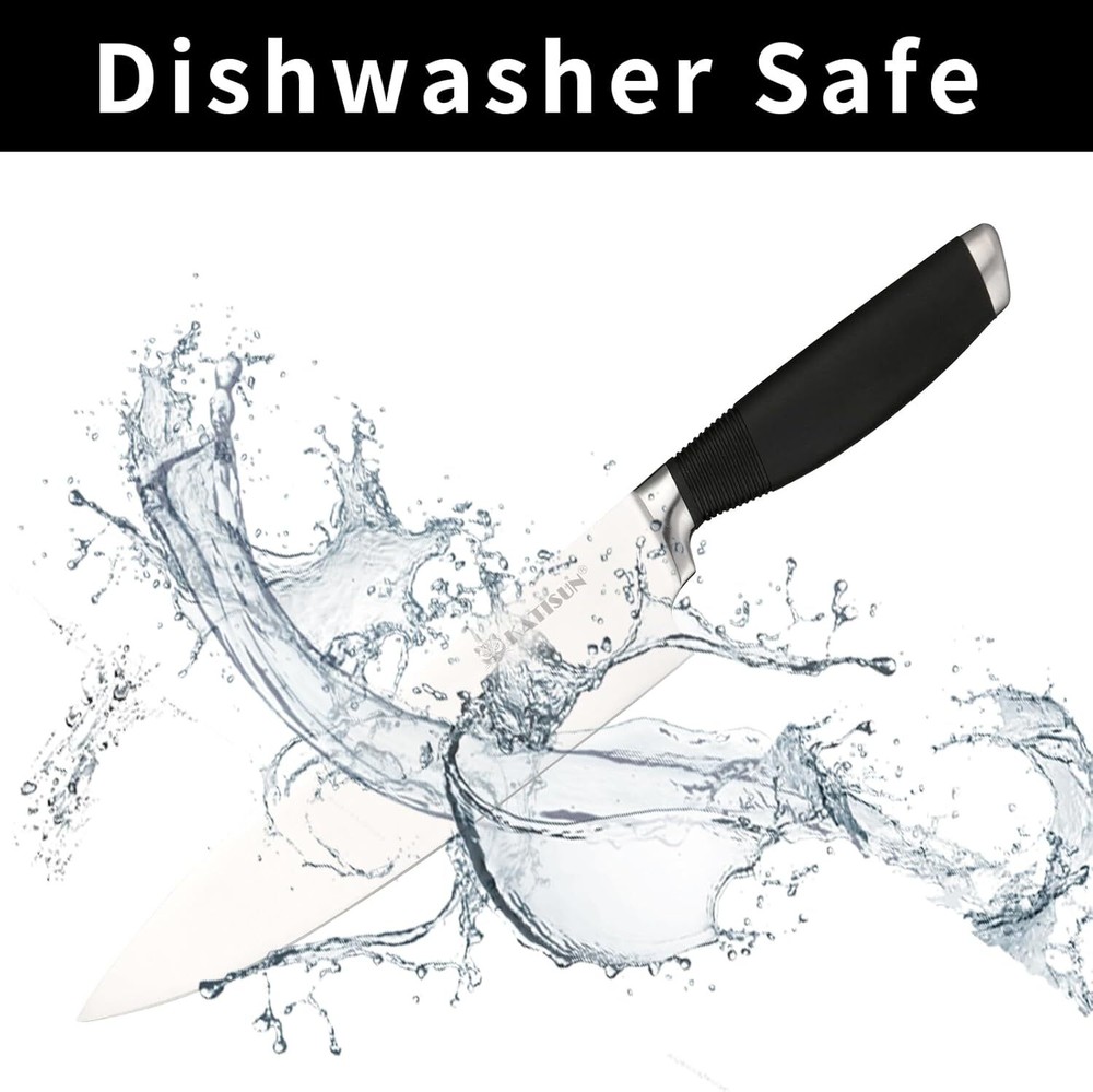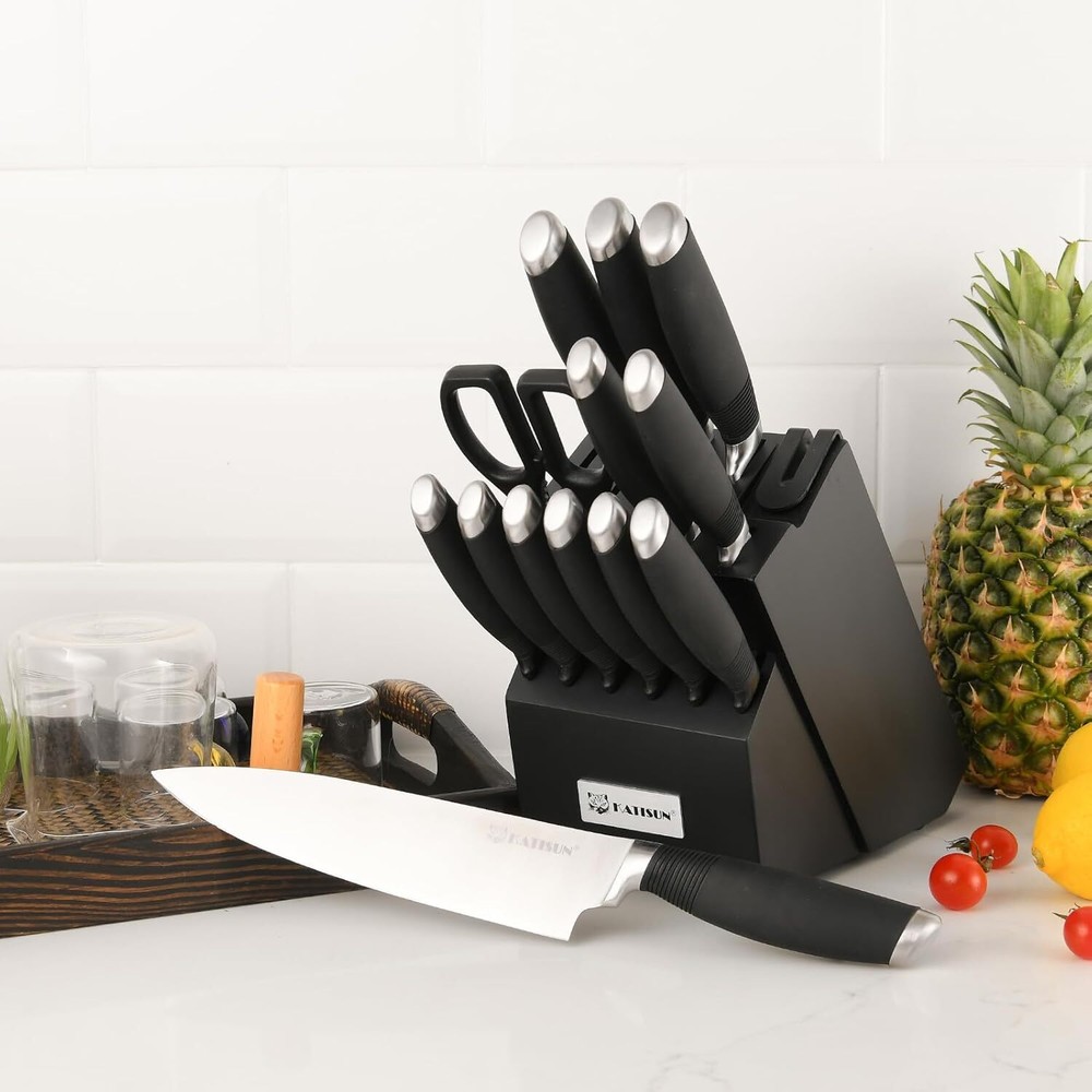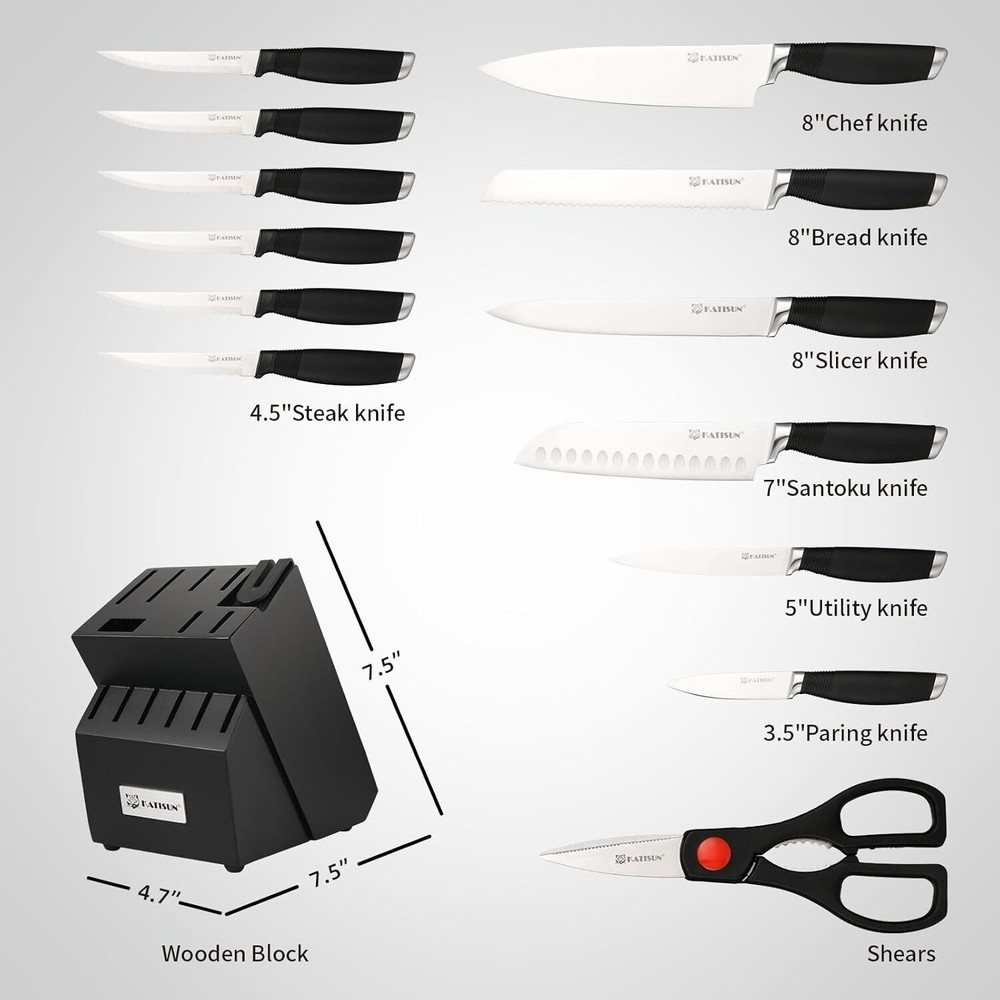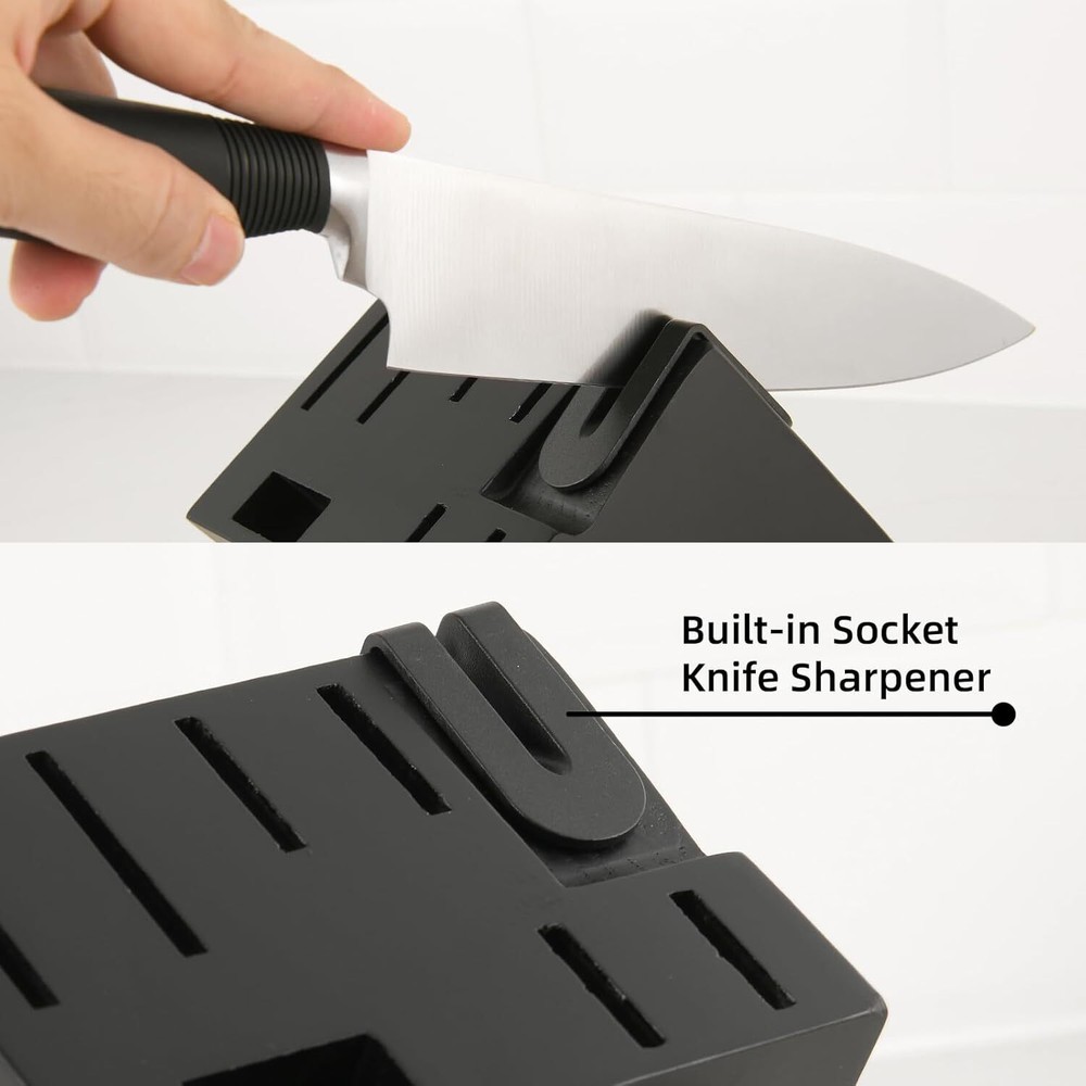 Product Description 15-Piece Knife Set, German Steel, Durable and Dishwasher Safe, Ergonomic Handle Knife Block set with Built-in Sharpener for Chopping, Slicing, Dicing&Cutting Black ALL-IN-ONE COMPLETE SET - Professional Knives set includes 8"Chef's knife, 7"Santoku knife, 8"Bread knife, 7"Meat cutter, 5"Utility knife, 3.5"Paring knife,6 Pieces 4.5"Steak knife,Kitchen Shears,Built-in Sharpener to stay sharp and knife Block,enough for all your kitchen activities. HIGH QUALITY STAINLESS STEEL - professional knife set made of high quality German steel.After heat treatment and deep cryogenic treatment improves characteristics of the steel for exceptional sharpness, edge retention. Curved design handle provides comfort and support. CONTROL & SHARP - The ergonomic design of the curved handles ensures a comfortable grip and optimal control, allowing you to maneuver through various cutting tasks effortlessly. With our included knife sharpener, you can easily maintain the razor-sharp edge of your knives, ensuring consistent performance over time. BEAUTIFUL & DURABLE - Add a touch of natural beauty to your kitchen with our wooden knife block. Crafted from premium wood, this compact and stylish block securely holds and organizes your knives while protecting their sharp edges. Its durable and easy to clean design ensures long-lasting performance. Also offering a convenient and visually appealing storage solution for these prized knives. LIFETIME WARRANTY - Every knife set is backed by superior quality and under strict quality inspection. Our aim is 100% satisfied customers. Return it anytime and get a full refund when you are not happy with our knife set. will give you the best shopping experience. About Us We are a reputable seller with many years of experience selling on eBay. Our goal is to provide high-quality products and excellent customer service. Shipping Items will be shipped within 1-3 business days when we received payment. (Orders are not processed on weekends & holidays) Tracking information will be sent once item is shipped. Delivery time depends on destination and other factors Item is shipped to ebay address. Leaving correct address can minimize delay. For international shipping and shipping to Guam, Hawaii and Alaska, Please contact us before placing the order. International buyers please note: Import duties, taxes and charges are not included in the item price or shipping charges. These charges are buyer’s responsibility. We will try our best to reduce the risk of the custom duties. Local pick-up is unavailable at the moment. Contact Us We reply any email messages within 1 business / working days(off-duty at weekend). If you do not get a response from us, then please check your junk or spam mailbox. Our Business hours: Mon-Fri 9:00-18:00, UTC/GMT +8 hours. Please contact us either by clicking "contact seller" in the "purchase history" section or simply click "ask a question" at the bottom of this page. If you are unsatisfied with our item or service, please contact us before leaving any feedback. We are committed to resolve all issues in a friendly and satisfactory manner.