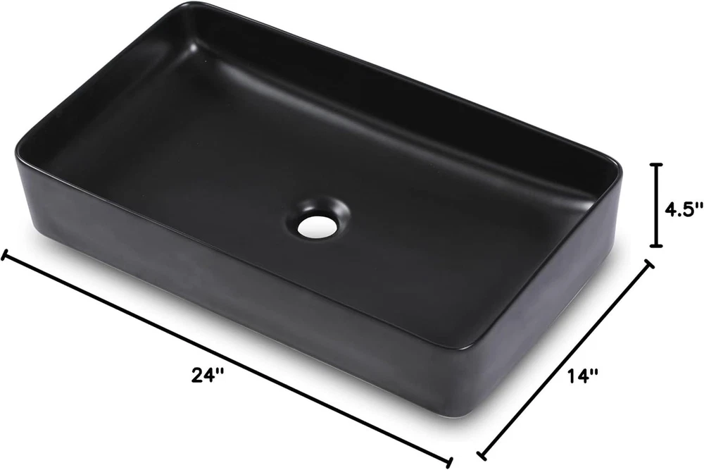 Bowl Depth: 4-5 in Features: Water Spot Resistant, Easy to Clean Item Length: Vessel Sink Finish Type: Matte Black Brand: Unbranded Mounting: Above Counter Personalize: No Items Included: Vessel Sink Room: Bathroom, Powder Room, Cabinet Lavatory, Bars Base Width: 24 Inches Bowl Shape: Standard Item Width: Vessel Sink Drain Type: Grid Item Height: Vessel Sink Faucet Hole Spacing: 1-3/4 inch Installation Type: Countertop Style: Modern Batteries Included?: No Included Components: 24 Inch Large Matte Black Bathroom Vessel Sink Product Dimensions: 14"d X 24"w X 4.5"h Item Weight: 27.4 Pounds Type: Vessel UPC: Does Not Apply Shape: Rectangular gtin13: Does Not Apply Material: Ceramic Color: Matte Black Assembly Required: No Number of Faucet Holes: No Hole Batteries Required?: No Size: 24"x14" Finish: Matte