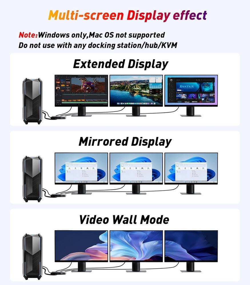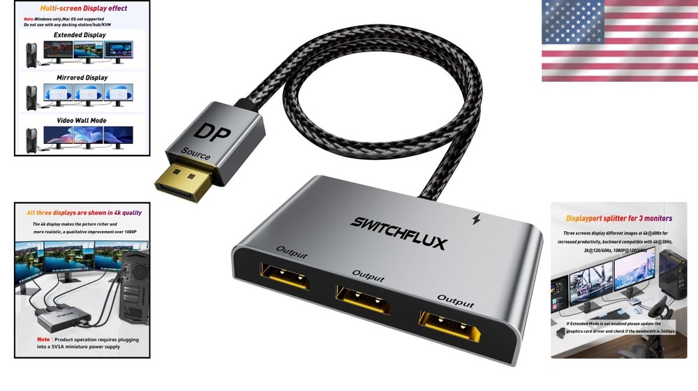 Durable 4K DisplayPort Splitter for Multi-Monitor Setup - Gold-Plated Connectors ‹ › ‹ › ‹ › ‹ › ‹ › ‹ › ‹ › ‹ › ‹ › Durable 4K DisplayPort Splitter for Multi-Monitor Setup Gold-Plated Connectors for Enhanced Durability Unmatched Performance: Transform your computer setup with our DisplayPort splitter that seamlessly extends the monitor functionality, allowing you to mirror the DP signal from one source to either SST or extend MST to three DP monitors. Experience breathtaking clarity with 4K UHD visuals while simultaneously transmitting high-quality audio and video. Note: For optimal display results, ensure to connect the Micro USB cable. This device is designed to function unidirectionally from a DP source to a DP display device. Not compatible with any docking/hub/KVM setups. 4K UHD Resolution / Audio & Video Sync Transmission: Supports HDCP 2.2 Single DP screen resolution up to 4K@60Hz Dual DP screen resolution up to 4K@60/30Hz Backward compatible with 2K@120Hz/60Hz and 1080P@120Hz/60Hz Note: To achieve 4K resolution, ensure that the input device ports meet the minimum standard of DP version 1.2, and that the output ports of the source device support DP/DP++/DisplayPort++. Extended/Mirror Display, Plug and Play: Effortlessly connect and enjoy your visuals with a DisplayPort Male to DisplayPort Female splitter. This device is fully plug-and-play—no driver installation required! Instantly mirror or extend the DP signal to two or more monitors with zero loss in quality, enhancing your viewing experience. Note: In case of issues with the extended mode, updating your graphics card driver to the latest version may solve the problem. Rugged Design: Our DisplayPort splitter is constructed from a thin aluminum alloy one-piece housing that ensures excellent corrosion resistance and heat dissipation. The stylish design is complemented by a durable nylon braided splitter cable that withstands twisting and bending. With 24K gold-plated connectors, this splitter delivers outstanding endurance, passing the test of over 10,000 plug and unplug cycles. Why Choose Our DisplayPort Splitter? At , we pride ourselves on crafting high-quality and reasonably priced products designed to simplify your connection needs. Dedicated to excellence, we provide responsive support within 18 hours for any inquiries. Elevate your multi-monitor setup with our unparalleled DisplayPort splitter. Experience sophistication in simplicity—order now! Shipping Free & Fast Shipping - We offer free shipping to most of the USA with a normal delivery time of 3-10 businessdays. However, due to various situations, additional delivery time (up to 3 weeks) may be required for some items. Alternative Carriers - We may use alternative carriers (e.g. USPS, FedEx, UPS, etc.) to ensure your package arrives safely and on time. Due to the use of multiple carriers, we are unable to provide a tracking number automatically. Handling Time - Orders are processed and shipped within 1-5 business days of receiving cleared payment. Shipping Restrictions - Shipping to Alaska, Hawaii, Puerto Rico, Guam, and other US territories may incur shipping charges or delivery restrictions. Please contact us before ordering, or your order can be refunded/cancelled. State Restrictions - There may be restrictions based on your state of purchase. For example, certain items may not be shipped to California due to state regulations. Contact for Tracking Updates - If you require tracking updates or have any concerns about the delivery of your order, please feel free to contact us, and we will be happy to assist you. Return Please see our ebay return policy. We do not accept return on most products. This is to avoid customers mis-using ebay returns. All sales are final. Please be sure to check the return policy listed at the top of the listing. In rare cases, we may accept returns, if the buyer pays both ways shipping and 20% restocking fee. If you are un-sure of return policy of a particular item, please ask before buying. Payment We accept all major credit cards, PayPal, and Apple Pay for your convenience. Your payment information is secure and encrypted to ensure a safe and seamless transaction. Please complete your payment within 3 days of purchase to avoid any delays in shipping. Feedback Your feedback is extremely important to us. We strive to provide the best products and customer service possible. If you are satisfied with your purchase, please take a moment to leave us a positive review. If you have any concerns or issues with your order, please contact us before leaving negative feedback. We are committed to resolving any problems and ensuring your satisfaction. Contact Us If you have any questions or concerns, please feel free to reach out to our customer support team. You can contact us through the eBay messaging system. We are available Monday to Friday, 9:00 am to 5:00 pm EST, and we will do our best to respond to your inquiry within 24 hours. Buy it now and enjoy a pleasant shopping experience! MPN: DisplayPort_Splitter_for_Multiple_Monitors UPC: Not Set Model: Not Set Unit Quantity: 4.6 Connector A: DisplayPort Male Connector(s) B: DisplayPort Female Features: Plug and Play,Rugged design,Extended Display,Mirror Display Brand: Unbranded Type: DisplayPort Splitter Connection Split/Duplication: 1 : 3 Cable Length: Not Set Color: Black