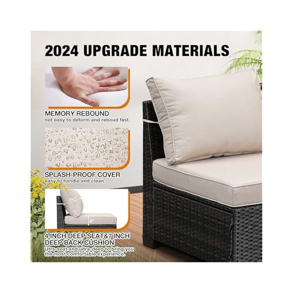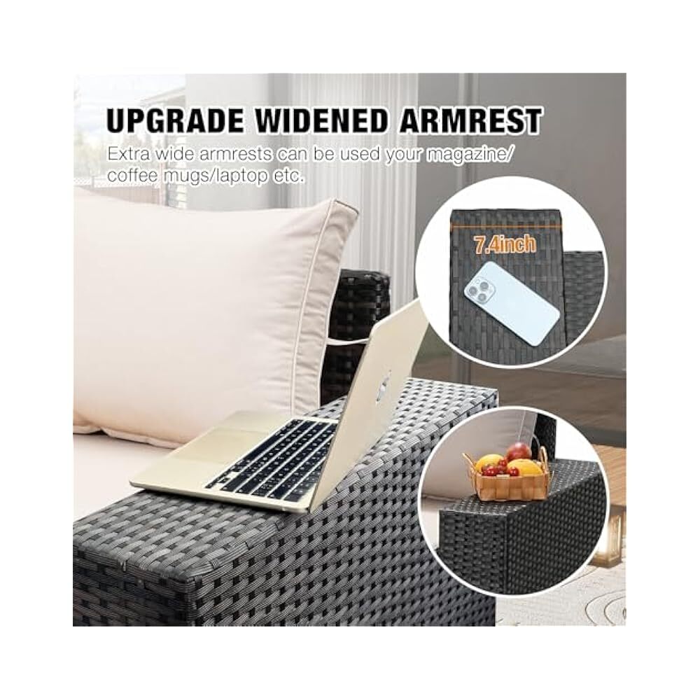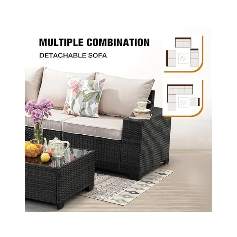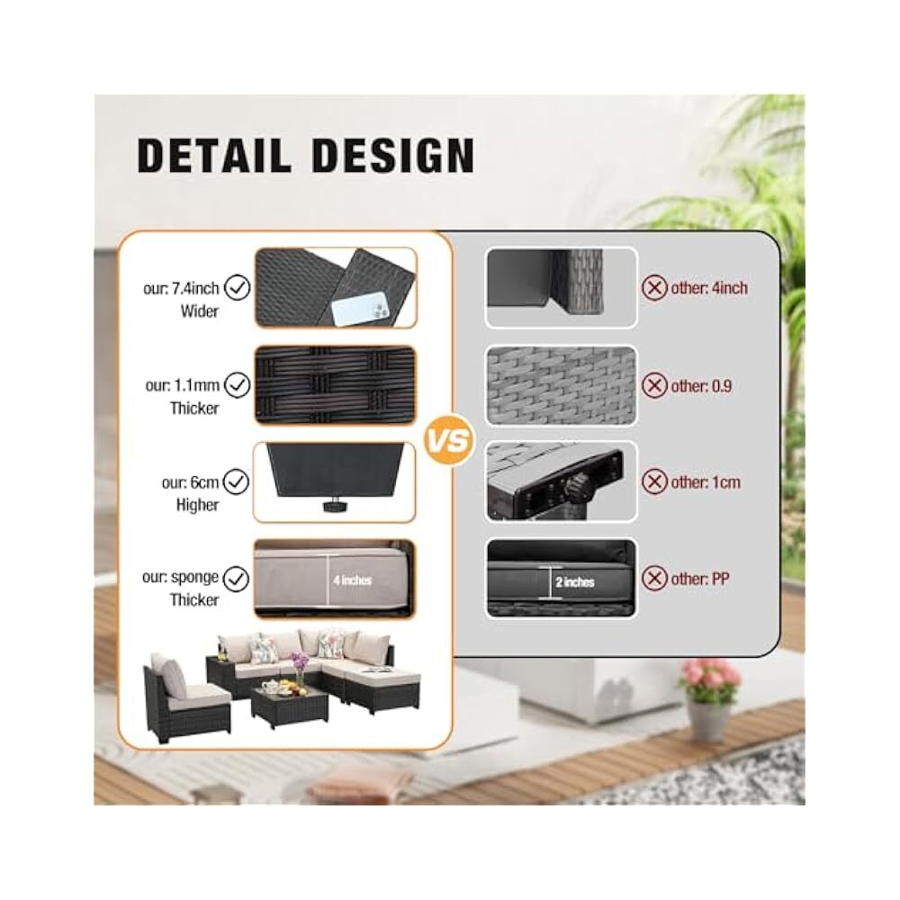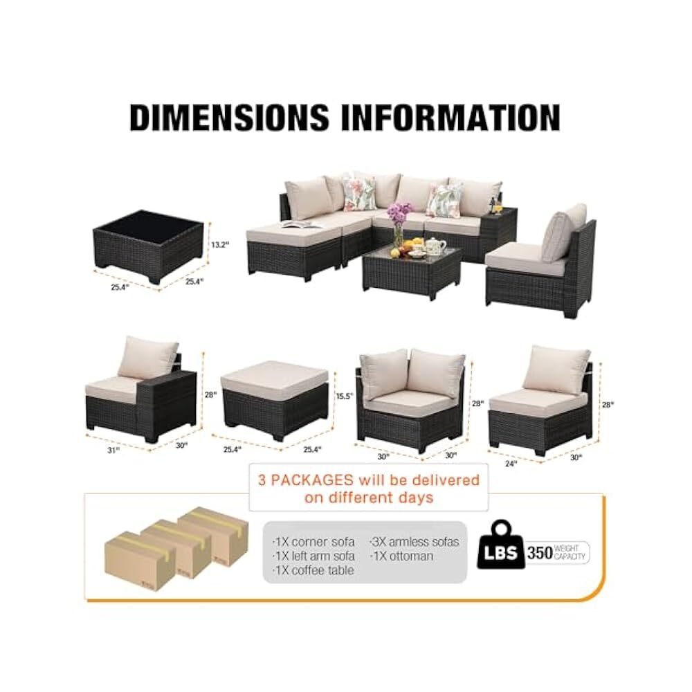 Assembled Length: 109 inches Set Includes: Cushion, Glass Table, Ottoman, Sofa Department: Outdoor Type: Sectional Set Product Care Instructions: Wipe with Damp Cloth, Wipe Theme: Outdoor Living Features: Comfortable, Durable, Stylish, All-Weather Chair Back Material: Wicker Style: Sectional Item model number: HD07-BEIGE Assembled Width: 79.4 inches UPC: Does not apply Assembled Height: 28 inches Material: Wicker Number of Items in Set: 7 Color: Beige Cushions Included: true gtin13: Does not apply Chair Color: Beige Manufacturer: JOYURE Assembled Seat Height: 17.2 Inches Tabletop Material: Glass Finish: Rattan Tabletop Color: Glass Brand: JOYURE Product Dimensions: 109 x 79.4 x 28 inches