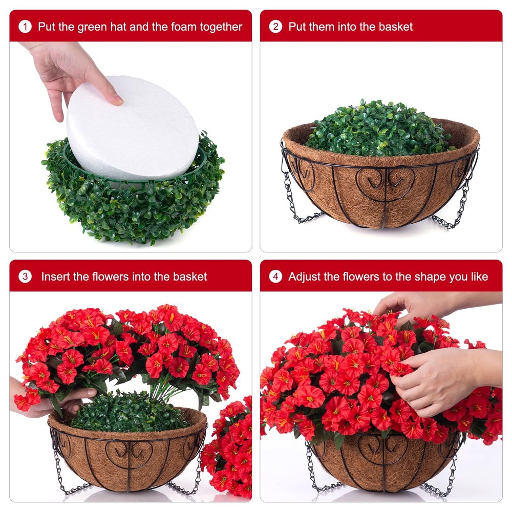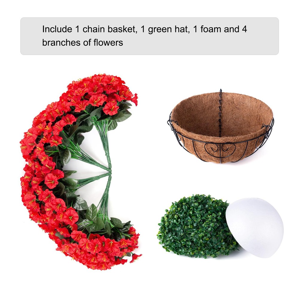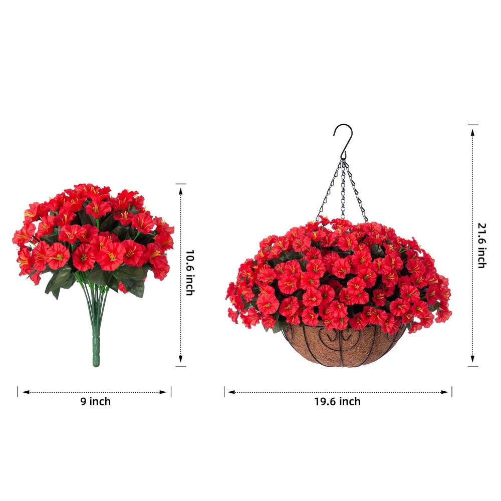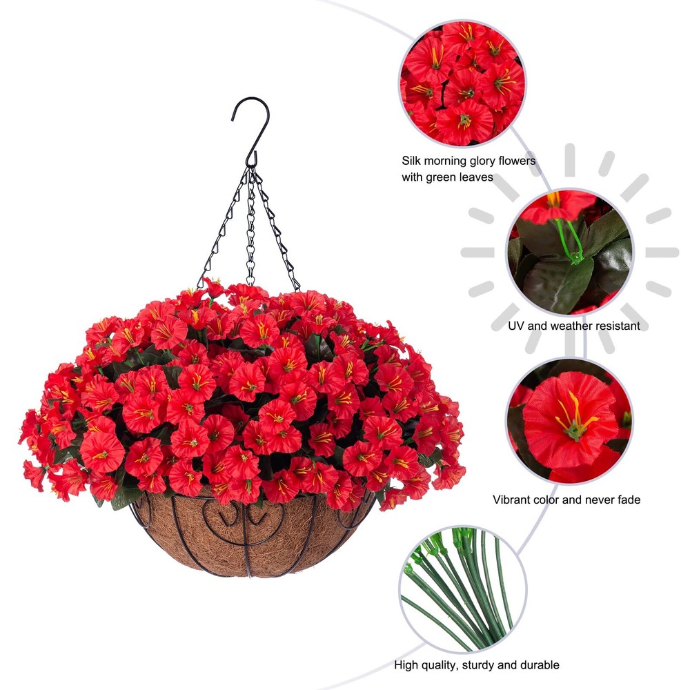 Artificial Fake Hanging Flowers Plants Baskets for Outdoor Outside Summer Decoration, Faux Silk Red Morning Glory in Planter UV Resistant Realistic for Home Porch Patio Balcony Garden Yard BEAUTIFUL HANGING FLOWERS: These artificial hanging morning glory flower has rich blossom and leaves filled in a handmade cone shape basket. SIZE: The size after assembly is approximately 17" x 17" x 19 "(LxWxH); The basket measures 12 " x 12" x 5.9 "(LxWxH) and the chain length is 13.78 inches. LOW MAINTENANCE: No need for watering, pruning, or sunlight – a hassle-free way to enhance your surroundings. Instantly transform your living spaces with these artificial hanging plants – no green thumb required UV RESISTANT: The faux hanging flowers were made of good quality material that don’t require maintenance after assembly. It’s UV resistance and won’t fade, sturdy enough for any weather. No watering needs ARTIFICIAL GREENERY DECORATION: The fake hanging flower in a basket looks real and stylish, making it the perfect hanging basket for your home, patio, balcony, garden, indoor and outdoor. It blooms all year and adds a sense of spring to your home