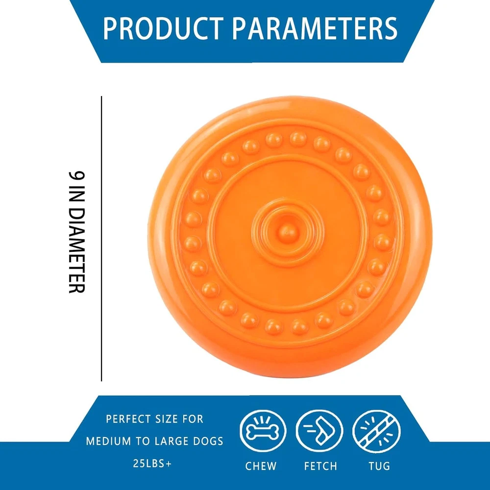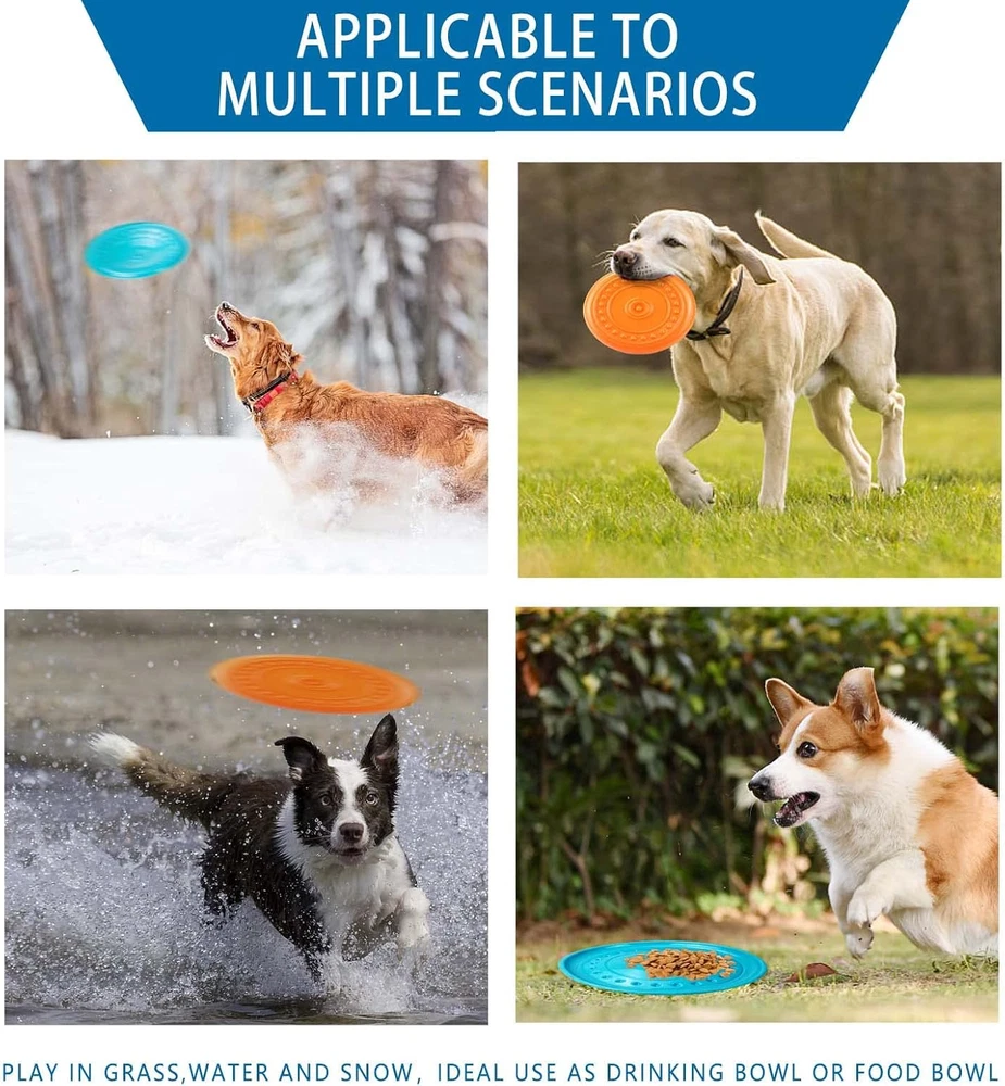 DURABLE DOG FLYING DISC: Our durable rubber dog toy is puncture, chew, and tear resistant; solid, heavy duty design; engineered to be as strong & indestructible as physically possible for long lasting durability. Whether you’re playing fetch , it's your best choice! DOG TOYS FOR AGGRESSIVE CHEWERS: This tough dog toys have passed our mechanical test and features excellent bite resistance. When your dog gets thirsty you can even turn it over and use it as a drinking bowl. SAFE RUBBER DOG FLYING DISC: This floatable dog flying disc is recyclable, harmless and top-rack dishwasher safe for frequent cleanings. The compounded rubber won’t harm your dogs health, please feel confident when you play with dogs. AERODYNAMIC DOG FLYING DISC: You won’t have to wear out your arm, just after a flick of the wrist, the puppy toys keep flying because of the aerodynamic grooved design. SOFT MATERIAL: This hyper pet toys for dogs features soft rubber, it's gentle on puppy's gums and teeth. Makes for a softer, forgiving catch during fetch. The scientists said that dog is like a kid they want to play all the time, of course they also want toys. Dog's teeth grow very quick so they always like hold something in mouth. The pet Flying disc is very strong you don't worry about the quality it can support most dog's bite force At the same time the flexible material can avoid your pet injured. Enjoy the game with your pet. Features: 100% Brand new and high quality