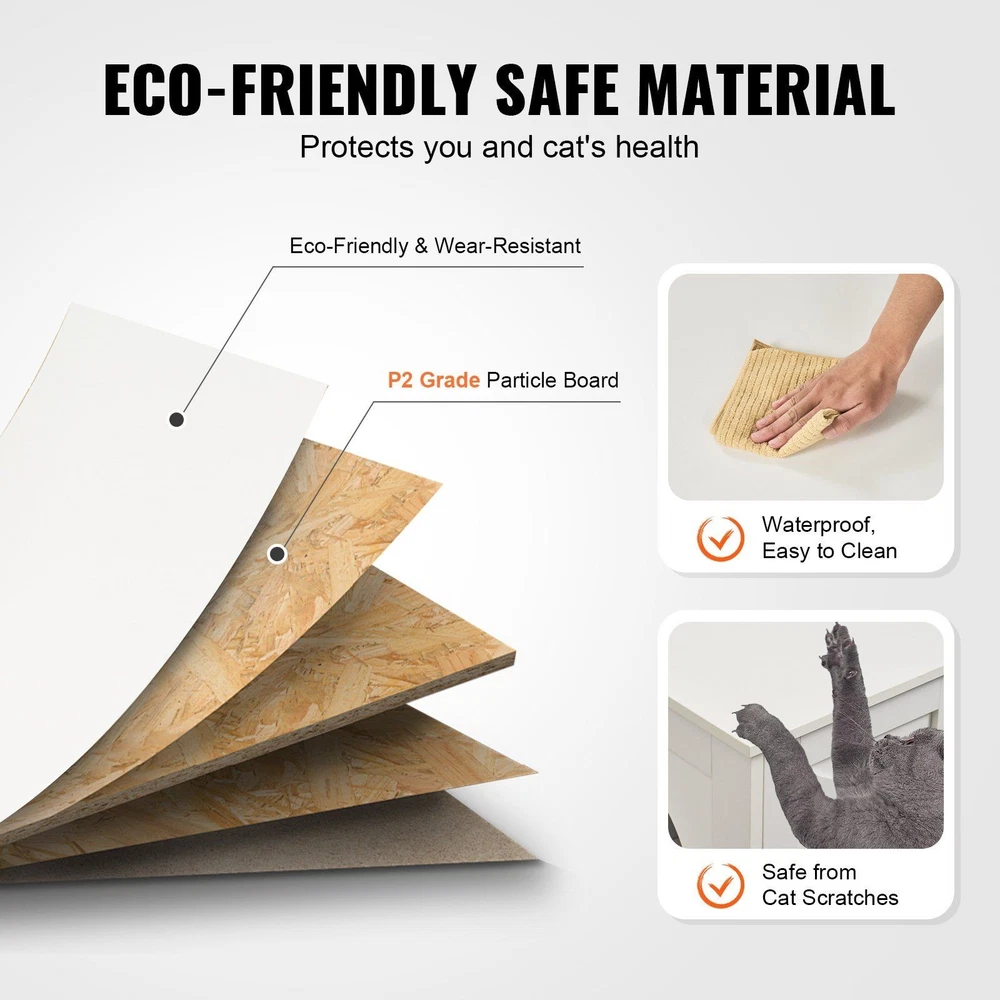 Highlights: 1.Hidden Aesthetic Design: The modern and simple multi-door cabinet not only provides private space for your pet but also makes your room look neater. The wooden cat litter box enclosure can hide the cat litter box, perfectly matching the home decoration. Adopting a high-quality aluminum alloy handle, with a magnetic suction door, the opening is easy and smooth. 2.Spacious Space: Measuring 47.2x18.5x19.7in, this cat litter box furniture provides a comfortable and free resting space for pets. It can accommodate cat litter boxes with a length of less than 21" and a width of less than 17.7". It is equipped with 4 doors and 2 windows for cats' easy access freely. 3.Heavy-duty Loading: The top loading is up to 150lb/68kg, with a firm and stable structure, for safely placing vases, books or other decorations. The cat litter cabinet can also be used as a cat house, tea table, coffee table or TV cabinet. The bottom adds support feet to enhance stability and loading capacity up to 100lb/45kg, which can be placed on cat litter boxes or other heavy objects. 4.Premium Materials: The P2 grade particle board ensures the health and safety of pets and your whole family. The high-quality finish surface with smooth edges is waterproof, easy to clean and maintain, wear-resistant and damage-resistant, and not afraid of cat scratching. The board is pre-drilled and numbered for your convenience. 5.Versatile Use: In addition to being a cat litter furniture hidden, it can be a rest area for cats, as well as additional storage space. Suitable for living rooms, bedrooms or bathrooms and is easily integrated into the home environment without taking up extra space. Details: Effectively hides the litter box and keeps air fresh! Providing a private and cozy space for your cat, this cat litter box enclosure not only effectively hides the litter box, but also keeps air fresh. Its elegant design blends perfectly with home décor and is both practical and beautiful, allowing you to place both decorative and everyday items. The large space with 2 windows allows your cat to access freely and most dogs can't get in, keeping your cat safe and private. No matter what size litter box you use, this cat litter box furniture will fit perfectly and provide plenty of room to move around. With a top weight capacity of 150lb/68kg, the cat litter cabinet can easily hold books, flowers, ornaments and other decorations. With additional support feet, the weight capacity is 100lb/45kg. It not only stores a large cat litter box, but also easily transforms into a cozy cat house. Made of P2 grade particle board, it is durable, ensuring the health of you and your pets. The high-quality finish is waterproof, and not easy to be damaged by cat scratching. Even cat urine or other stains can be easily wiped clean, greatly simplifying daily maintenance. This cat litter furniture hidden is not only a private toilet for cats, but also a small house, providing a multipurpose cozy space. The exterior design is simple and generous and can be used as a coffee table or TV cabinet. Whether for the living room, balcony or courtyard, it fits in perfectly.