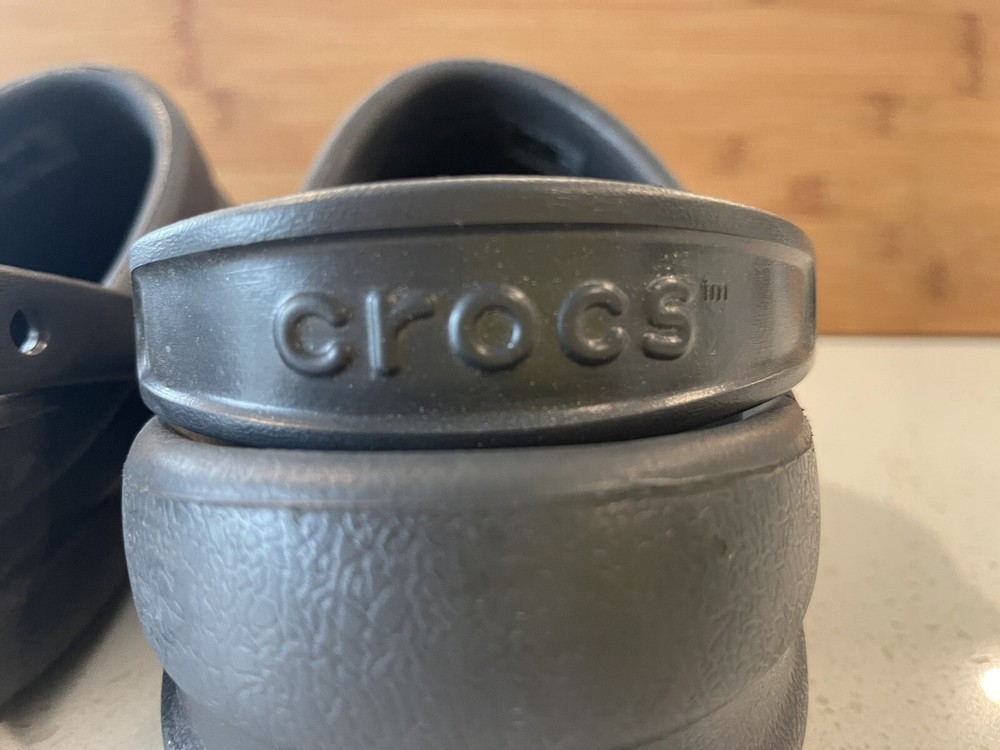 Elevate your casual look with these stylish Crocs Bistro slip-on clogs. Perfect for any occasion, these shoes feature a solid pattern and slip-on closure for easy wear. The black rubber upper material is accented with a non-slip feature, making them perfect for any surface. These clogs have a flat heel height of under 1 inch and a standard shoe width. The synthetic lining and insole material ensure comfort, while the rubber outsole provides durability. These Crocs Bistro slip-on clogs are a must-have addition to any wardrobe. From a smoke-free home.