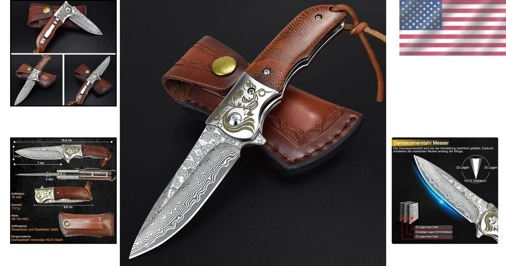 Durable Damascus EDC Pocket Knife with Lightweight Clip for Survival Tasks ‹ › ‹ › ‹ › ‹ › ‹ › ‹ › ‹ › ‹ › ‹ › ‹ › Durable Damascus EDC Pocket Knife Your ultimate survival companion, this lightweight pocket knife embodies both functionality and artistry. Perfectly crafted for both enthusiasts and everyday users, this knife is designed to meet a wide range of outdoor needs. Specifications: Total Length: 6.6 inches Blade Length: 2.95 inches Handle Length: 3.77 inches Blade Width: 0.86 inches Blade Thickness: 3 mm Weight: 3.95 oz Features: Sharp Damascus Steel Blade: Forged from 76 layers of high-quality carbon steel, featuring a VG10 steel core for exceptional durability and sharpness. Easy Opening Mechanism: Flipper and ball bearing design enable quick, one-handed access. Ergonomic Rosewood Handle: Non-slip design offers comfort and grip, elegantly accented with a lasered pattern. Convenient Carry Option: Comes with a leather sheath and a practical belt clip for easy attachment to your belt or bag. Versatile Uses: Ideal for camping, hunting, hiking, and everyday tasks; a reliable tool for every outdoor enthusiast. Why Choose This Damascus Pocket Knife? This isn't just a knife; it's a masterfully crafted piece that combines traditional manufacturing artistry with modern functionality. The stunning Damascus patterns tell a story of quality and precision, while the robust design ensures that it can handle tough survival tasks with ease. More than just a tool, it is a statement piece, making it an exquisite gift option for collectors, outdoor lovers, or anyone in need of a dependable knife. Nestled in a beautiful black gift box, this knife is ready to impress. Embrace the elegance and strength of the Durable Damascus EDC Pocket Knife —where craftsmanship meets purpose. Order yours today and elevate your outdoor experience! Shipping Free & Fast Shipping - We offer free shipping to most of the USA with a normal delivery time of 3-7 days. However, due to the current situation, additional delivery time (up to 3 weeks) may be required for some items. Alternative Carriers - We may use alternative carriers (e.g. USPS, FedEx, UPS, etc.) to ensure your package arrives safely and on time. Due to the use of multiple carriers, we are unable to provide a tracking number automatically. Handling Time - Orders are processed and shipped within 1-2 business days of receiving cleared payment. Shipping Restrictions - Shipping to Alaska, Hawaii, Puerto Rico, Guam, and other US territories may incur shipping charges or delivery restrictions. Please contact us before ordering, or your order can be refunded/cancelled. State Restrictions - There may be restrictions based on your state of purchase. For example, certain items may not be shipped to California due to state regulations. Contact for Tracking Updates - If you require tracking updates or have any concerns about the delivery of your order, please feel free to contact us, and we will be happy to assist you. Return 30-Day Hassle-Free Returns - We want you to be completely satisfied with your purchase. If you are not, you can return the item within 30 days of receiving it for a full refund or exchange. Easy Return Process - To start a return, simply contact us and we will provide you with a prepaid return shipping label and detailed instructions. Restocking Fee - There are no restocking fees for returns. However, the buyer is responsible for return shipping costs if the return is not due to a seller's error. Refund Processing Time - Refunds will be processed within 5 business days of receiving the returned item in its original condition. Payment We accept all major credit cards, PayPal, and Apple Pay for your convenience. Your payment information is secure and encrypted to ensure a safe and seamless transaction. Please complete your payment within 3 days of purchase to avoid any delays in shipping. Feedback Your feedback is extremely important to us. We strive to provide the best products and customer service possible. If you are satisfied with your purchase, please take a moment to leave us a positive review. If you have any concerns or issues with your order, please contact us before leaving negative feedback. We are committed to resolving any problems and ensuring your satisfaction. Contact Us If you have any questions or concerns, please feel free to reach out to our customer support team. You can contact us through the eBay messaging system. We are available Monday to Friday, 9:00 am to 5:00 pm EST, and we will do our best to respond to your inquiry within 24 hours. Thank you for supporting our small family business! Year: Damascus Pocket Knife Blade Type: Clip Point,Drop Point,Hawkbill,Karambit,Leaf,Needle Point,Pen,Sheepsfoot,Spear Point,Spey Point,Straight Back,Tanto,Trailing Point,Wharncliffe Tools: None Brand: Unbranded Model: Damascus Pocket Knife Number of Blades: 1 Color: Brown Type: Pocketknife Handle Material: Wood Opening Mechanism: Manual Product Line: Not Set Lock Type: Liner Blade Edge: Plain Blade Range: Under 2.75in. Blade Material: Damascus Steel Original/Reproduction: Not Set Dexterity: Ambidextrous Country/Region of Manufacture: Not Set