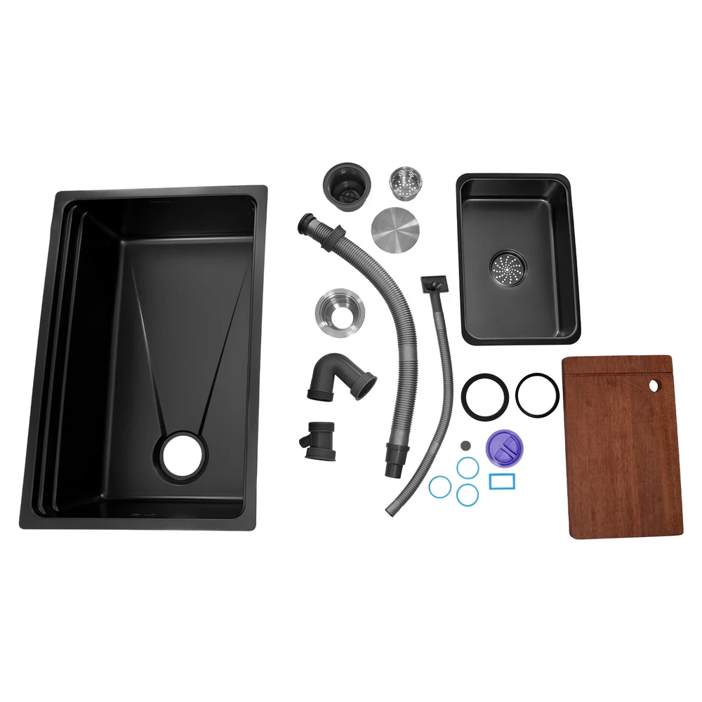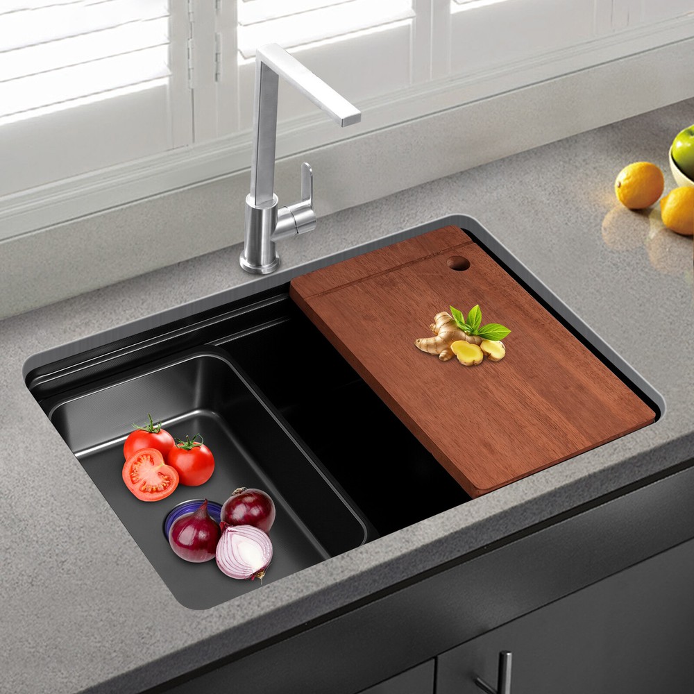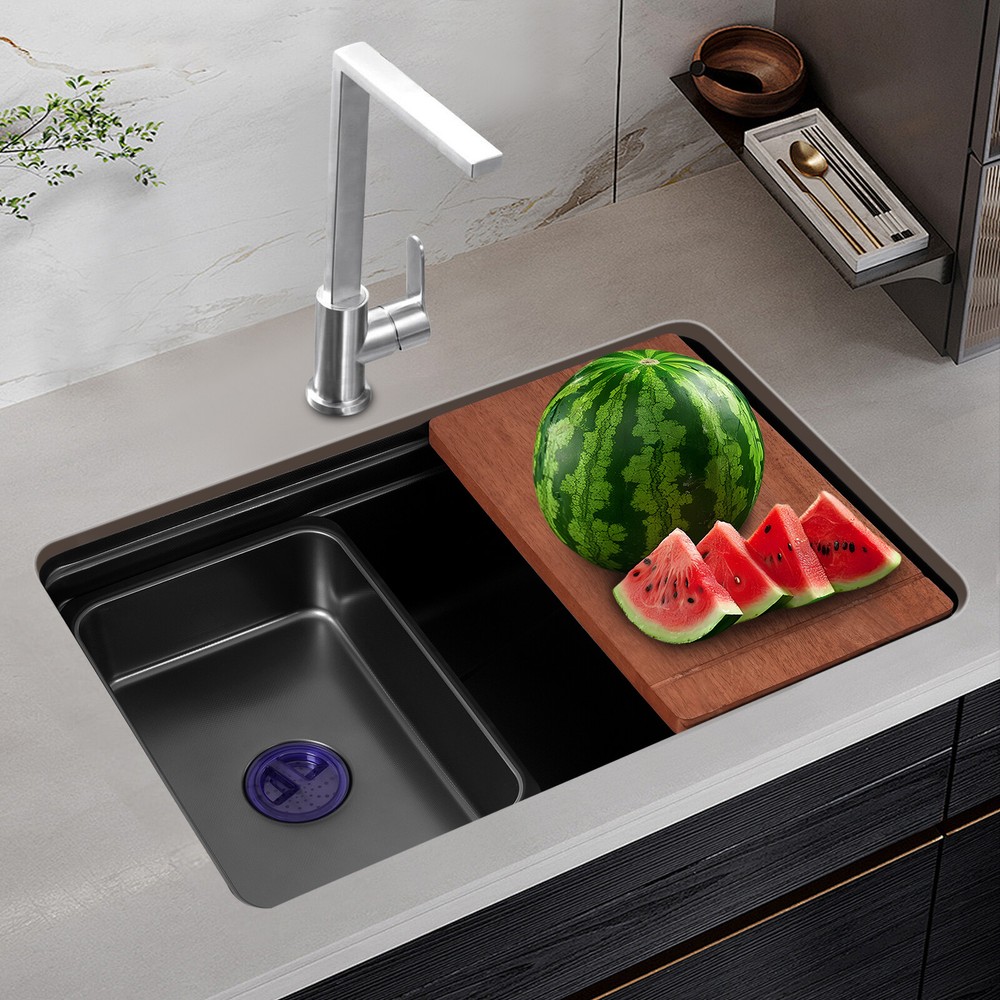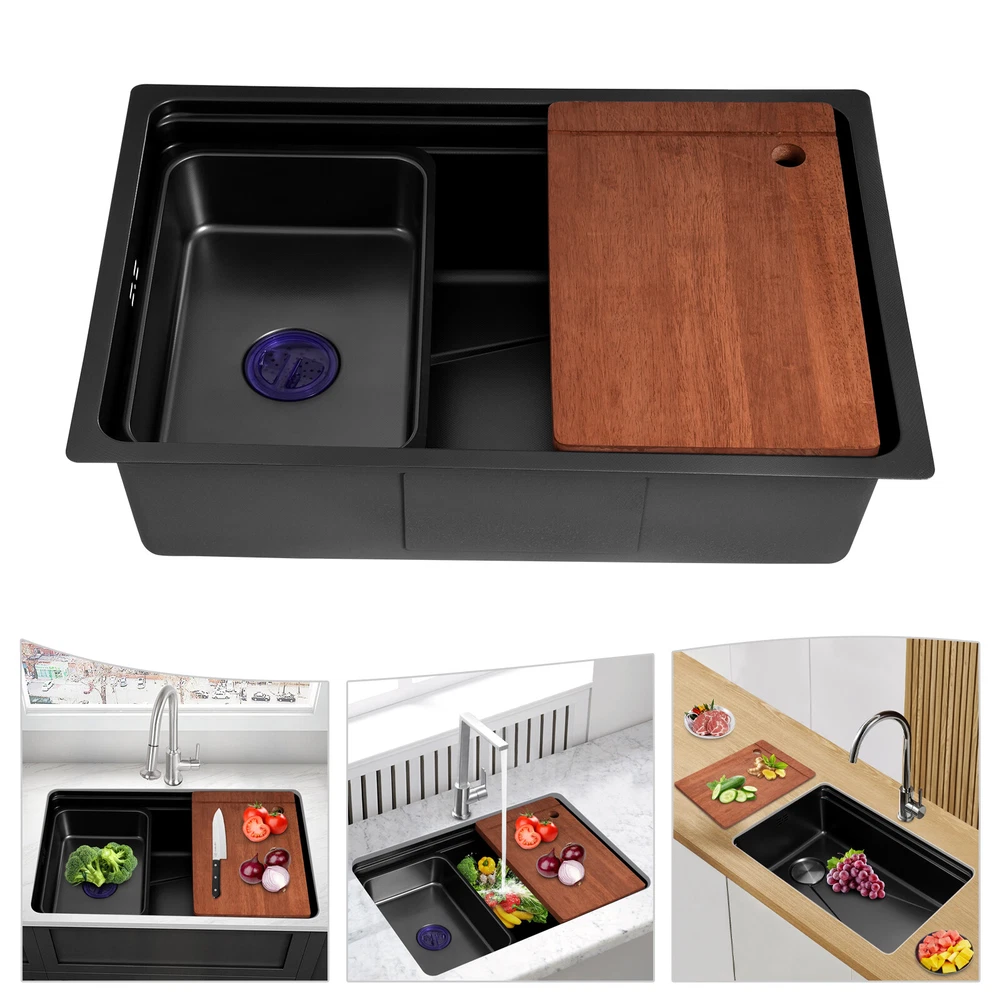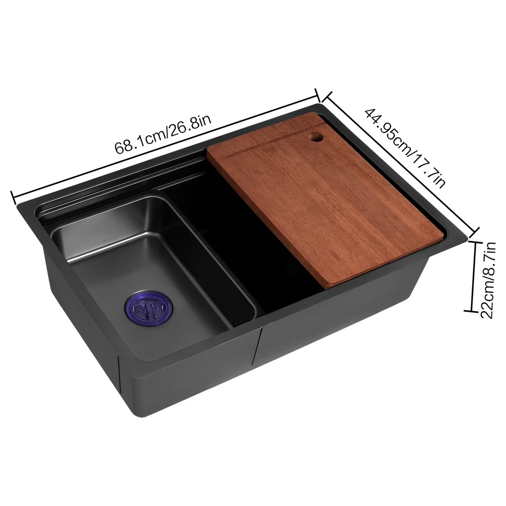 Application It can be suitable for quick use in commercial kitchens, but also widely used in homes, bathrooms, farms, backyards, garages, balconies, laundry rooms, indoor and outdoor, restaurants, bars, hotels, cafes, etc. It can be mounted either way above or below the counter top. Specification Style: Modern Color: Black Shape: Rectangular Drain Type: Grid Material: 304 Stainless Steel and Rubber Surface Treatment: One-piece Stretching Mounting Type: Above or Below the Counter Top Gross Weight: 10kg/22.05lbs Net Weight: 8.5kg/18.74 lbs Package Size: 73*52*27cm/28.74*20.47*10.63in Product Size: 68*45*22.1cm/26.8*17.7*8.7 in Package Included 1* Kitchen Sink 1* Chopping Board 2* Hoses 1* Inner Basin Other Accessories for Assembly Durable Kitchen Sink Double Basin Stainless Steel Sink Bowl W/ Chopping Board Welcome to our store~ Description What if there is not enough space in the kitchen sink? What do you do if the sink is always clogged and can't be cleaned all the time? Then I suggest taking a look at our kitchen sink with excellent material and easy cleaning features, which can easily solve the above problems and help you to create a more tidy kitchen. Key Features Last and Durable: Made of 304 stainless steel with a one-piece stretching process, it is not easy to fade, and can resist wear, corrosion, rust, impact, and deformation, so it can keep beautiful and practical indoors and outdoors . Thoughtful Design: The sloped bottom with a large drainage hole and V-shaped flow line allows water to flow to the drain promptly so that water does not accumulate at the bottom of the basin. In addition, the sound-absorbing rubber mat can effectively reduce the impact of water flow as well as reduce noise. The environmentally-friendly anti-vapour condensation spraying at the bottom prevents dripping and condensation, keeps the sink dry and avoids the deformation of the cabinet by moisture. Kitchen Assistant: Our product comes with a chopping board with a round hole for easy chopping; in addition, the removable inner basin makes it easy for you to clean your veggies, fruits, and more. The inner basin with a drain can be drained directly, which is convenient for you to use. Large Capacity: A large and deep (8.7-inch) sink provides enough space for cleaning, storage, and preparation for your daily use. Space Saving: The compact size (26.8*17.7*8.7 inches) and under-counter installation feature can save your kitchen counter space, creating a more convenient kitchen environment for you. Easy to Clean: Thanks to its smooth surface and simple construction, you can rinse and wipe with water at the same time, thus making it easy to clean. The R-shaped round corner of the basin eliminates the dead corner of dirt accumulation for easy cleaning. Complete Accessories: The combination of sink, hoses, chopping board, etc. can meet your various needs at once and also save you money. Quality Service: We stand behind all our guests and look forward to assisting you with your purchase. It is our pleasure to answer your confusion and questions. The end of the story between us is definitely not "we sell and you buy" Details Practical Hoses: They can help with smoother drainage . Well-designed Overflow Holes: They allow you to say goodbye to water spills and keep your kitchen as clean as possible. Filter Basket and Lid: Filter basket intercepts food scraps for easy disposal and prevents clogging. The lid helps block odors. Double-step Design: It allows you to easily place chopping board and drying rack. Application It can be suitable for quick use in commercial kitchens, but also widely used in homes, bathrooms, farms, backyards, garages, balconies, laundry rooms, indoor and outdoor, restaurants, bars, hotels, cafes, etc. It can be mounted either way above or below the counter top. Specification Style: Modern Color: Black Shape: Rectangular Drain Type: Grid Material: 304 Stainless Steel and Rubber Surface Treatment: One-piece Stretching Mounting Type: Above or Below the Counter Top Gross Weight: 10kg/22.05lbs Net Weight: 8.5kg/18.74 lbs Package Size: 73*52*27cm/28.74*20.47*10.63in Product Size: 68*45*22.1cm/ 26.8*17.7*8.7 in Package Included 1* Kitchen Sink 1* Chopping Board 2* Hoses 1* Inner Basin Other Accessories for Assembly Notes Please measure the size of the sink in your home before purchase . Please note that this product does not include a faucet. Please allow the slight color difference caused by the shooting light and 1-3cm error due to manual measurement, and make sure you do not mind before ordering. Payment Delivery details Terms of sales About us Contact us Payment We accept ebay payment 。 Fees such as import duties, taxes are not included in the item price or shipping costs. These charges are the buyer's responsibility. Delivery details Shipping: 2-9 working days to: USA Terms of sales We maintain high standards of excellence and strive for hundred percent customer satisfaction. Feedback is very important to us. We hope that you contact us immediately before you give neutral or negative feedback, so that we can address your concerns. It is impossible to address issues if we do not know about them! About us Your satis faction is our ultimate goal. We work hard to earn your trust and future business. Our certified technicians have tested each item before shipping. The unit comes with 1 year limited warranty on all manufacturing defects. a) If you receive a defective item, you may return it or ask for a discount. Please contact us within 14 days after you receive the package. b) What you returned must be intact and in its original packaging as re? u. Customer is responsible for shipping costs of the returned item. c) We will cover the cost of shipping back t with the shipping rate indicated in the registration page. We will send you a new unit or refund the full payment you paid. Thank you. Contact us Business Hour Business Hour: Monday To Friday: 8:30 AM to 5:00 PM (Beijing China time) Due to time zone