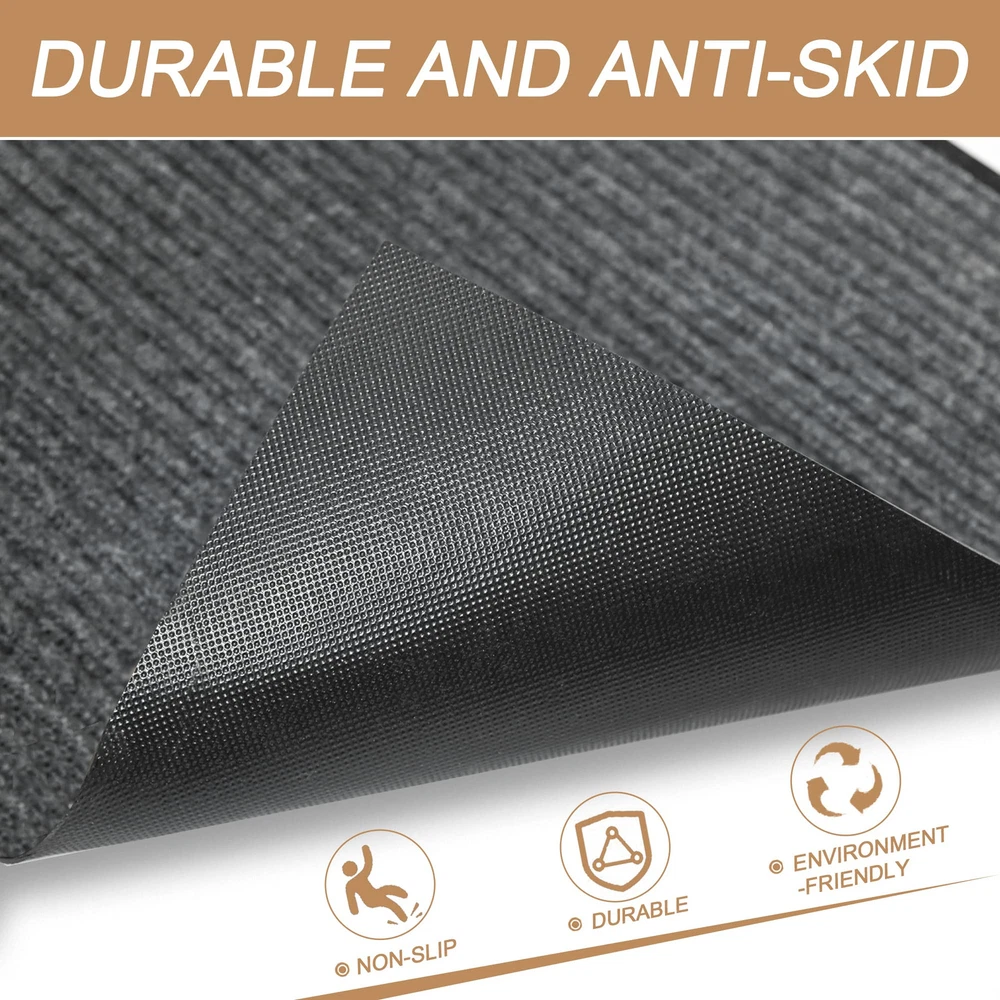 Deep grooves capture mud and moisture: This entrance mat is designed with a raised ribbed surface to help capture mud, dirt, moisture and debris deep within its grooves. Perfect for those rainy and muddy days. No Dirt Comes Home. Waterproof and easy to maintain: Ultra absorbent and easy to clean. Vaccum, sweep or shake to remove most of the dirt. For deeper clean, wipe with a damp cloth and mild soap, or you can use a garden hose to rinse the outdoor door mat. Do not use bleach and keep the entryway rug fully air dry before next use. Low profile easily clears doors: The outdoor mats for home entrance features 1/4" thick low-profile which is ideal for even low-clearing doors to pass over with ease. Non-Slip Bottom: The door mat indoor outdoor entrance rug is made of premium polyester and textured PVC rubber backing which keeps the floor mat stays in place and prevents moisture leaks. The thick and plush topside is gentle on bare feet, but durable for boots. Various uses Floor Mat: Front door, back door, entryway, front porch, driveway, garage, patio, hall, basement, mudroom, laundry, kitchen or other high traffic areas. Perfect for keeping your floors clean. We advise customers to measure your area before purchasing. This doormat is apx. 72" x 24".